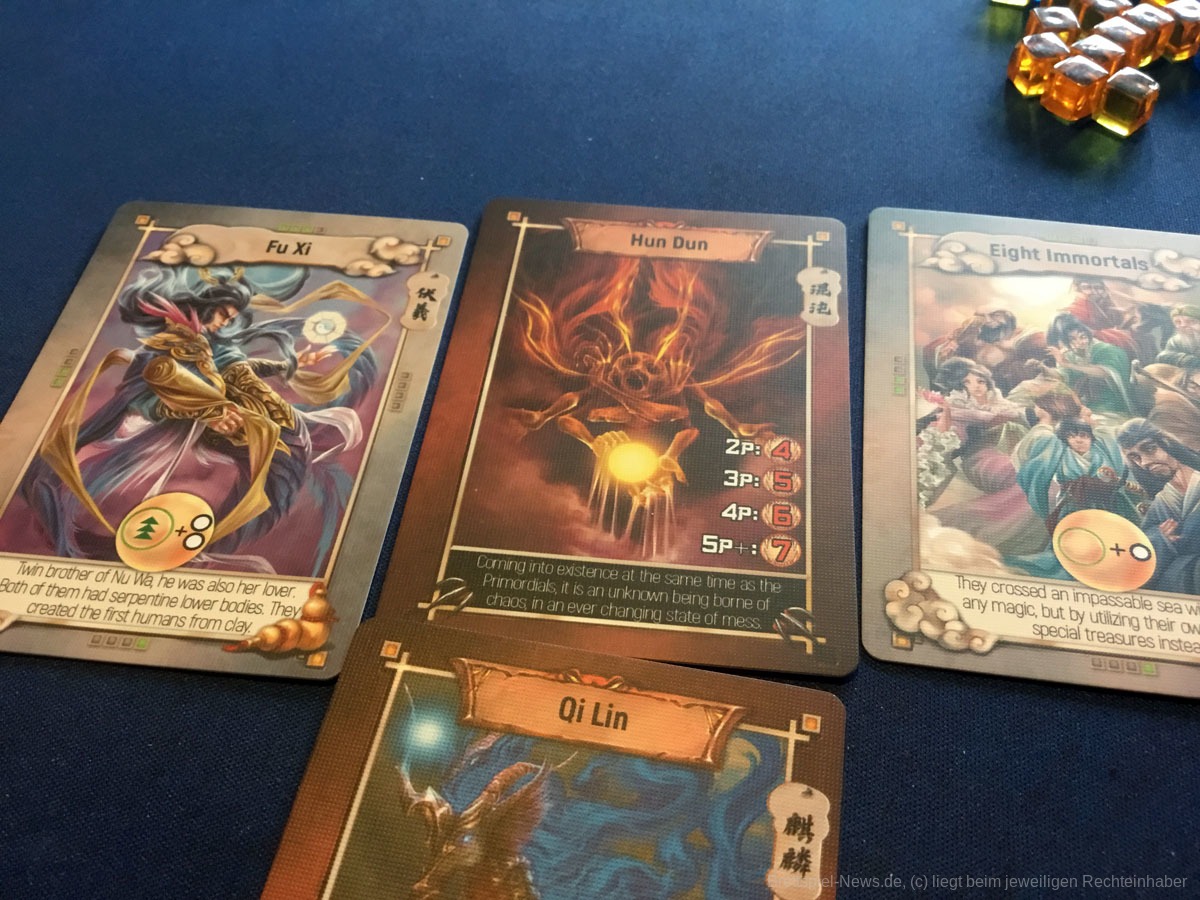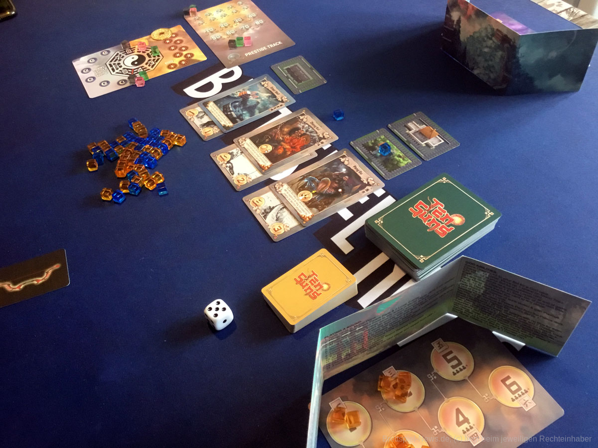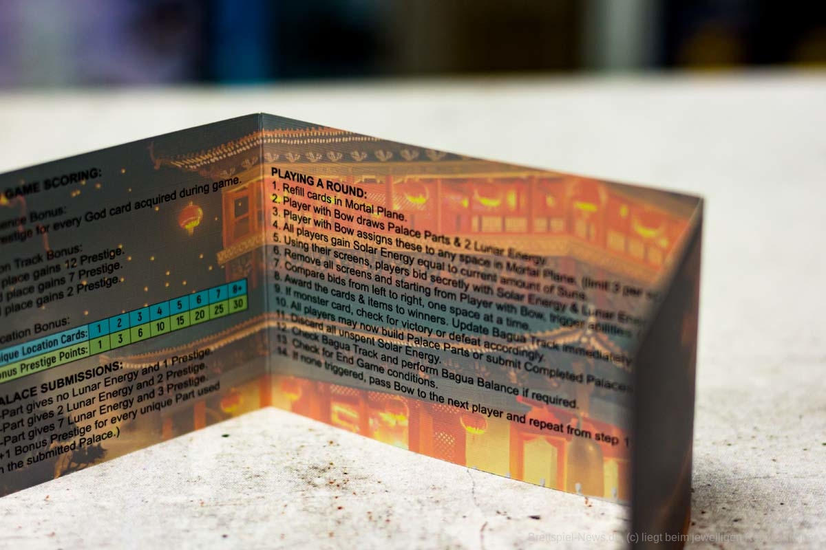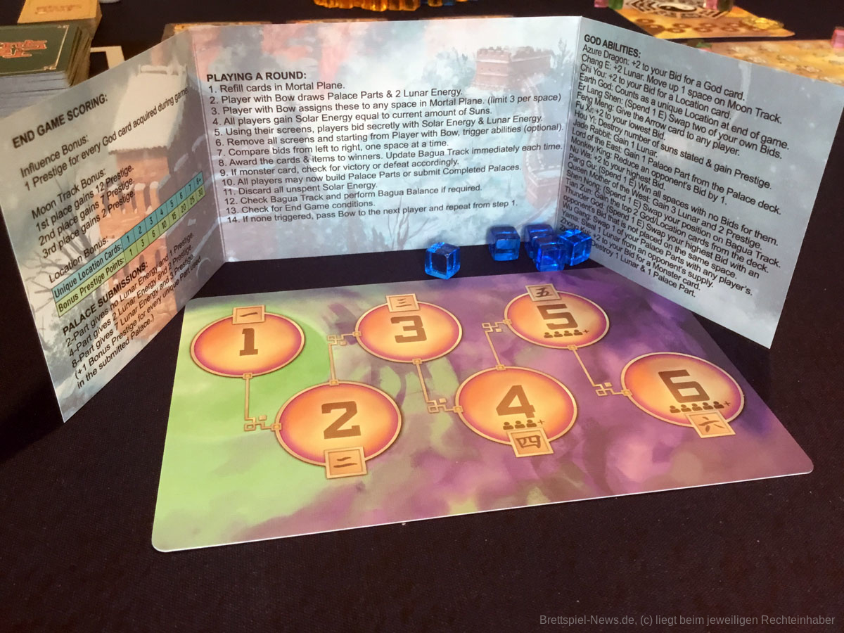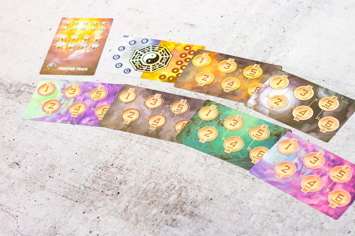 Den Schachtelinhalt bildet ein Stapel aus Götterkarten in guter Qualität mit ansprechenden Illustrationen, kleinere Palastkarten, sowie genügend Sichtschirme und Bietkarten für bis zu sechs Personen. Pro Spieler:in gibt es vier Plastikwürfel in besonderen Farben für die Prestigepunkte, die Mond- und Bagua-Leiste. Mond- und Sonnenenergiewürfel sind reichlich vorhanden und qualitativ in Ordnung. Alle Texte sind in Englisch gehalten.