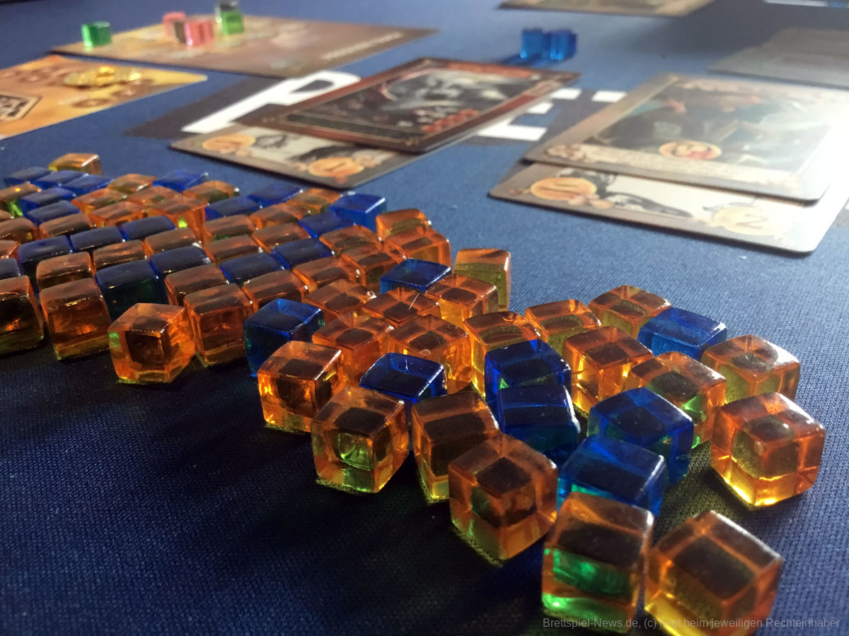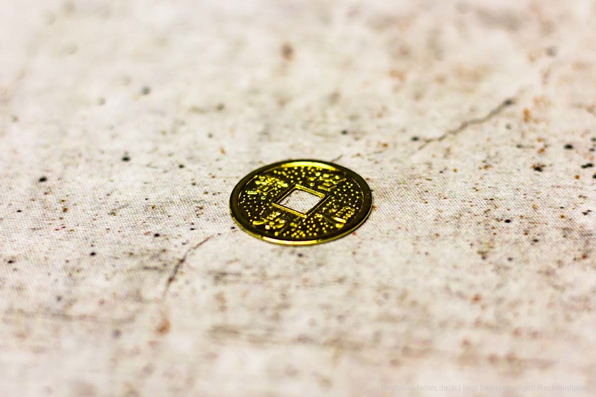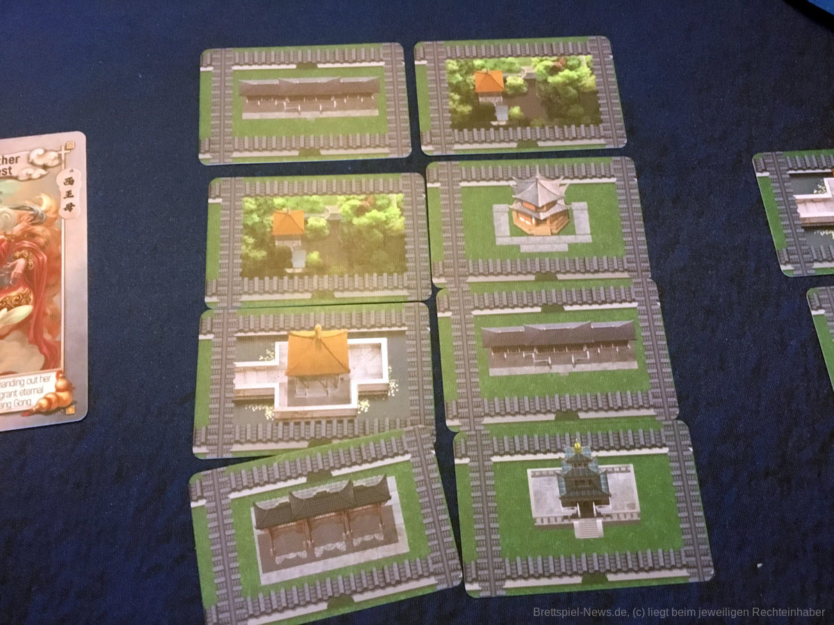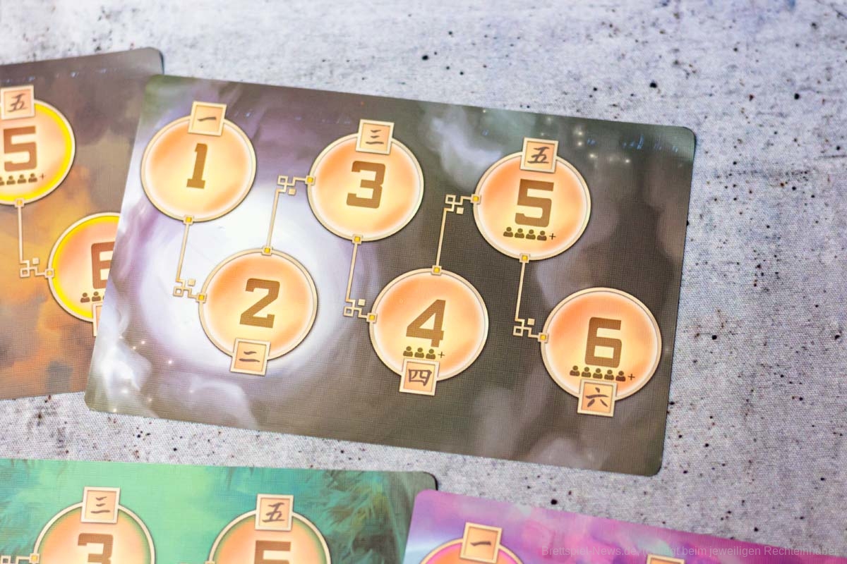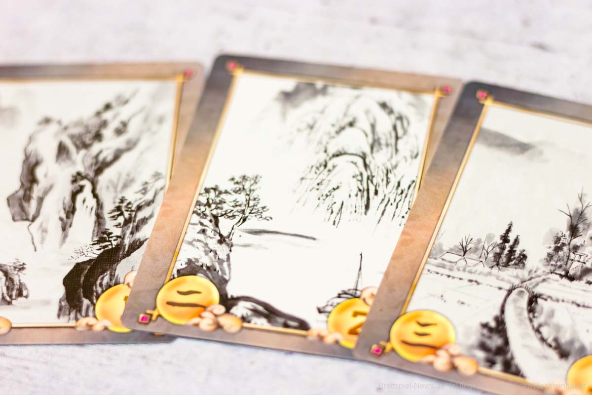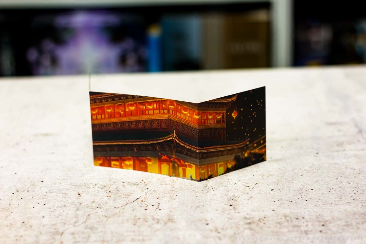 Den Schachtelinhalt bildet ein Stapel aus Götterkarten in guter Qualität mit ansprechenden Illustrationen, kleinere Palastkarten, sowie genügend Sichtschirme und Bietkarten für bis zu sechs Personen. Pro Spieler:in gibt es vier Plastikwürfel in besonderen Farben für die Prestigepunkte, die Mond- und Bagua-Leiste. Mond- und Sonnenenergiewürfel sind reichlich vorhanden und qualitativ in Ordnung. Alle Texte sind in Englisch gehalten.