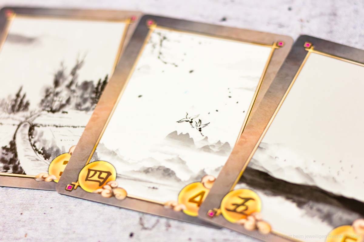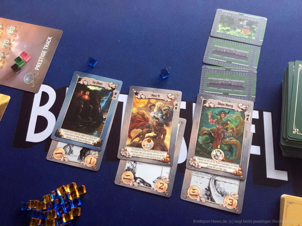 Im Laufe des Spiels werden auch die neun Heldenkarten des Hou Yi in der Auslage auftauchen und ersteigert werden. Mit jeder Heldenkarte werden Sonnen vom Himmel geschossen. So reduziert sich in jeder Runde die Sonnennergie, die den Spieler:innen für ihre Gebote zur Verfügung steht. Mondenergie wird dadurch immer wertvoller und der Countdown läuft also gnadenlos ab. Stehen nur noch eine oder keine Sonne mehr am Himmel endet die Partie. Die meisten Prestigepunkte entscheiden über den Sieg.