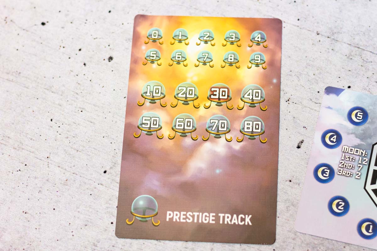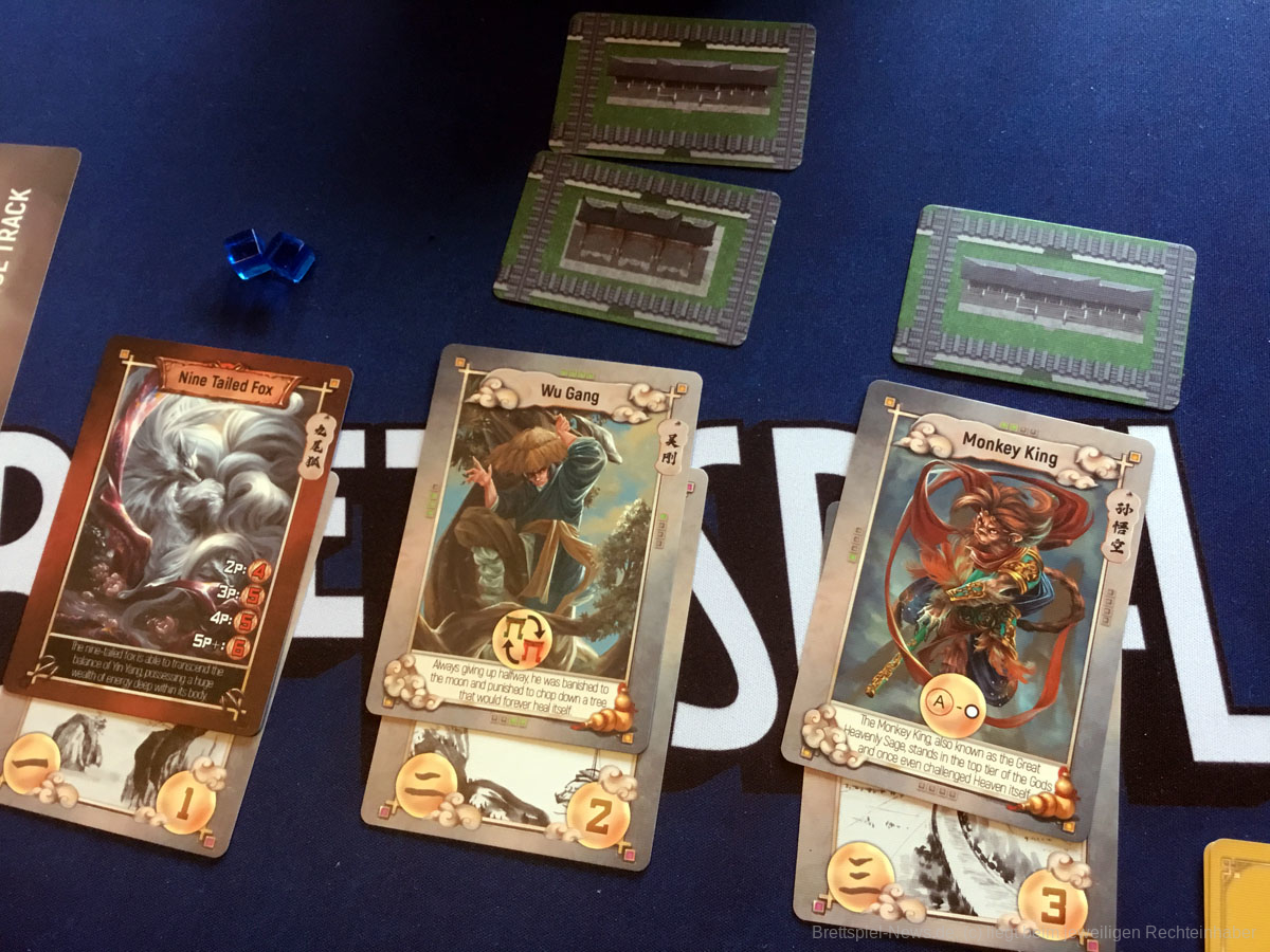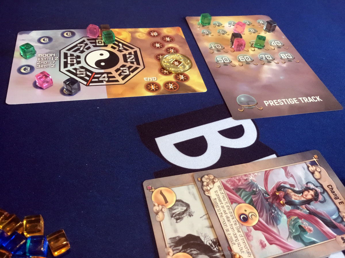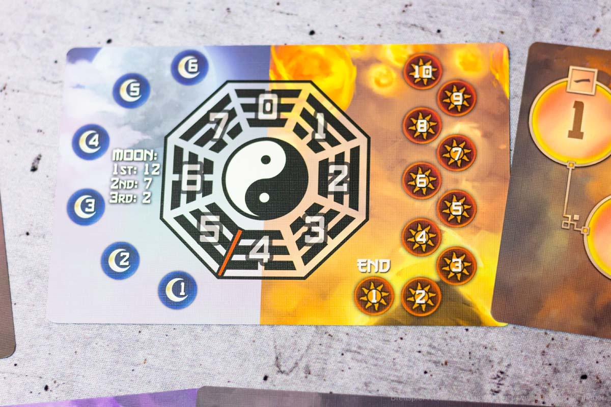Für jede ersteigerte Götterkarte wird der entsprechende Spieler:innenmarker auf der Bagua-Leiste vor bewegt. Überschreitet ein Marker die vierte Stufe, erhält die oder der Letztplatzierte auf der Leiste einen Bonus aus Mondenergie. Dann werden alle Marker zurückgesetzt. Auf der Mondleiste schreiten die Spieler:innen durch Karten der Mondgöttin voran. Diese Leiste wird nicht zurückgesetzt. Erstplatzierte dieser Leiste erhalten ebenfalls einen Energieschub, wenn die Bagua-Leiste zurückgesetzt wird.
