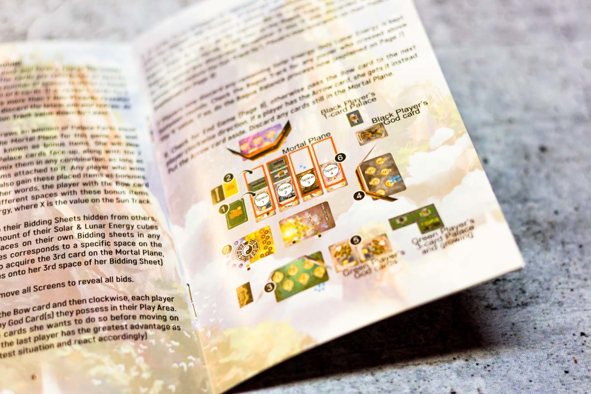 Die Anleitung ist klein, kurz und erläutert die Kernelemente ausreichend. Auch sie ist nur auf Englisch enthalten. Ausführliche Beispiele und ein erläuternder Anhang für die diversen Götterfähigkeiten sind nicht enthalten. Einige kurze Sätze finden sich dazu auf den Innenseiten der Sichtschirme. Eine solitär spielbare Variante bildet den Abschluss der Anleitung.