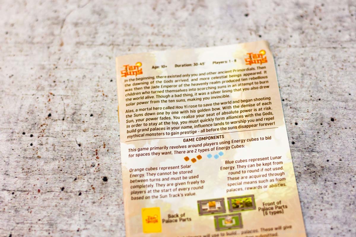 Bei TEN SUNS handelt es sich um ein Auktionsspiel für Familien in kleiner Schachtel. Die Währung des Spiels besteht aus Mond- und Sonnenenergiewürfeln. Durch die zehn Sonnen gibt es mehr als genug Sonnenenergie und eben diese verwenden die Spieler:innen in den Auktionen um Götterkarten zu ersteigern. Es wird verdeckt geboten und das höchste Gebot gewinnt.