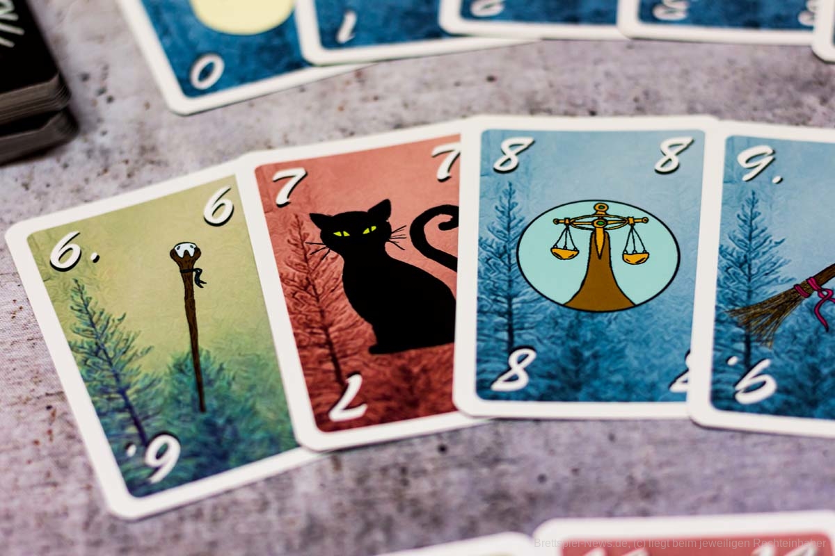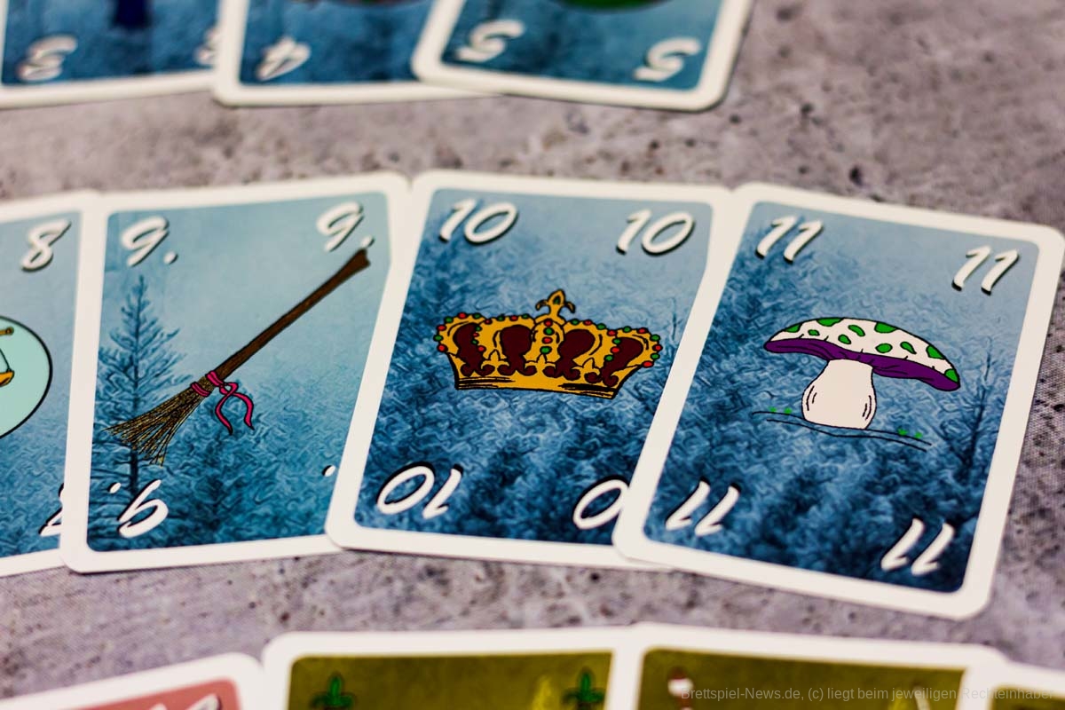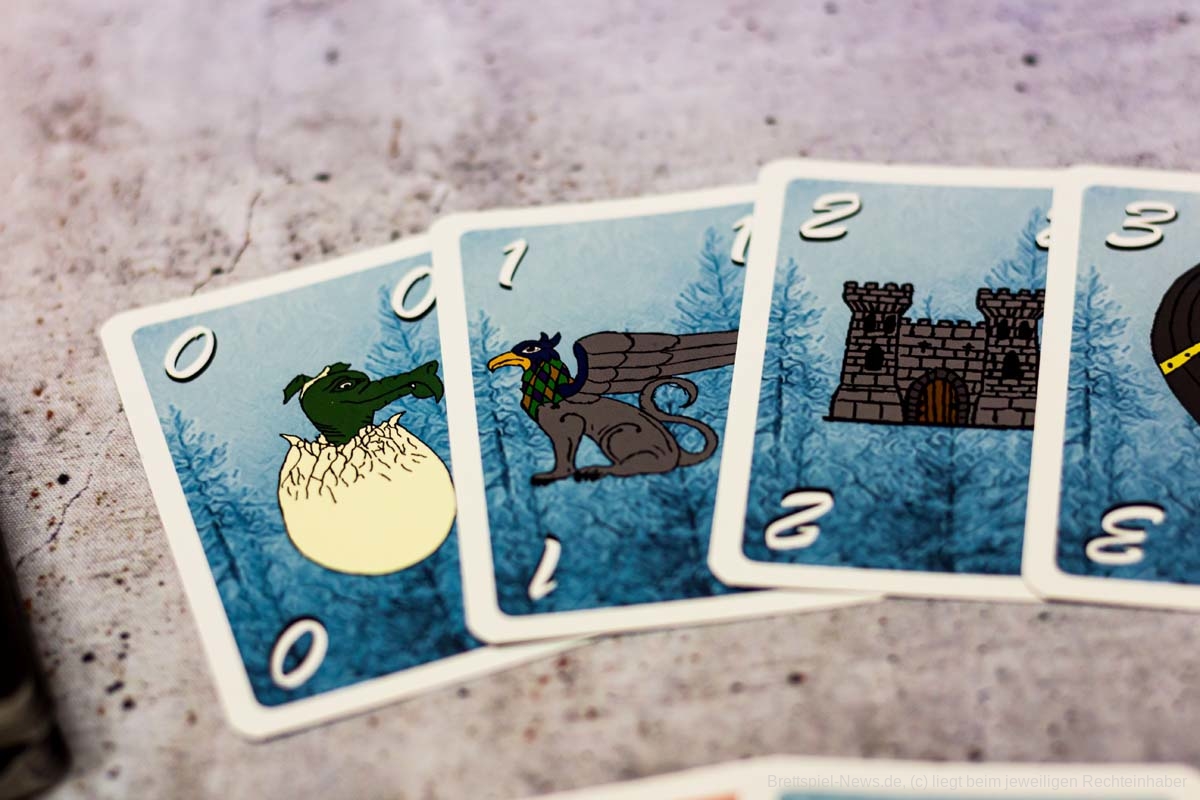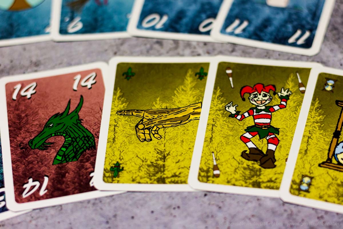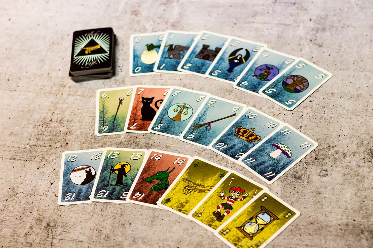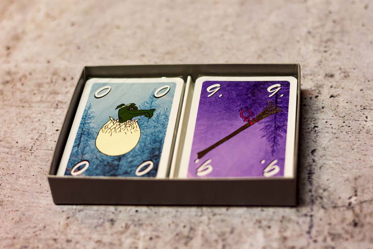 Was uns gut gefallen hat, ist der Endmechanismus. Es geht nicht darum, wer zuerst alle Karten los ist, sondern wer die wenigsten Punkte hat. Da es auch Karten mit dem Wert 0 gibt, kann es schnell passieren, dass jemand Sieges-sicher mit nur einer Karte auf der Hand GLÜCKSGRIFF ruft, weil alle anderen Spielenden deutlich mehr besitzen, diese dann aber sogar weniger Punkte besitzen.