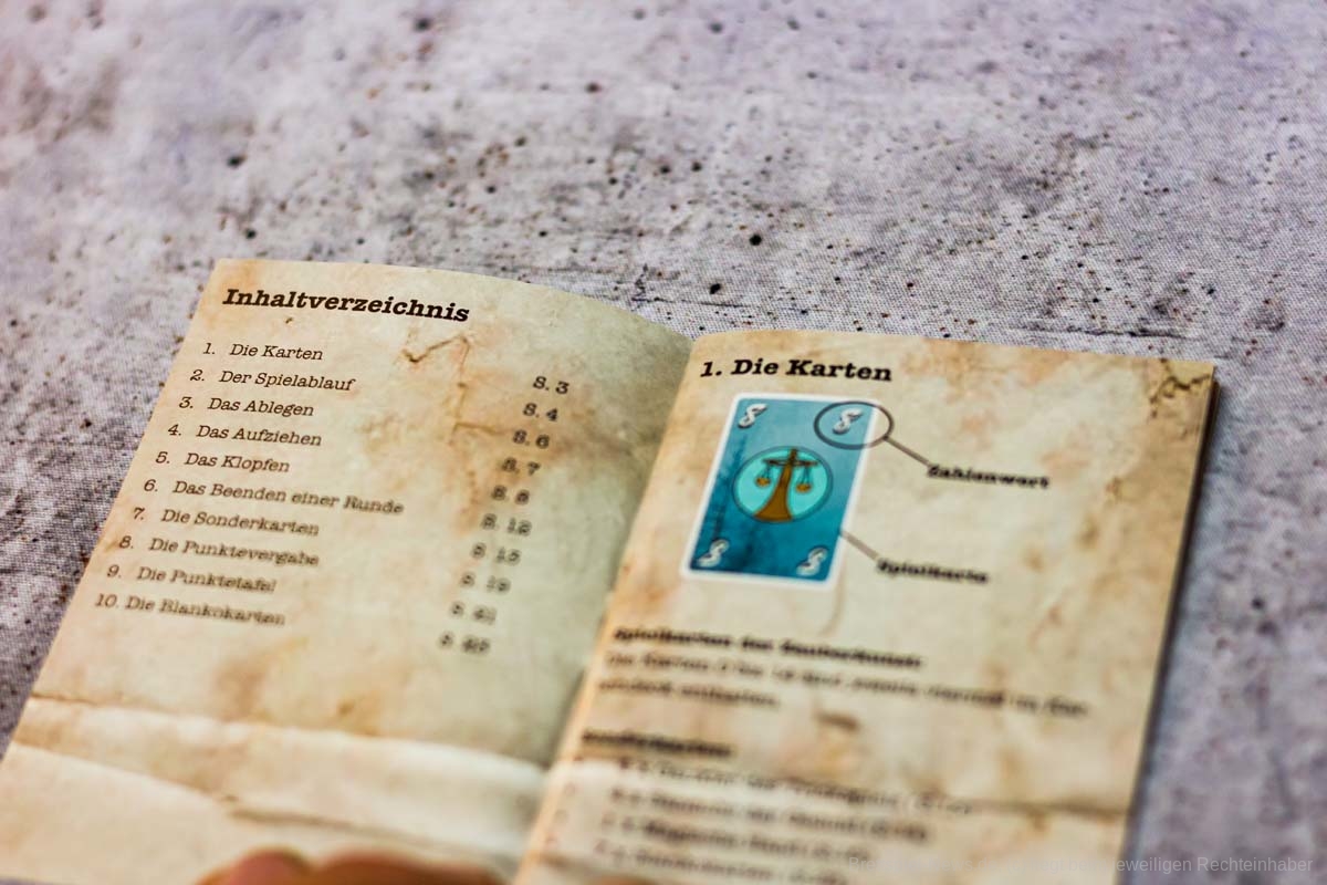 Das Spielmaterial ist einer kleinen kompakten Schachtel untergebracht und umfasst 60 Spielkarten in guter Qualität, 9 Sonderkarten, 7 Blankokarten, 1 Regelwerk und 1 Punkteblock.