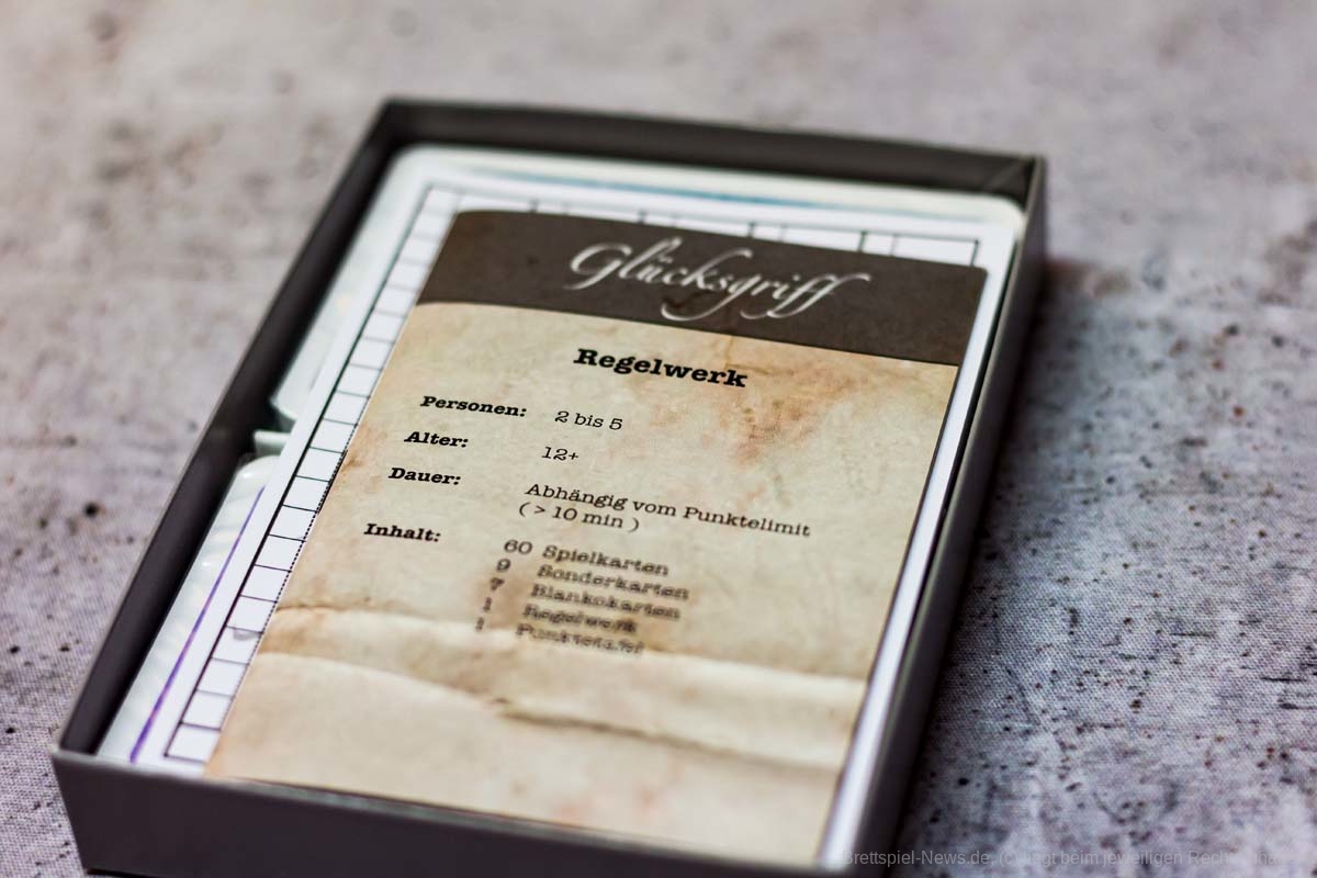 „GLÜCKSGRIFF“ schallt es durch den Raum. Schnell werden die Punkte gezählt und direkt ein „nochmal“ hinterhergeschoben. Wem gelingt es am schnellsten die Karten loszuwerden, um am Ende die wenigsten Punkte auf der Hand zu haben? GLÜCKSGRIFF ist ein kurzweiliges Kartenspiel für 2 bis 5 Personen.