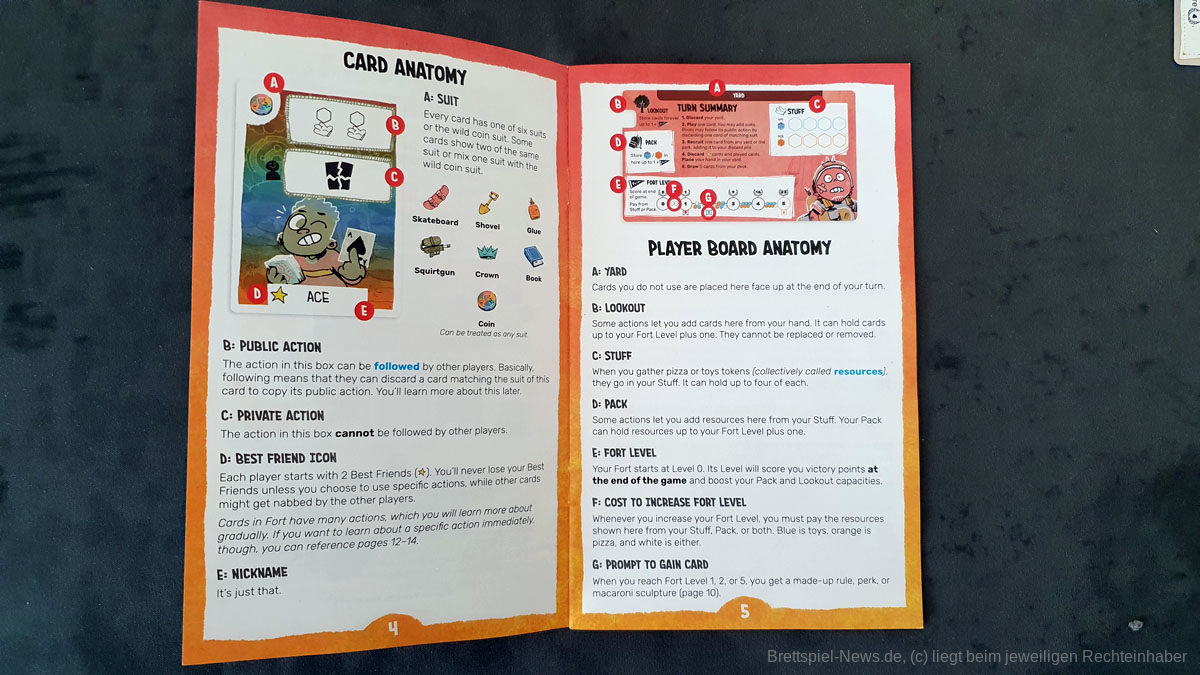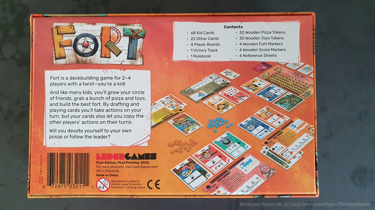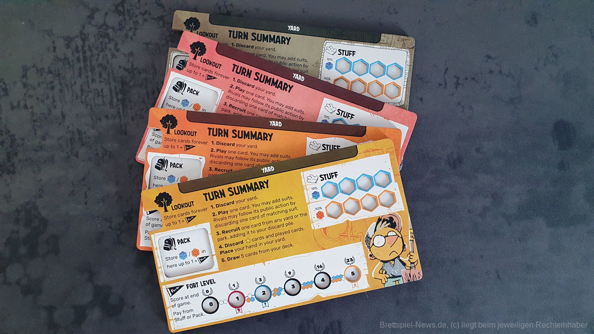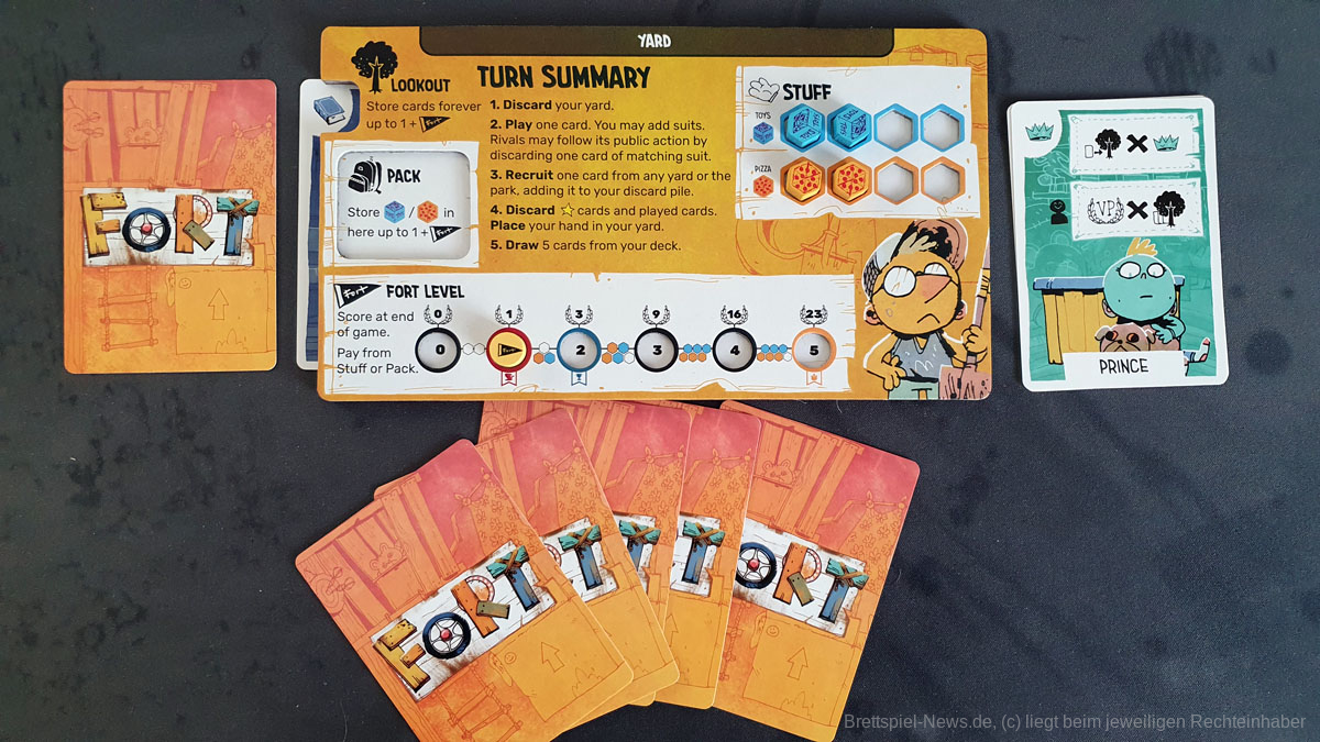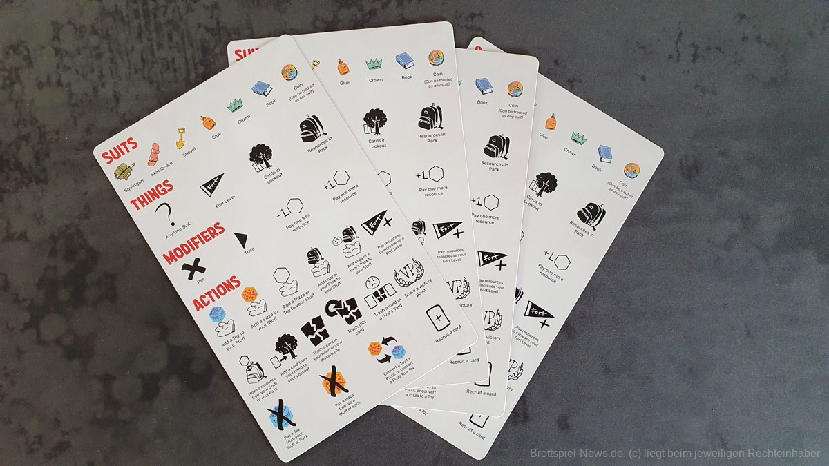 Das Material hat insgesamt eine sehr gute Qualität. Die Karten sind zwar etwas dünn, dafür enthält FORT ein Inlay, Doublelayer-Playerboards und für jede Person eine Übersichtskarte auf der alle Symbole erklärt werden, sodass sich ein sehr gutes Preis-Leistungs-Verhältnis ergibt. In Zeiten von immer knapper werdendem Platz in den Spieleregalen gefällt uns die sehr kompakte Spielschachtelgröße von FORT besonders gut.