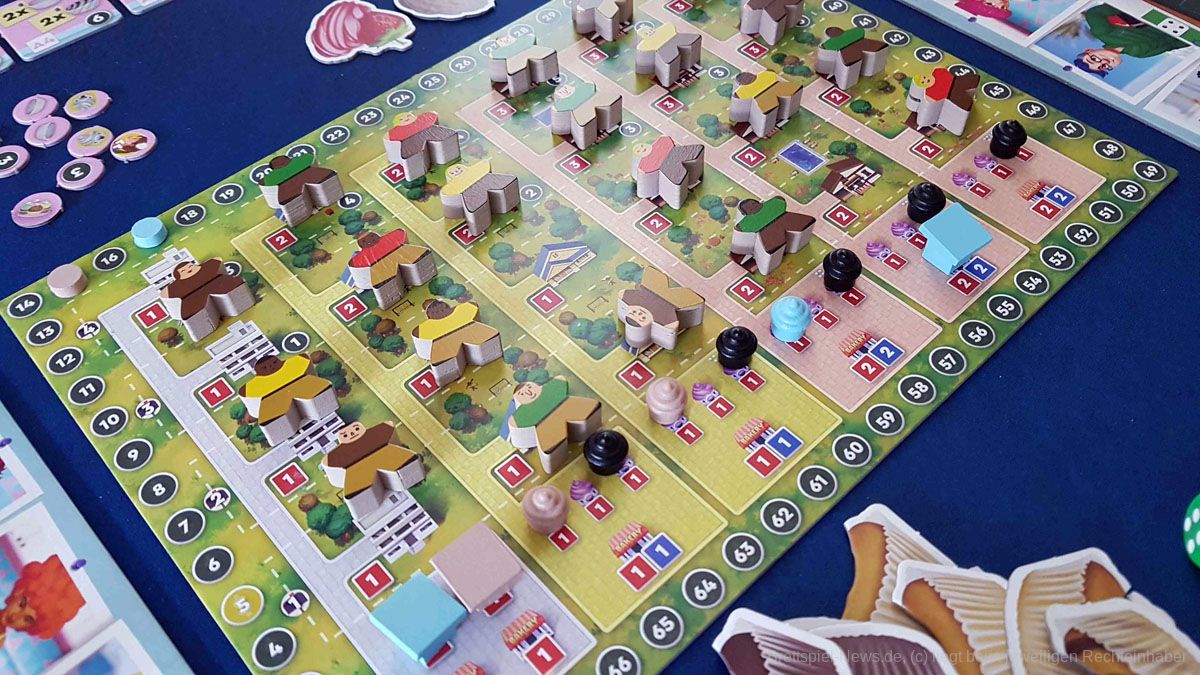 CUPCAKE EMPIRE bereitet mit jeder Personanzahl Spaß, funktioniert aber am besten mit drei oder vier Mitspieler:innen. Die Interaktion ist zumeist indirekter Natur. Geschadet werden kann anderen also durch das Wegschnappen von Plättchen oder Zielen. Lediglich das Verdrängen von Verkaufsständen stellt eine direkte Konfrontation dar, fällt aber meist nicht ins Gewicht, sodass der Frustrationsgrad niedrig ist. Durch den modularen Aufbau des Stadtplans ist zudem für ausreichend Wiederspielreiz gesorgt.