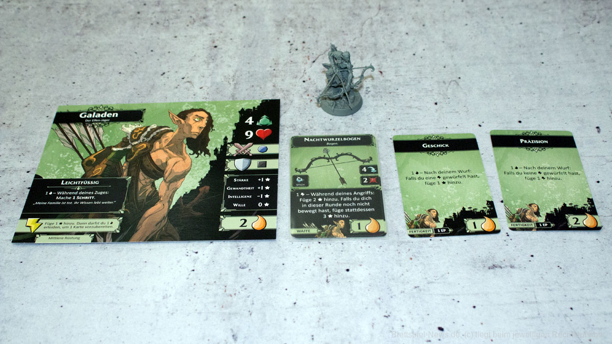Jeder Heldencharakter verfügt über ein zweiseitiges Tableau mit den Grundwerten und dem bei Kampf und Verteidigung zu verwendenden Würfeln. Zusätzlich bekommt jeder Charakter zwei Waffenkarten, die in einem Sleeve zusammengesteckt werden. Dadurch ergibt sich eine Angriffskarte, die bei den Kämpfen verwendet werden kann. Bei einem Angriff wird der zum Charakter gehörende Würfel gewürfelt und die Anzahl der Erfolge wird mit dem Schadenswert der aktuell genutzten Waffe multipliziert. Neben Erfolgen können noch Vorteile gewürfelt werden, die über das Platzieren von Erschöpfungsmarkern in Erfolge eingetauscht werden können und Energie, die für besondere Fähigkeiten verwendet wird. Hinzu kommen noch mögliche Boni. Wer Erschöpfungsmarker auf einer Angriffskarte platziert, kann dadurch meist weitere Zusatzeffekte aktiveren. Neben der Angriffskarte findet diese Mechanik auch Verwendung bei der Charakterkarte und den Fähigkeitskarten.