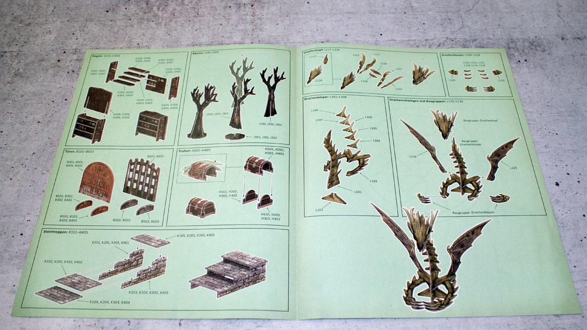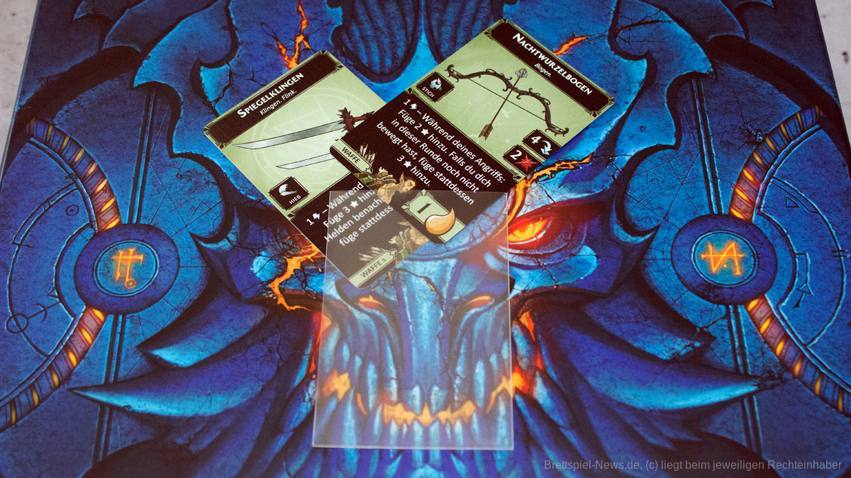 Beim Material muss einiges aus den 13 Stanzbögen gedrückt werden, die allesamt aus stabiler Pappe gefertigt sind. Die Bögen beinhalten neben Token und Spielplanteilen vor allem die 3D-Teile. Für den Zusammenbau der 3D-Teile gibt es eine separate, vierseitige Anleitung, in der jeder Schritt übersichtlich erklärt wird. Ein bisschen Geschick sollte ausreichen, um die Aufgabe einigermaßen schnell zu bewältigen. Die Truhen sind wegen ihren Rundungen sehr anfällig für Schäden. Die Miniaturen wurden sehr fantasievoll modelliert und zeigen einige feine Details. Die Karten im Spiel sind mit strapazierfähigem Leinenabschluss versehen.