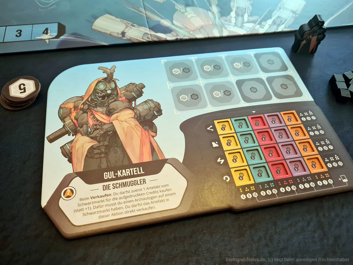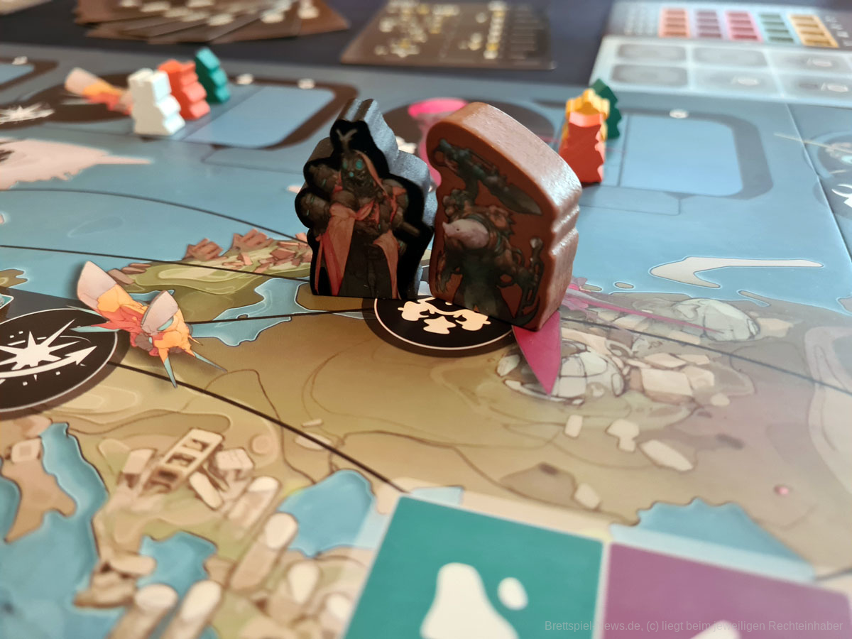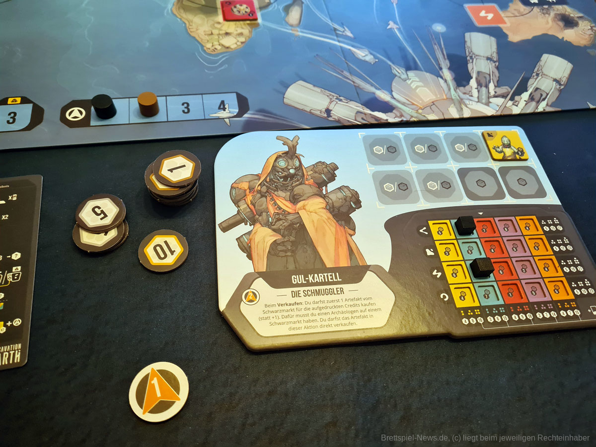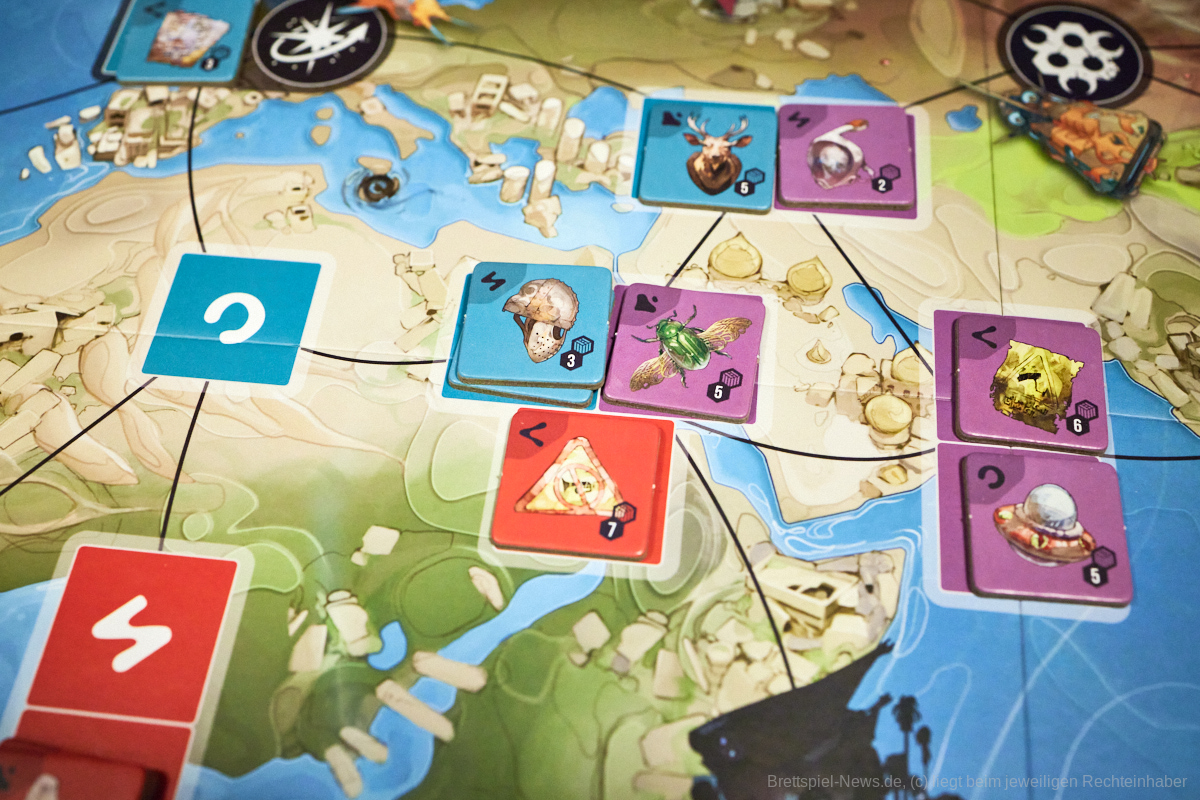 Thematisch ist das Spiel zum Beispiel absolut klasse gestaltet. Die Weltkarte ist in bestimmte Regionen unterteilt, die die Farben darstellen, wobei aus den Regionen regionsspezifische Artefakte geborgen werden und die Marktmanipulation, sowie die Darstellung der einzelnen Fraktionen mit ihren individuellen Fähigkeiten gliedern sich perfekt in den Spielfluss ein. Ein Highlight waren für mich die unterschiedlichen Illustrationen der unterschiedlichen Raumschiffe und Alienrassen im Spiel, die die Welt von EXCAVATION EARTH für mich besonders hervorhoben. Von seinem super Thema und dem schönen Äußeren sollten sich Spielgruppen dennoch nicht täuschen lassen.