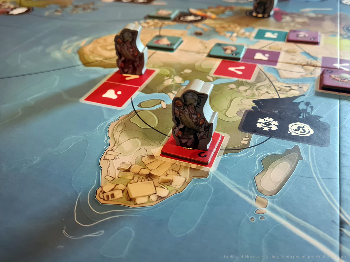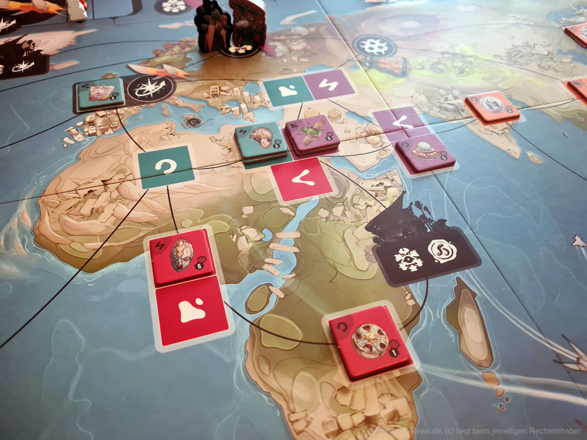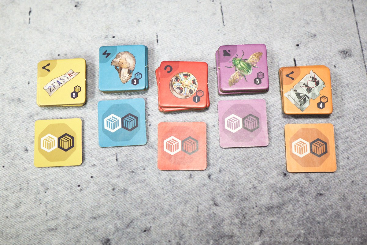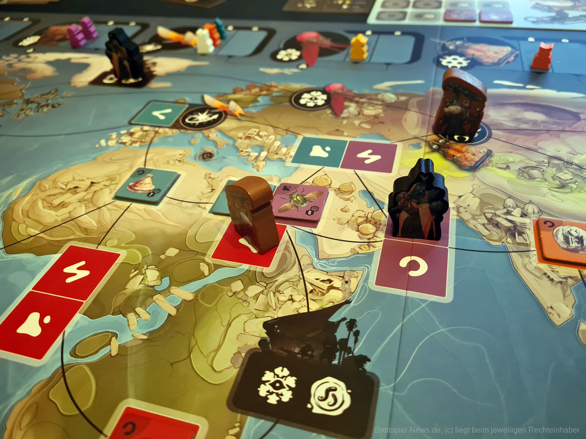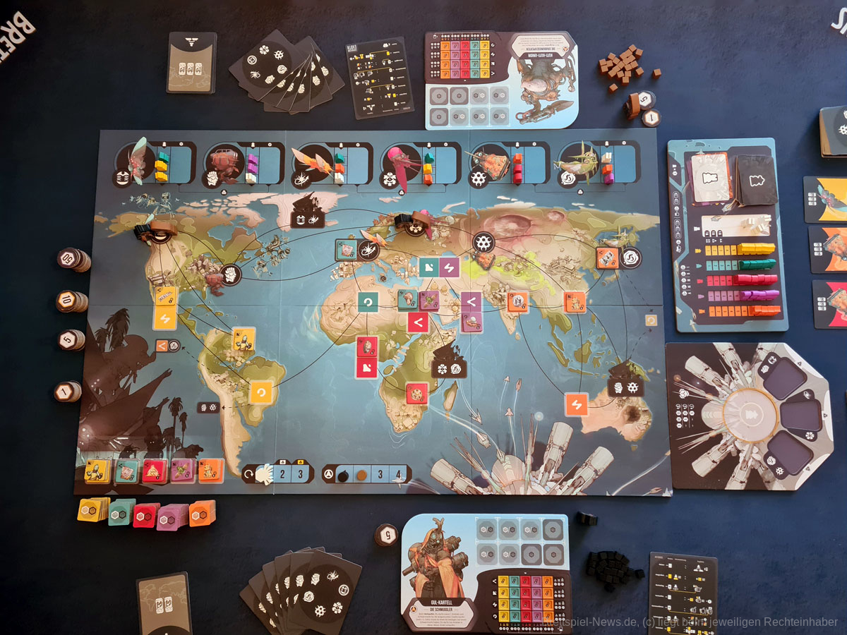 Thematisch ist das Spiel zum Beispiel absolut klasse gestaltet. Die Weltkarte ist in bestimmte Regionen unterteilt, die die Farben darstellen, wobei aus den Regionen regionsspezifische Artefakte geborgen werden und die Marktmanipulation, sowie die Darstellung der einzelnen Fraktionen mit ihren individuellen Fähigkeiten gliedern sich perfekt in den Spielfluss ein. Ein Highlight waren für mich die unterschiedlichen Illustrationen der unterschiedlichen Raumschiffe und Alienrassen im Spiel, die die Welt von EXCAVATION EARTH für mich besonders hervorhoben. Von seinem super Thema und dem schönen Äußeren sollten sich Spielgruppen dennoch nicht täuschen lassen.