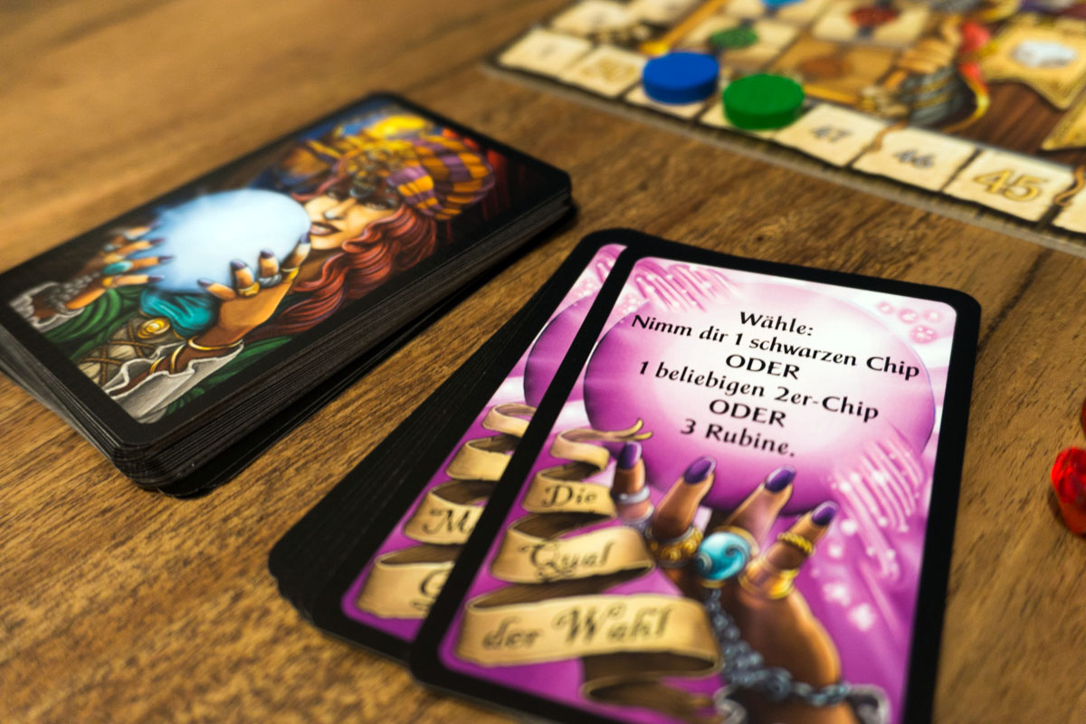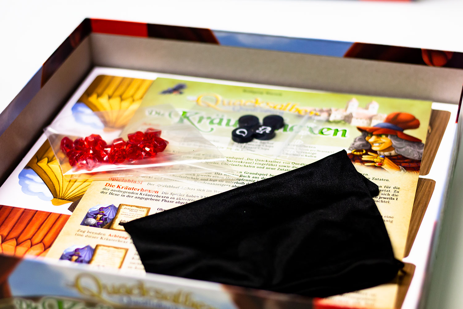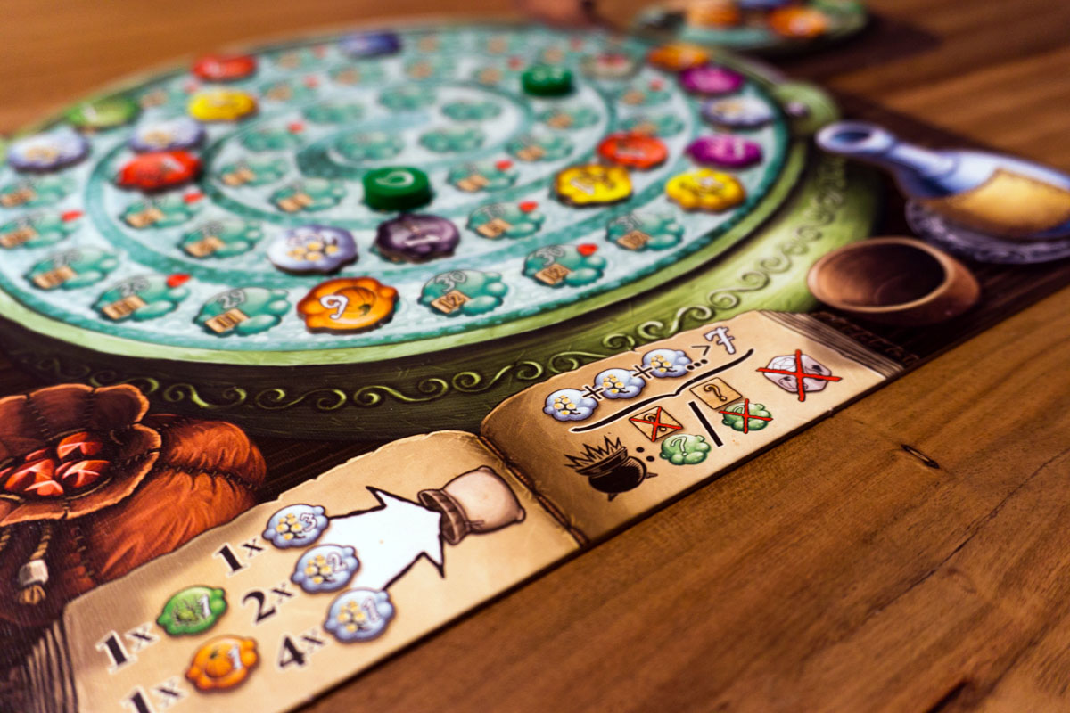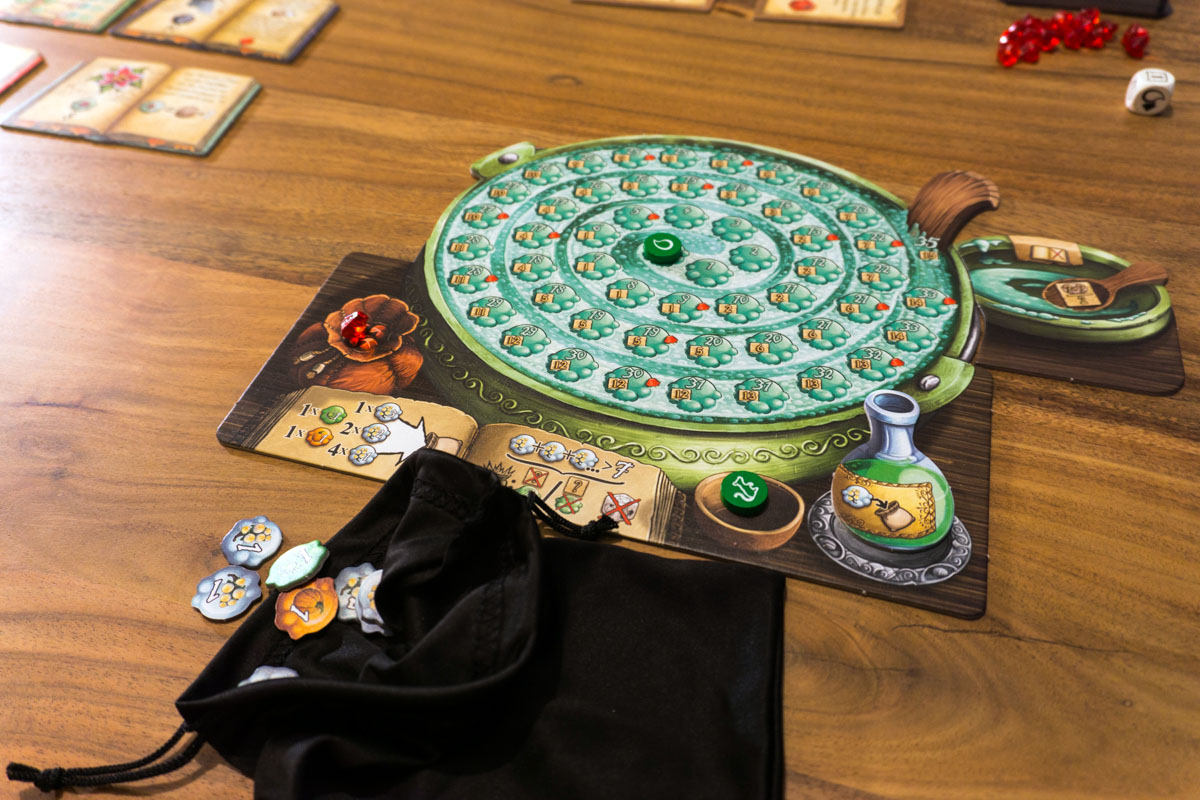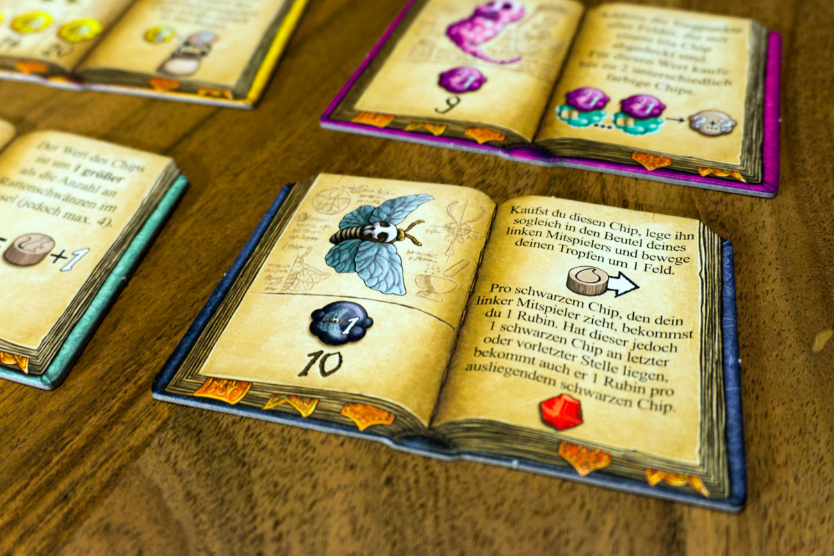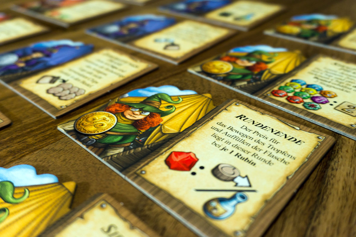 Grundaufbau sowie Spielablauf haben sich kaum verändert, daher ist die Anleitung sehr simpel und schnell durchgelesen. Wer die Grundregeln kennt, wird sich in diesem Teil schnell zurechtfinden. Das zentrale Element der Erweiterung sind die hilfreichen Kräuterhexen. Im richtigen Moment genutzt, können die verschiedenen Fähigkeiten einen großen Vorteil verschaffen. So ist es bei einer der Hexen möglich, den Tropfen für nur einen Rubin statt zwei Rubine weiterzuschieben. Dies kann zur richtigen Zeit spielentscheidend sein.