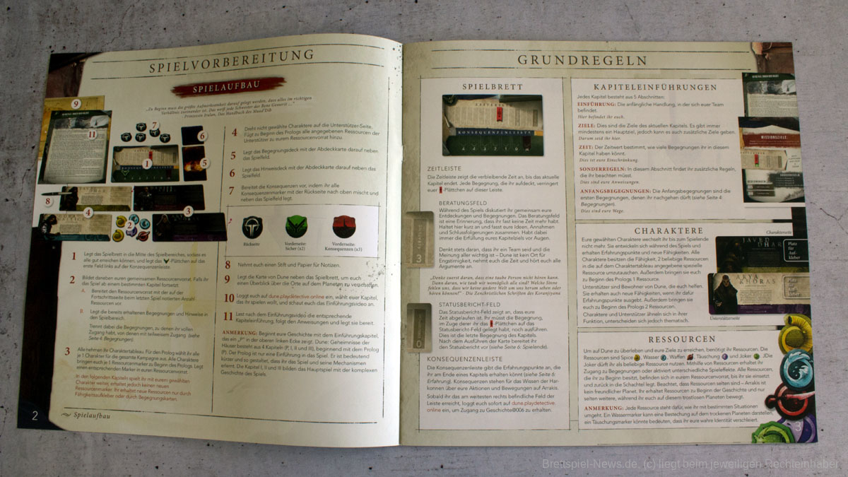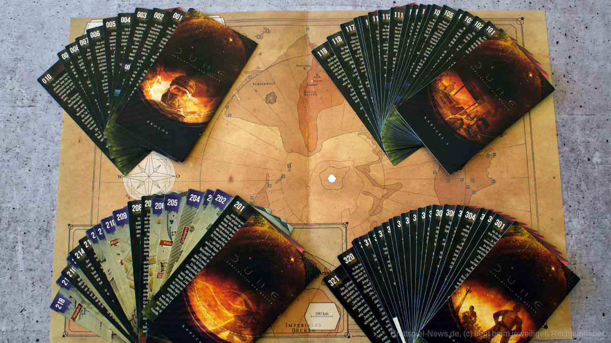 Der Karton ist sehr luftig gepackt. Den meisten Platz nimmt ein Plastikinlay ein, welches das wenige Material an Ort und Stelle ordnet. Das komplette Material hätte problemlos in einem Drittel der Box Platz gefunden. Die Begegnungskarten sind vereinzelt eng bedruckt, was bei manchen Personen zu Schwierigkeiten beim Lesen führen könnte. Weiterhin gibt es quadratische Hinweiskarten, die zusätzliche Informationen beinhalten. Es gibt zwei Gebietskarten aus etwas stärkerem Papier, je eine Zeit-, Konsequenz- und Siegpunktleiste aus festem Karton, vier Einführungen zu den Kapiteln aus Papier sowie vier Charakterboards aus festem Papier mit Glanzeffekt. Neben einer Reihe Karton-Marker gibt es noch zwei Plättchen aus Holz für Konsequenzen und Zeit.