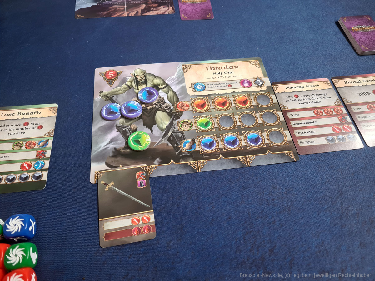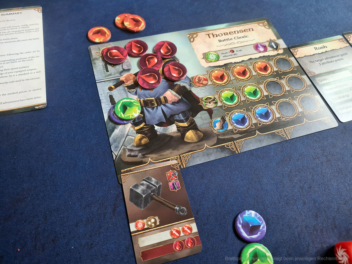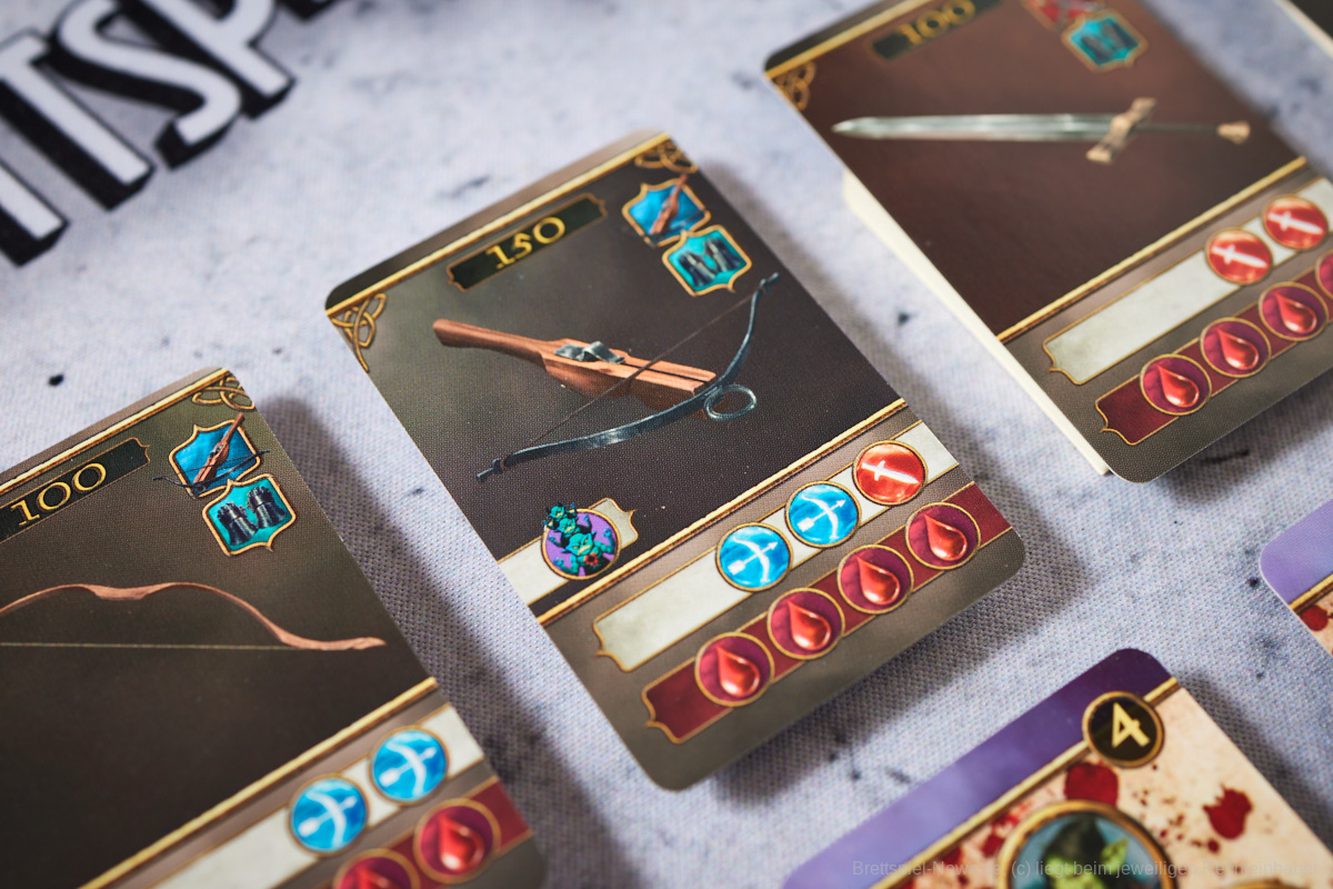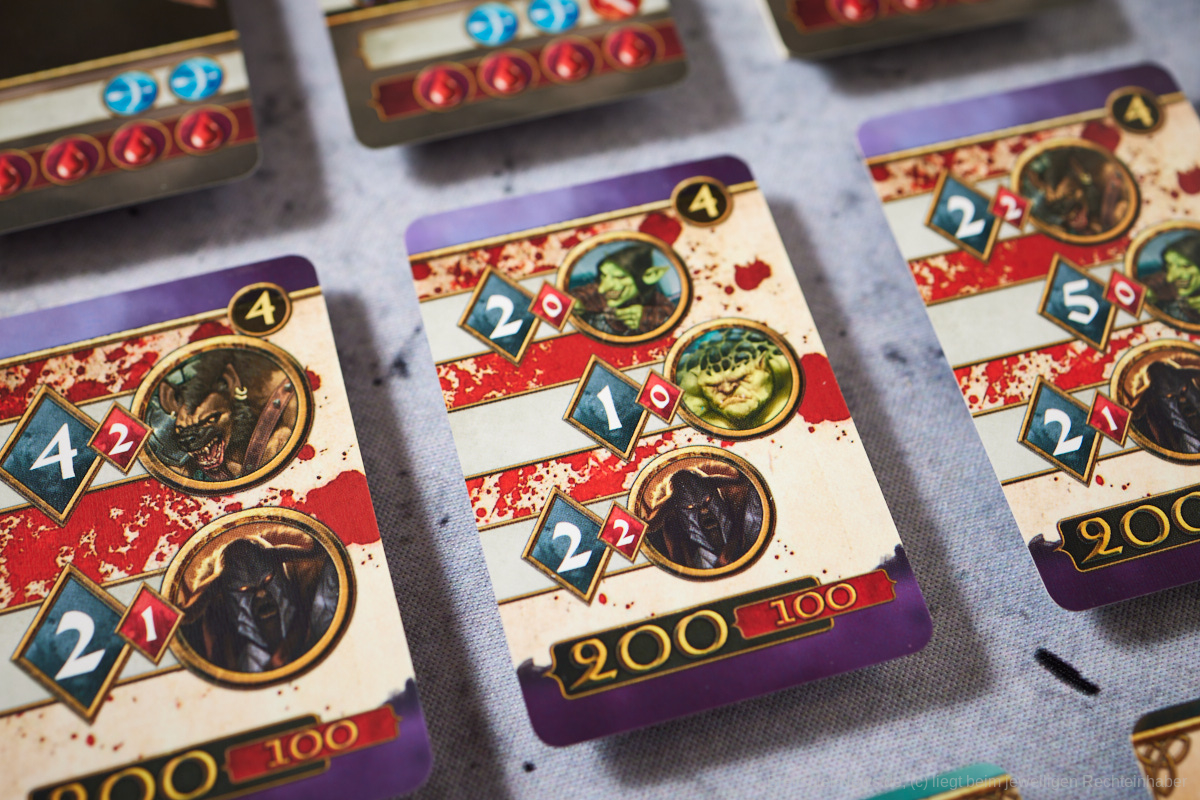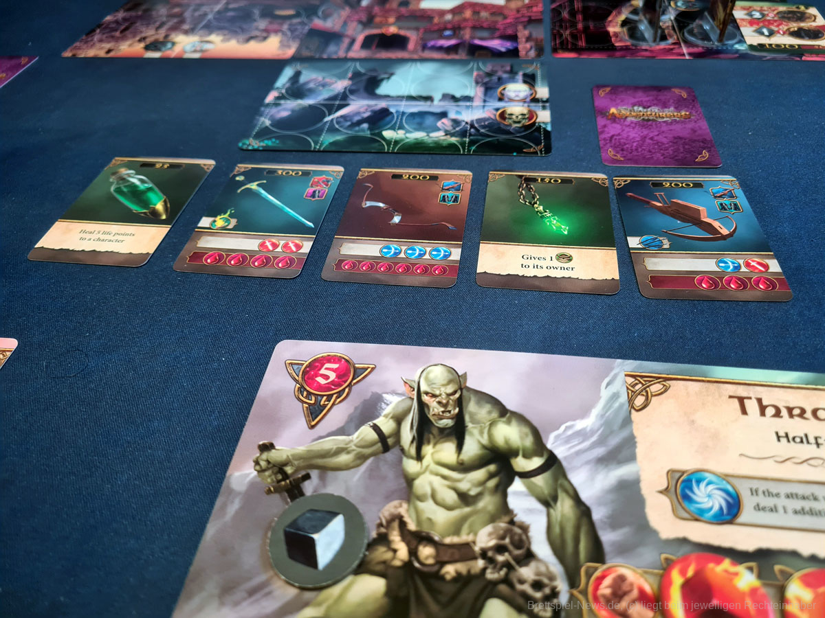 In meinen Spielrunden führte das dazu, dass ich einen Charakter steuerte, der durch sein großes Würfelpech nicht einen einzigen Treffer landen konnte, da immer wieder Erfolge fehlten. Das führte schnell zu Frust. Auch sind die Waffen und somit die Kraftsteigerung im Spiel nicht ganz ausgeglichen. Während es schon vorkam, dass wir im ersten Gefecht chancenlos niedergeknüppelt worden sind, ohne etwas dagegen machen zu können, folgten Spielrunden, bei denen wir das richtige legendäre Artefakt zur richtigen Zeit gezogen haben und mein Ork so ganze Räume mit nur einem einzigen Angriff leerfegen konnte. Generell sind alle legendären Artefakte beinahe absurd stark, sodass es schnell darauf hinausläuft, alle Kartenstapel der Artefakte zu kennen und zu analysieren, in welchem Stapel das jeweils richtige Artefakt für die Charaktere liegt.