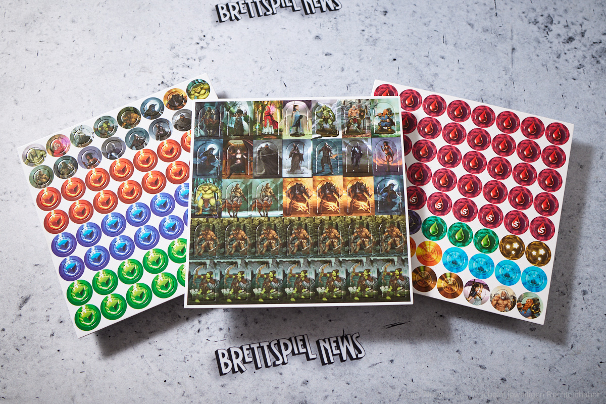 Die Spielschachtel von POA hält eine Vielzahl von Karten, kleinen Pappaufstellern (für Gegner und Charaktere) und -markern bereit. Während sich in der Deluxe Version des Spiels Miniaturen für alle Charaktere finden, besitzt unsere Variante besagte Pappaufsteller, die den Miniaturen aber in ihrer Funktion völlig ebenbürtig sind. Qualitativ ist das gesamte Spielmaterial sehr hochwertig. Die Aufsteller lassen sich sehr gut und rückstandslos in die kleinen Standfüße stecken, die Materialien aus Pappe sind ausreichend dick, um viele Spielabende problemlos zu überstehen und alle Würfel sind gut genug verarbeitet, damit alle Symbole problemlos auch von einer weiter entfernten Position zu erkennen sind. Ein besonderes Augenmerk lag in der Produktion offensichtlich auf dem Artwork. Sowohl Gegenstandskarten, Charaktere und Raumkarten sind alle gleichermaßen detailliert und farbenfroh gestaltet, was einen angenehmen Blick in die Welt von POA ermöglicht.