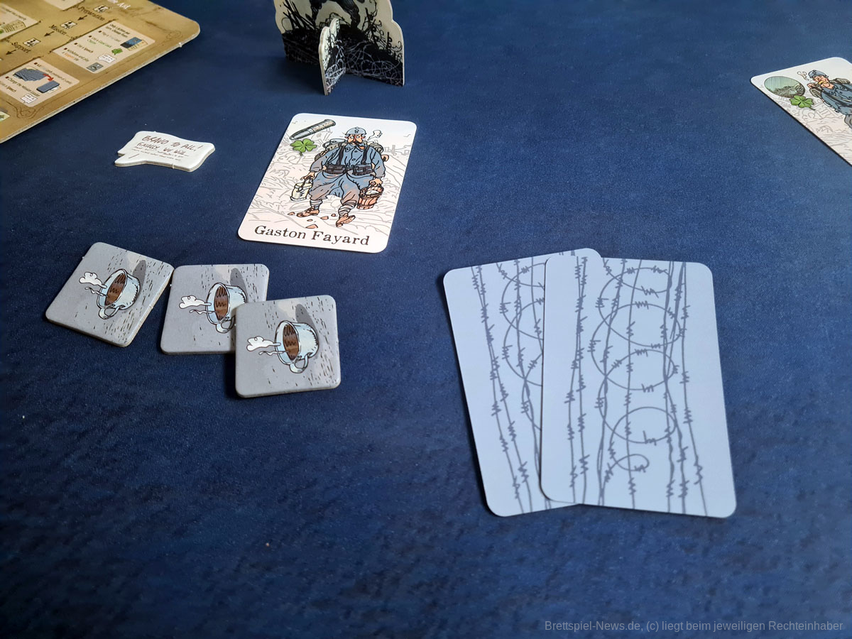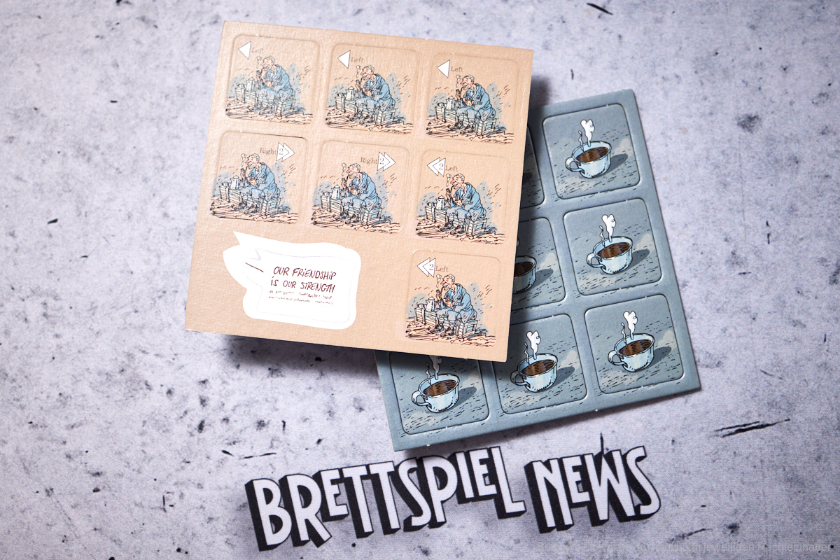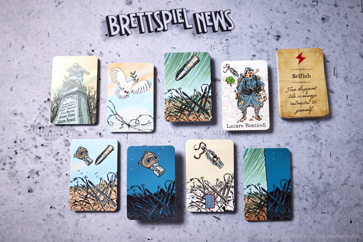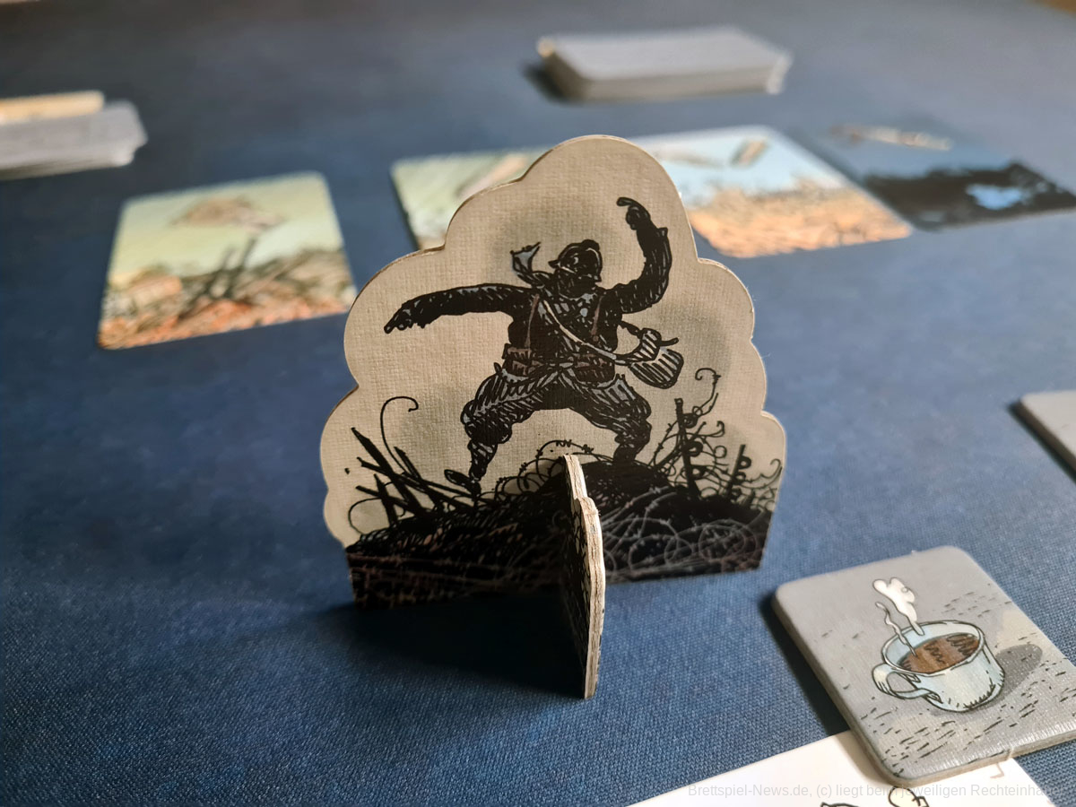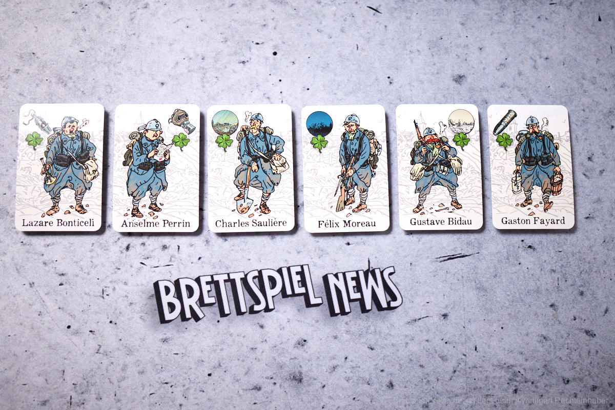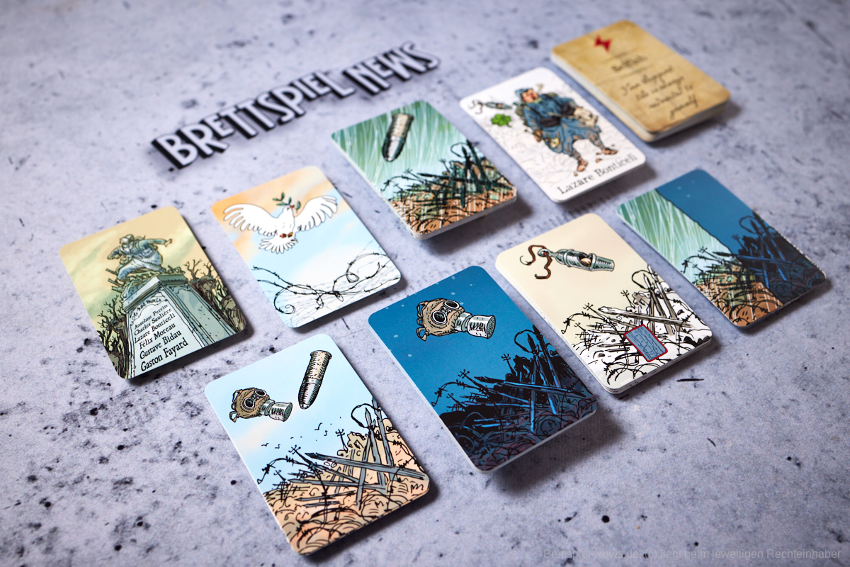 THE GRIZZLED ist wieder eines dieser Spiele, das sich nicht mit normalen Brettspielen vergleichen lässt. So ist das Spiel, dadurch, dass Spielende sich keinerlei Informationen geben dürfen, extrem schwer, sodass der erste Sieg teilweise nur durch Glück errungen werden kann, da die richtigen Karten zur richtigen Zeit gezogen bzw. ausgespielt wurden. Spielende sind andauernd vor der Zwickmühle ob es wirklich klappt eine bestimmte Karte auszuspielen oder sich lieber zurückzuziehen, um in der nächsten Spielrunde dafür mehr Herausforderungen zu haben. Was am spielerischen Kontext gewöhnungsbedürftig erscheint, ist aus der künstlerischen Perspektive genau so gewollt. Das Spiel möchte nicht leicht sein, da die Herausforderungen des Krieges niemals leicht zu überwinden sind. THE GRIZZLED möchte seine Spielgruppe vor das Leid und die kniffligen Entscheidungen stellen, die dem historischen Vorbild entsprechen. Für ein Kartenspiel gelingt es ihm ganz gut, wobei es sich natürlich auch durch die begrenzten Mittel eines Kartenspiels selbst limitiert und etwas Spieltiefe einbüßt. Ein meiner Meinung nach schöner Aspekt ist es, dass alle Charaktere des Spiels auf Vorfahren des Entwicklerteams basieren und damit nicht nur gesichtslose Brettspielcharaktere darstellen, sondern eine eigene „Seele“ und Geschichte besitzen.