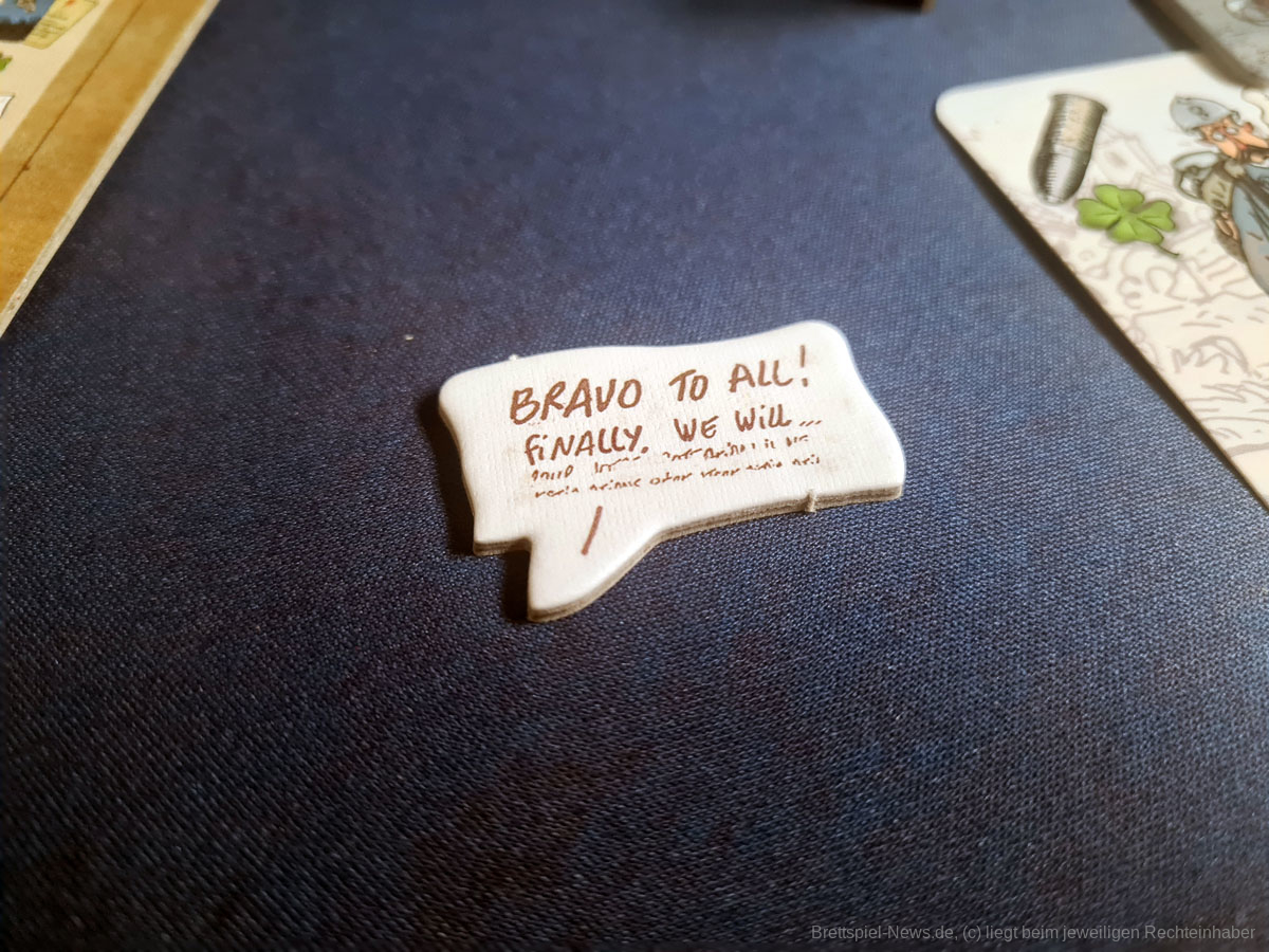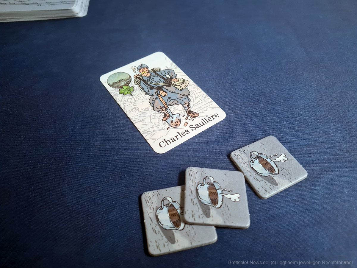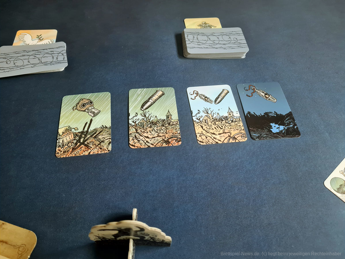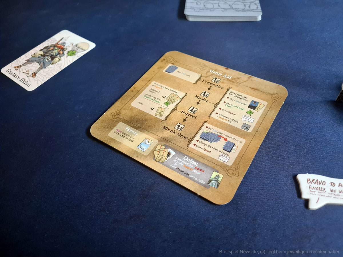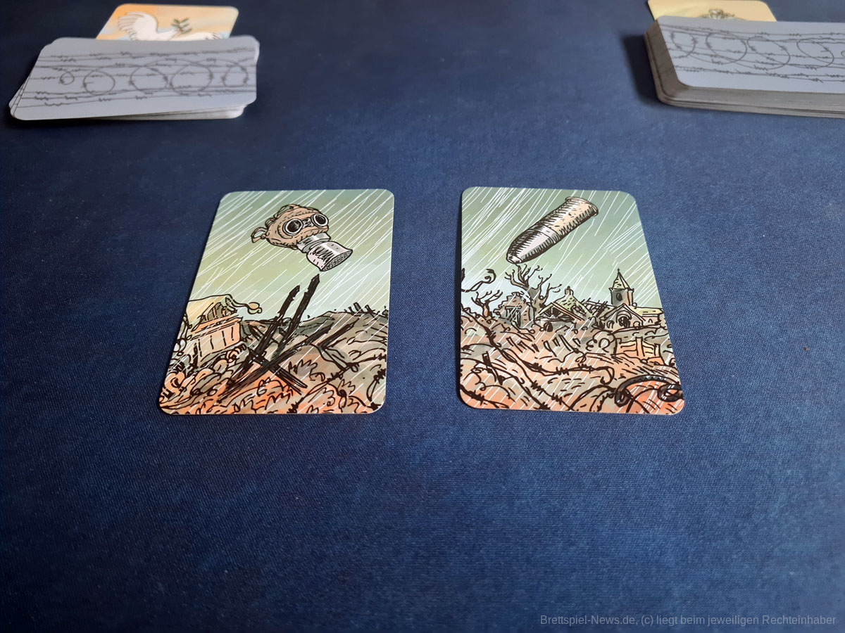THE GRIZZLED ist wieder eines dieser Spiele, das sich nicht mit normalen Brettspielen vergleichen lässt. So ist das Spiel, dadurch, dass Spielende sich keinerlei Informationen geben dürfen, extrem schwer, sodass der erste Sieg teilweise nur durch Glück errungen werden kann, da die richtigen Karten zur richtigen Zeit gezogen bzw. ausgespielt wurden. Spielende sind andauernd vor der Zwickmühle ob es wirklich klappt eine bestimmte Karte auszuspielen oder sich lieber zurückzuziehen, um in der nächsten Spielrunde dafür mehr Herausforderungen zu haben. Was am spielerischen Kontext gewöhnungsbedürftig erscheint, ist aus der künstlerischen Perspektive genau so gewollt. Das Spiel möchte nicht leicht sein, da die Herausforderungen des Krieges niemals leicht zu überwinden sind. THE GRIZZLED möchte seine Spielgruppe vor das Leid und die kniffligen Entscheidungen stellen, die dem historischen Vorbild entsprechen. Für ein Kartenspiel gelingt es ihm ganz gut, wobei es sich natürlich auch durch die begrenzten Mittel eines Kartenspiels selbst limitiert und etwas Spieltiefe einbüßt. Ein meiner Meinung nach schöner Aspekt ist es, dass alle Charaktere des Spiels auf Vorfahren des Entwicklerteams basieren und damit nicht nur gesichtslose Brettspielcharaktere darstellen, sondern eine eigene „Seele“ und Geschichte besitzen.