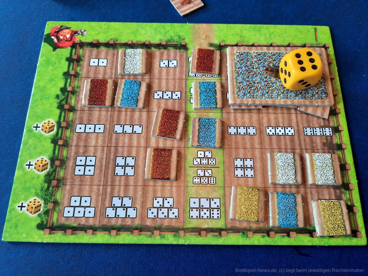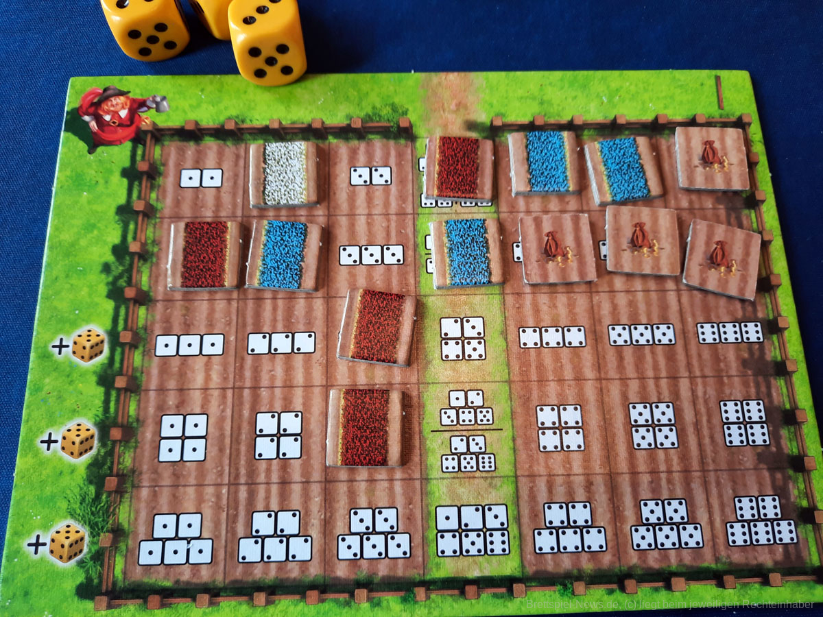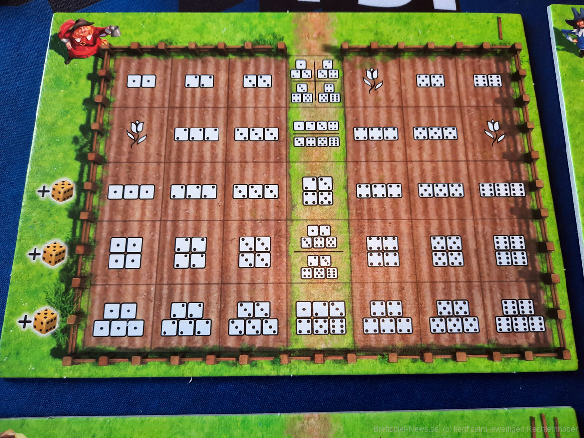 Es werden einfach die Züge hin und her gepasst und gewürfelt. Das ganze Spiel über frage ich mich „Was soll ich hier denn eigentlich tun?“ Es hat mich an das Ende von MACHI KORO LEGACY erinnert, welches ähnlich katastrophal war. Alle würfeln, bis eine Person Glück hatte und das Spiel gewinnt. Genau so läuft es hier. Am Anfang gibt es ein scheinbar nicht enden wollendes Aufbauen der Felder, bis alle ein paar Extrawürfel und ein Bonusplättchen haben und dann gehts hin und her. Spannend wie eine Partie Ping Pong, allein, ohne Ball.