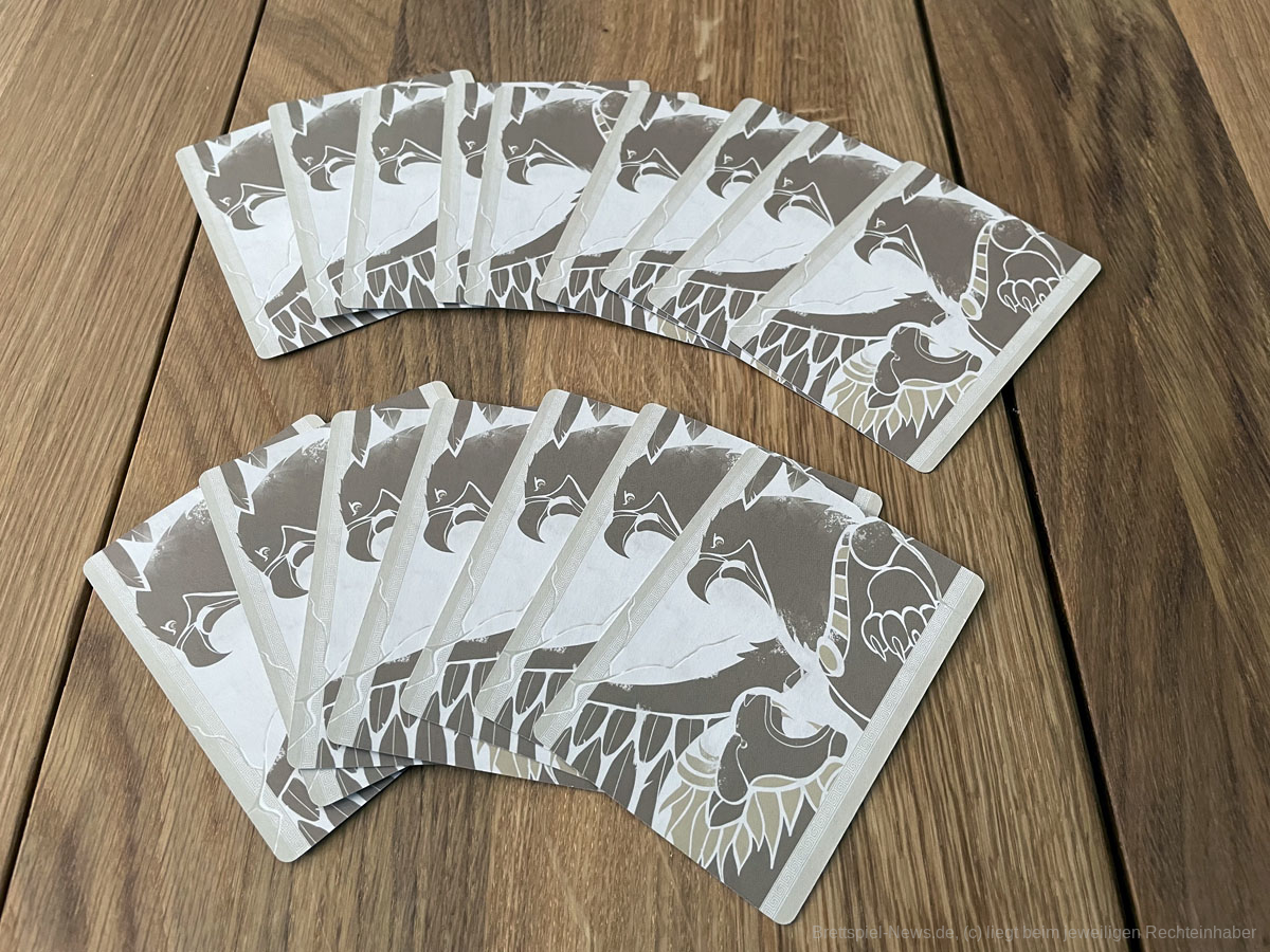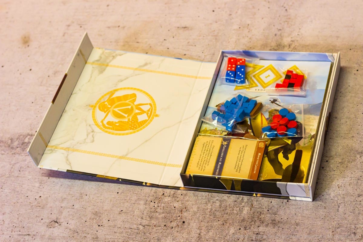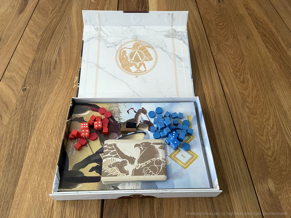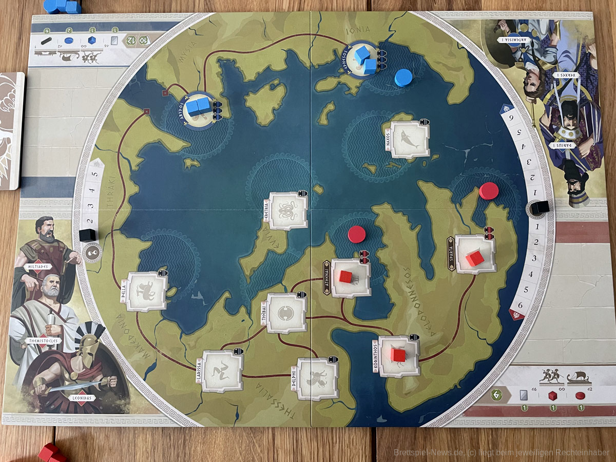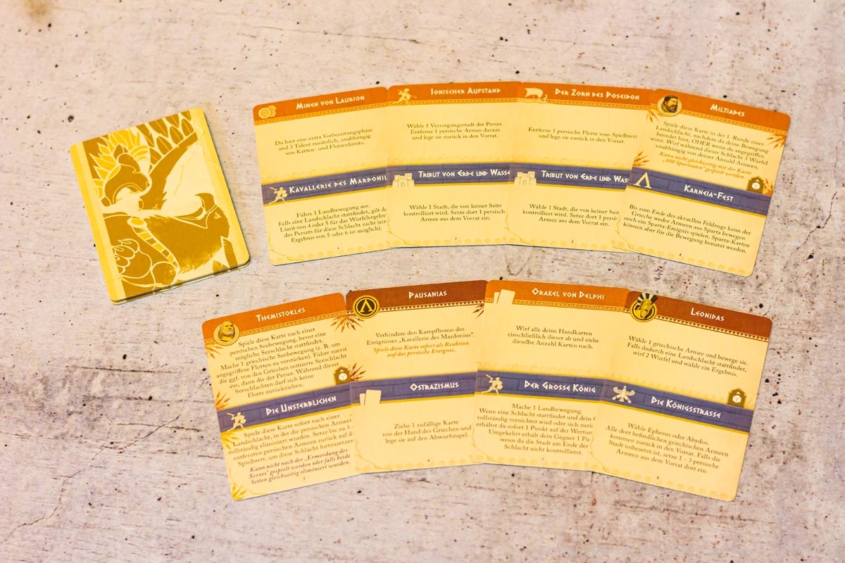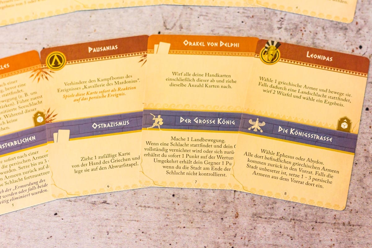 300 ist kurz, sehr kurz. Der Spielaufbau dauert allenfalls 60 Sekunden, eine Partie kann bei Kenntnis der 16 Spielkarten in rd. 15 Minuten gespielt werden. Um die auf der Spielverpackung angegebene Spieldauer von 40 Minuten zu erreichen, müssen die Beteiligten wirklich SEHR lange nachdenken. Wir haben diese Spieldauer nicht einmal in unserer ersten Partie erreicht, in welcher wir hin und wieder Regeln nachschlagen mussten. 20 Minuten inkl. Auf- und Abbau sorgen natürlich für hohe Flexibilität, wenn es darum geht, eine Gelegenheit zum Spielen zu finden. Andererseits spricht die Spieldauer aber auch eine klare Sprache darüber, welcher Tiefgang erwartet werden kann. In 5 Runden passiert leider nicht ganz so viel, zumal die Karte „Plötzlicher Tod des persischen Königs“ die Spielrunde für beide Spieler beendet, sobald sie vom Kartenstapel gezogen wird. Das kann bis zu zweimal pro Partie passieren, so dass manche Partie effektiv nach drei Spielrunden endet. Das ist etwas zu wenig, um wirklich zu taktieren. Unsere besten Partien waren daher jene, in welchen der persische König nicht gestorben ist. Mit fortschreitender Spieldauer wird es für die Griechen nämlich immer kniffliger, die persischen Streitkräfte abzuwehren.