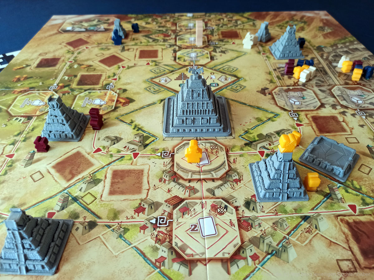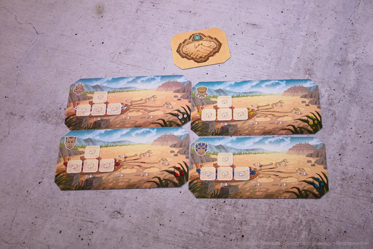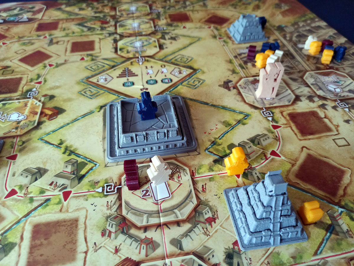 Sehr wichtig ist es, die Aktionen der „Konkurrenten“ genau im Auge zu behalten. Zieht jemand überraschend ins Ziel und löst damit das Rundenende aus, kann dies andere schnell auf dem falschen Fuß erwischen, da beispielsweise noch keine Karten für die Opfergabe gesammelt wurden, oder noch Steine für die nächste Runde benötigt werden.