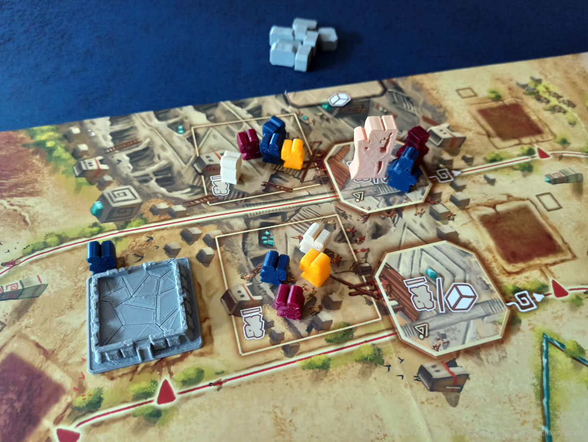 Im Spiel fällt schnell auf, dass die Startperson eine wesentliche Rolle einnimmt, denn diese darf den Architekten steuern und entscheidet damit, ob dieser mehr oder weniger Felder vorrückt. Dies kann wirklich fies sein und einen Plan der Konkurrenz schnell mal eben über dem Haufen werfen, wenn wichtige Aktionsfelder plötzlich inaktiv sind. Mit fortschreitendem Spiel bewegt sich der Architekt im Verhältnis zudem immer schneller, denn dieser ignoriert, im Gegensatz zu den Mitspielenden, bei seinen Schritten die Pyramiden. Dies ist ein durchaus interessanter Mechanismus von CARAL.