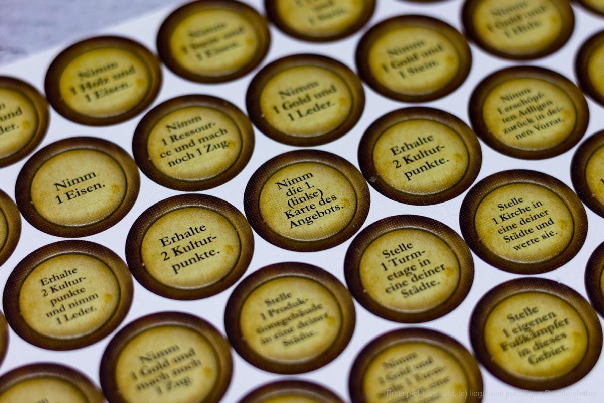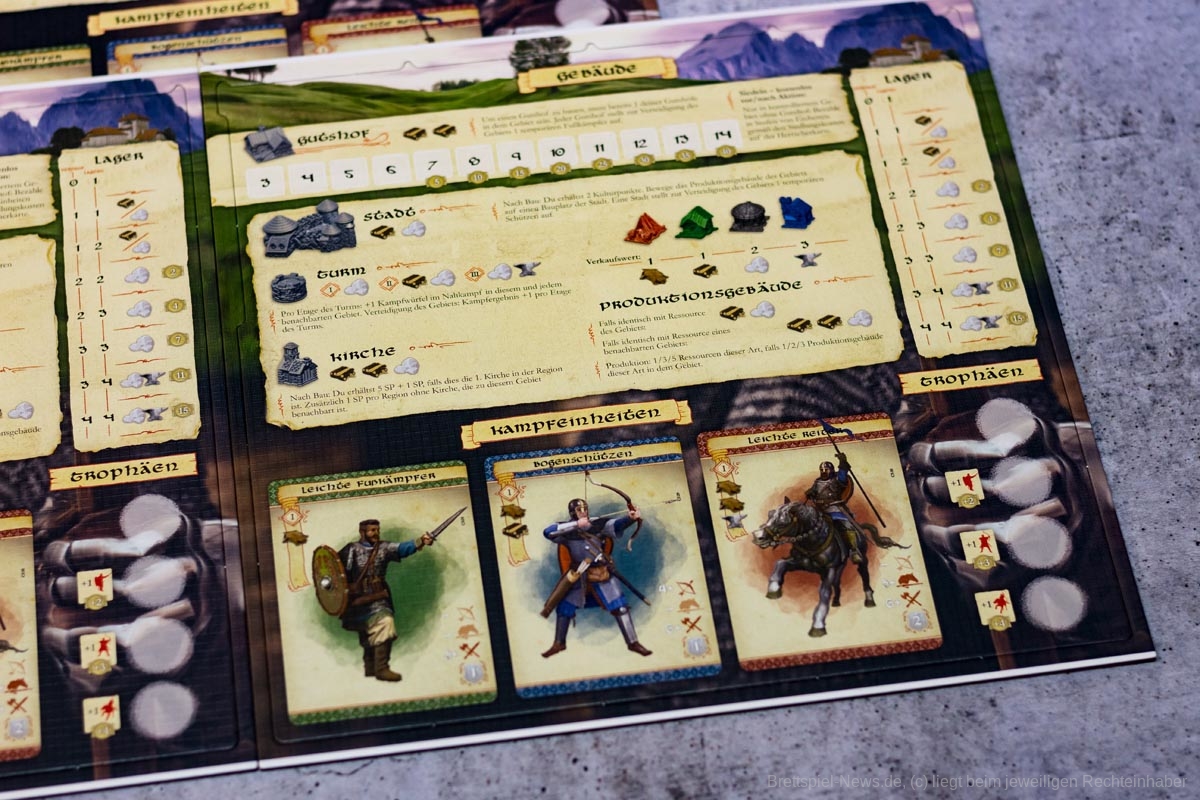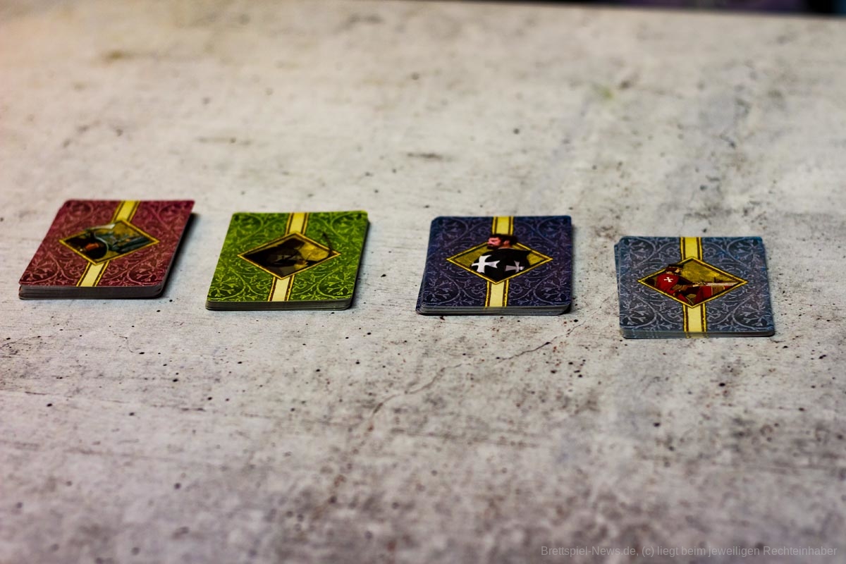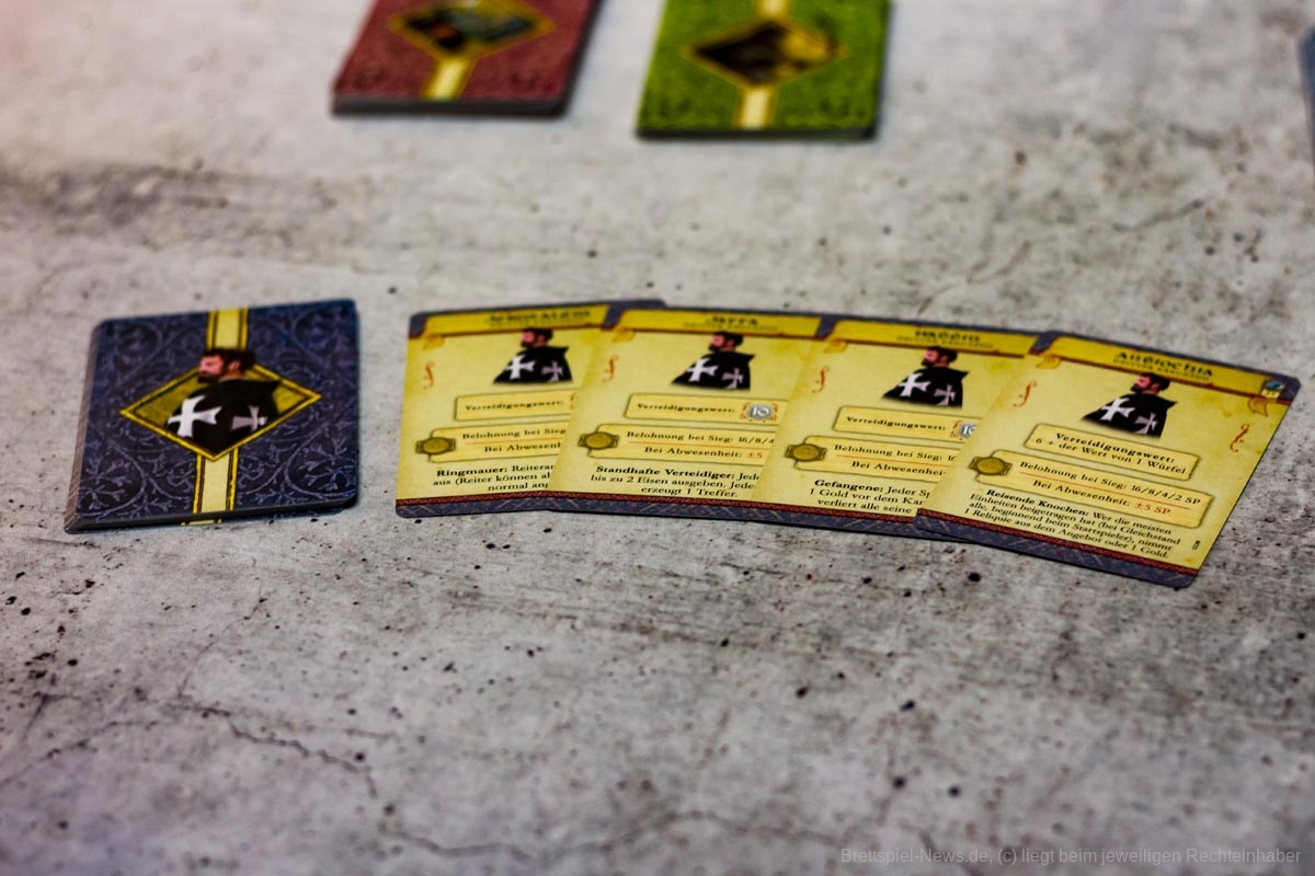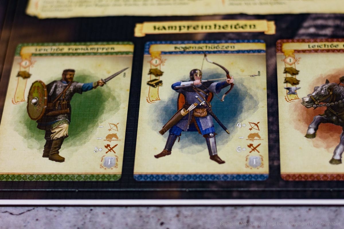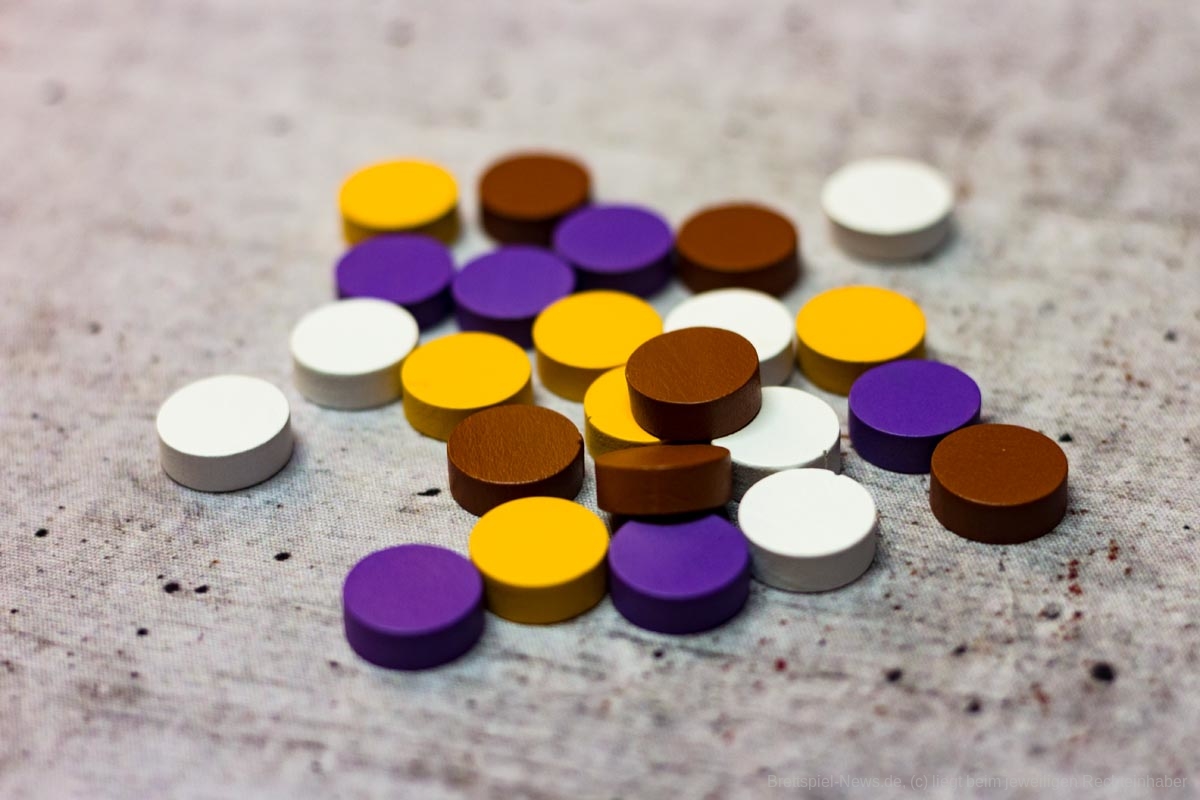 Die Frage, wann setze ich wo eine Scheibe ein, um am besten nur mir selbst Reaktionen zu ermöglichen, erfordern eine Menge Vorausplanung und gutes Timing. Auch das Aufwerten von Fähigkeiten durch das stufenweise Herausschieben von Karten, ist eine clevere Mechanik, die uns schon in anderen Spielen begeisterte und hier sinnvoll eingebunden wird. Kämpfe sind schnell abgehandelt, was das flüssige Spielen zusätzlich fördert. Auch wenn die Auswahl an Aktionsfeldern überschaubar ist, gibt es eine Menge zu tun und abzuwägen. Die Kartenvielfalt ist hoch und die unterschiedlichen Kartentypen gewähren verschiedene Möglichkeiten von Optimierung der Truppen bis hin zum einmaligen Siegpunktgewinn.