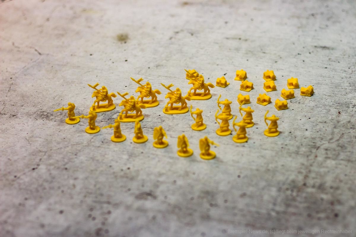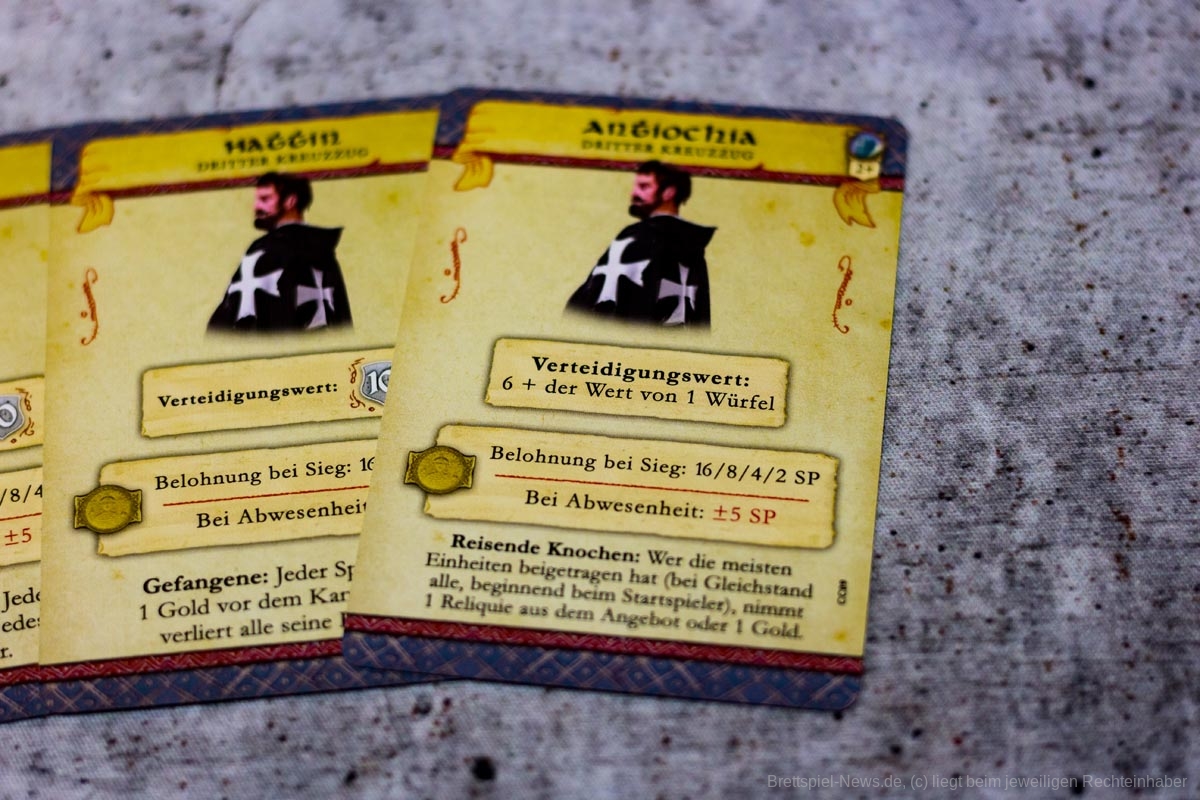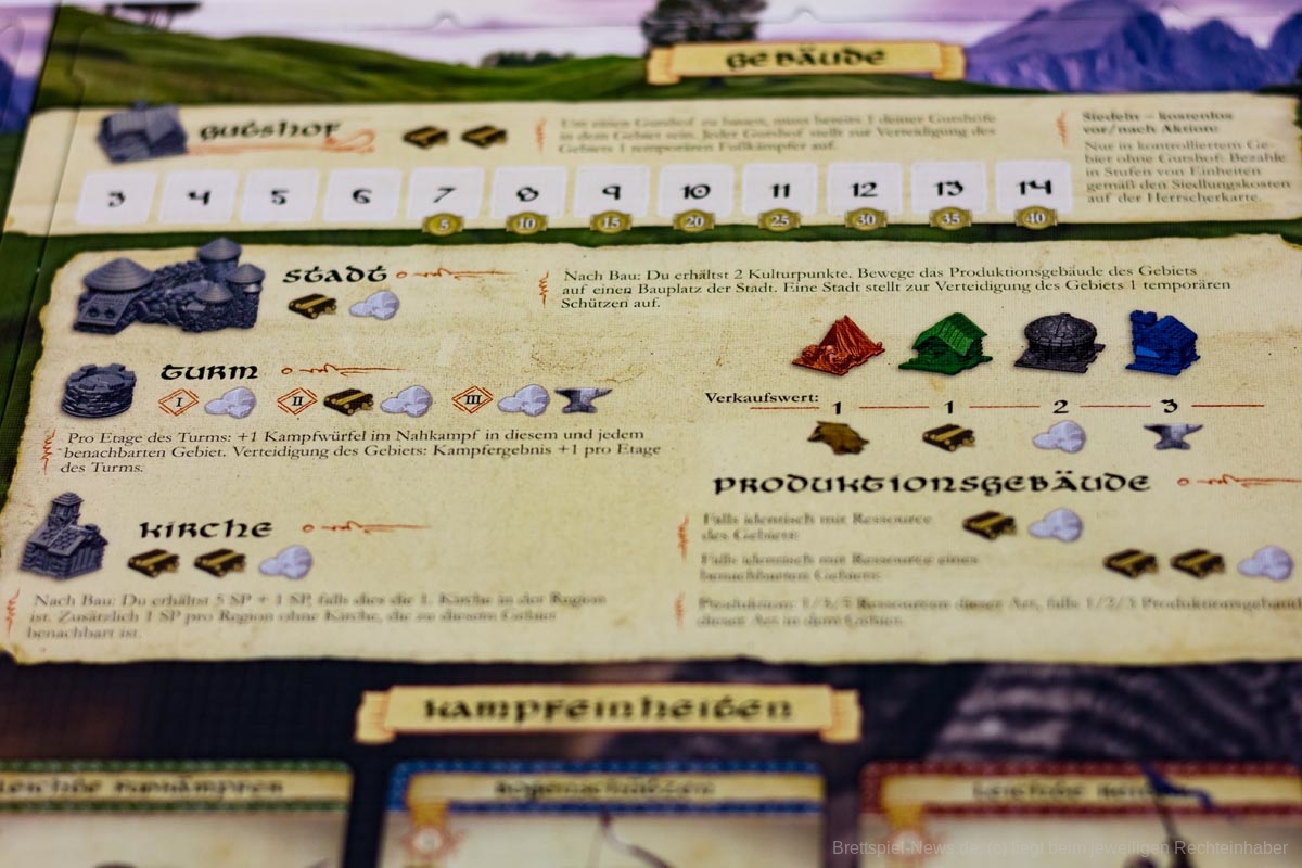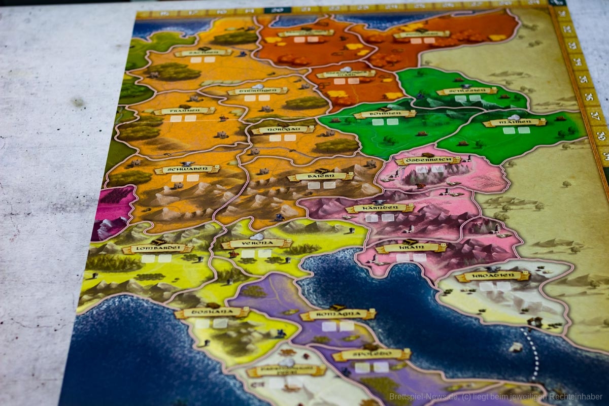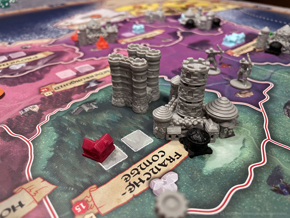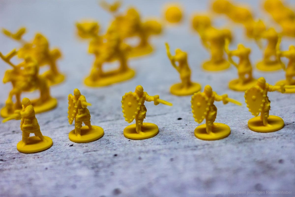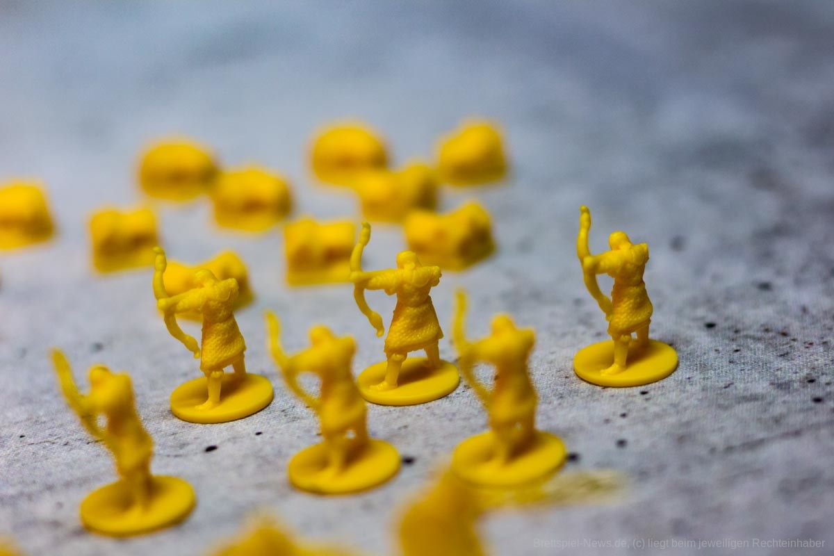 Die Frage, wann setze ich wo eine Scheibe ein, um am besten nur mir selbst Reaktionen zu ermöglichen, erfordern eine Menge Vorausplanung und gutes Timing. Auch das Aufwerten von Fähigkeiten durch das stufenweise Herausschieben von Karten, ist eine clevere Mechanik, die uns schon in anderen Spielen begeisterte und hier sinnvoll eingebunden wird. Kämpfe sind schnell abgehandelt, was das flüssige Spielen zusätzlich fördert. Auch wenn die Auswahl an Aktionsfeldern überschaubar ist, gibt es eine Menge zu tun und abzuwägen. Die Kartenvielfalt ist hoch und die unterschiedlichen Kartentypen gewähren verschiedene Möglichkeiten von Optimierung der Truppen bis hin zum einmaligen Siegpunktgewinn.