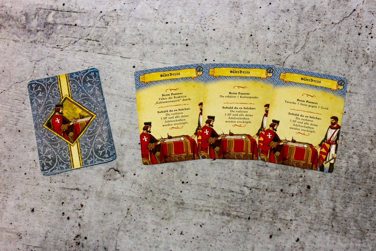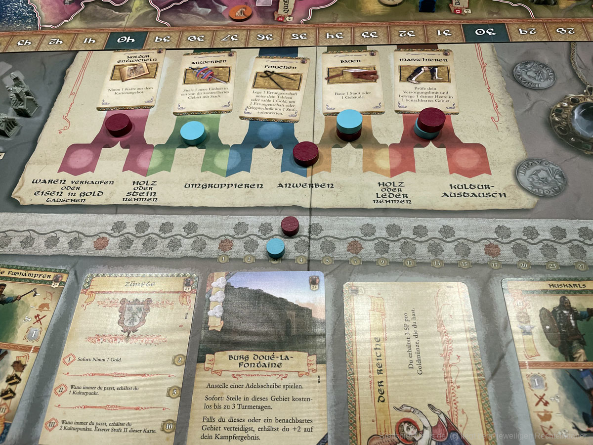 Gerade zu Spielbeginn, wenn die anfangs geringen Fortschritte auf der Kulturleiste nur eine stark eingeschränkte Kartenauswahl zulassen, muss auch die Reaktion Kulturaustausch bedient werden, um an gute Karten früh heranzukommen. Ärgerlich, wenn beim Spielaufbau zufällig das Aktionsfeld Marschieren darüber ausgelegt wurde, was vor allem beim Zweipersonenspiel deutlich weniger als andere Aktionsmöglichkeiten genutzt wird.