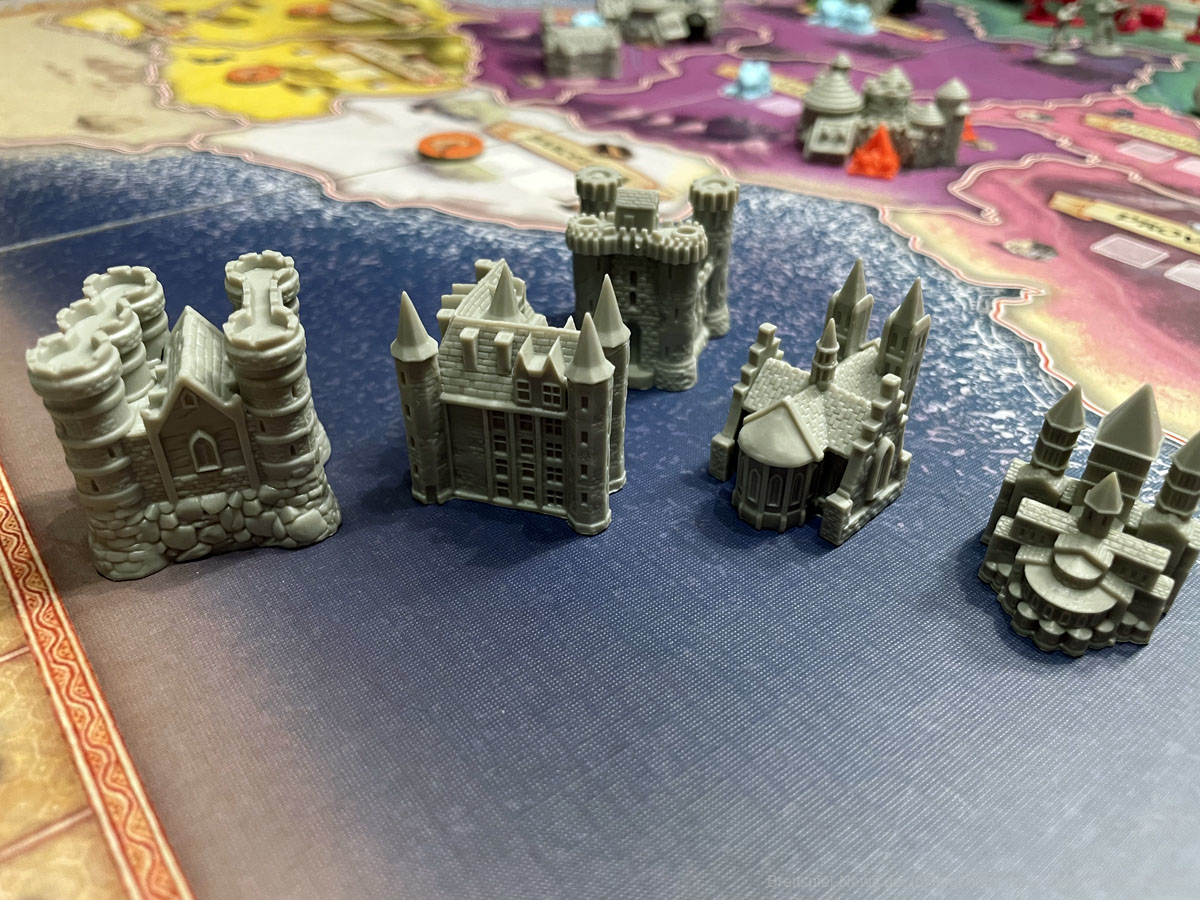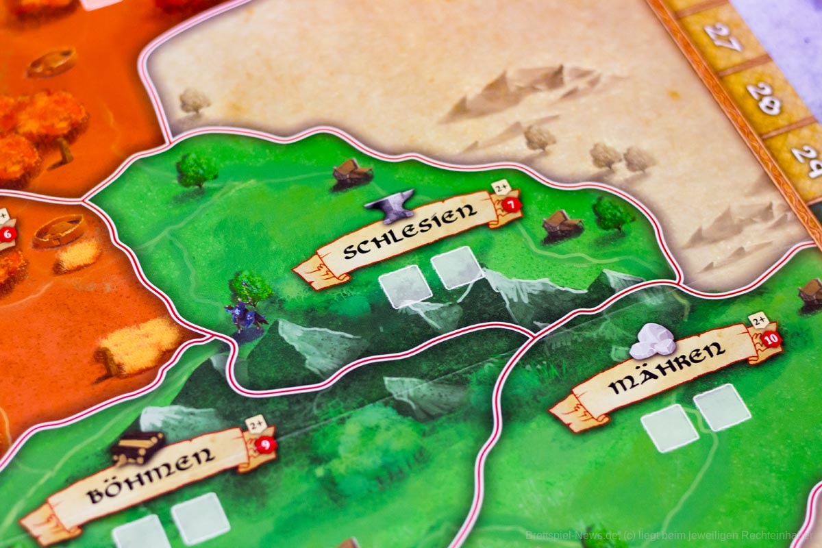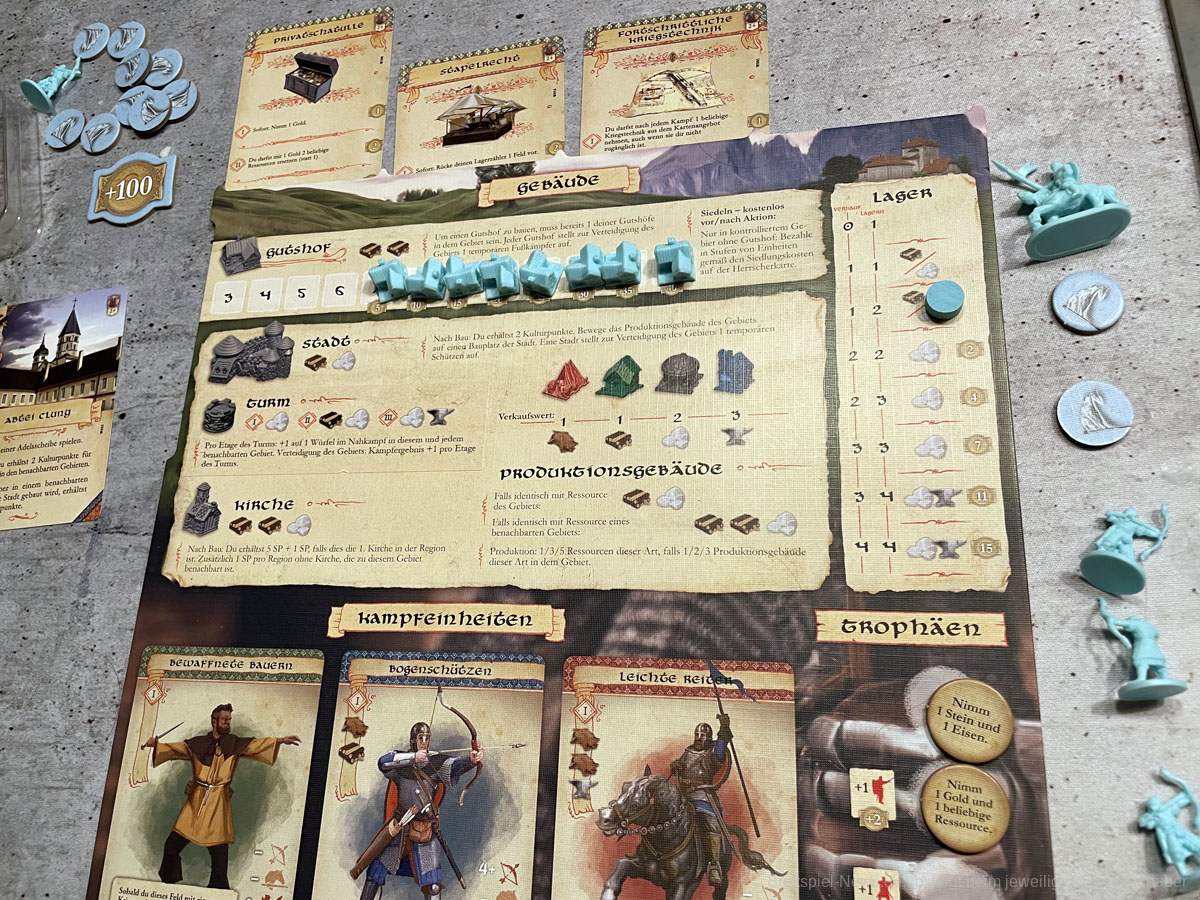 Dann entsteht ein Teufelskreis, aus dem es kein Entrinnen gibt: Die ersten Runden rüstet sich jeder zäh auf, baut Ressourcenhütten und Siedlungen. Danach gilt es Gebiete zu erobern und das eigene Herrschaftsgebiet auszuweiten. Hat man hier Pech mit den zufällig ausgelegten Barbaren oder einfach kein Würfelglück im ersten Kampf, gerät man sehr schnell ins Hintertreffen. In dieser Zeit, in der erneut mit den wenigen Ressourcen, Truppen ausgehoben werden müssen, gewinnen die anderen Parteien am Tisch neue Gebiete, bauen schon die ersten Städte, wodurch sie auf der Kulturleiste nach vorne ziehen, was ihnen wiederum viel früher Zugriff auf die starken Karten gewährt. Die Starken werden immer stärker und die Schwachen immer schwächer. Eine perfekt abgebildete Weltgesellschaft. In allen Partien entstand so ziemlich schnell ein großes Ungleichgewicht und Frustration. Zu zweit haben wir sogar abgebrochen, weil klar war, dass bereits dieser erste Patzer beim Kampf und eine starke Karte in falschen Händen, dazu führte, dass auch nach zwei Stunden Spielen, ein Aufholen nicht mehr möglich war.