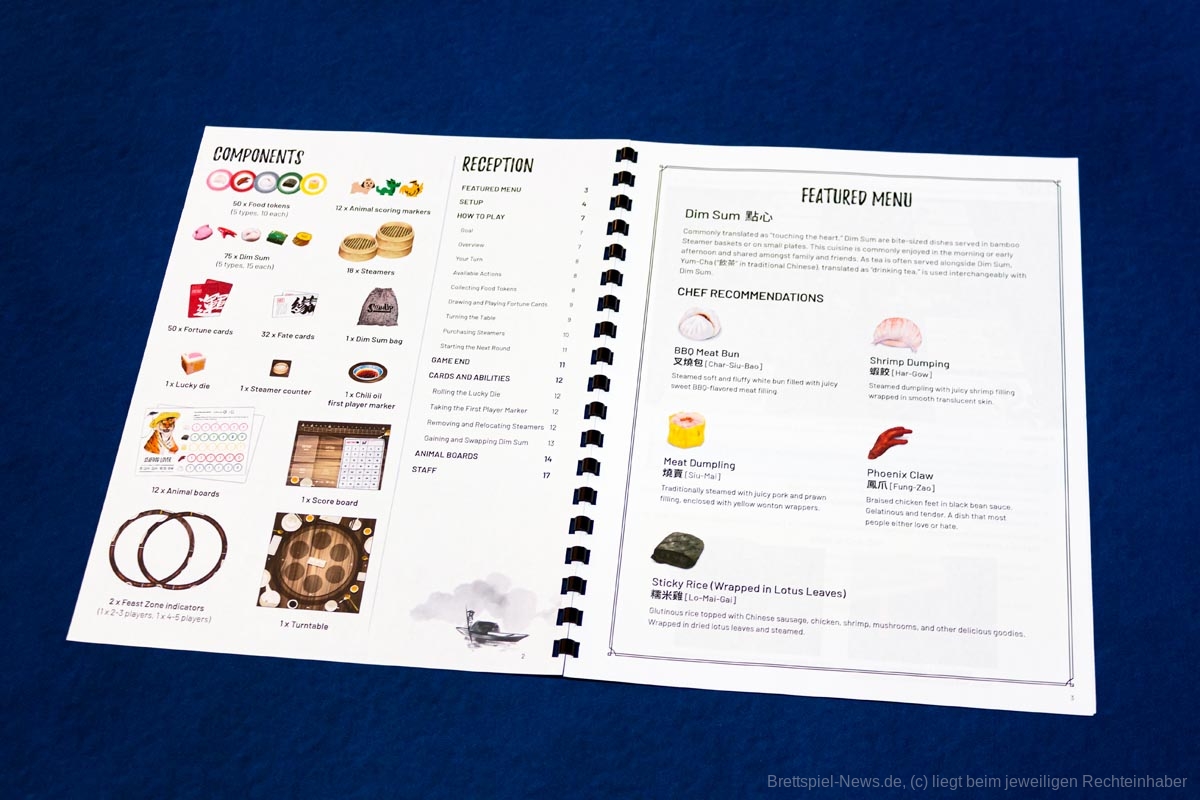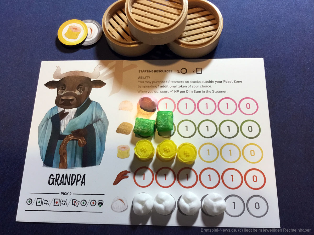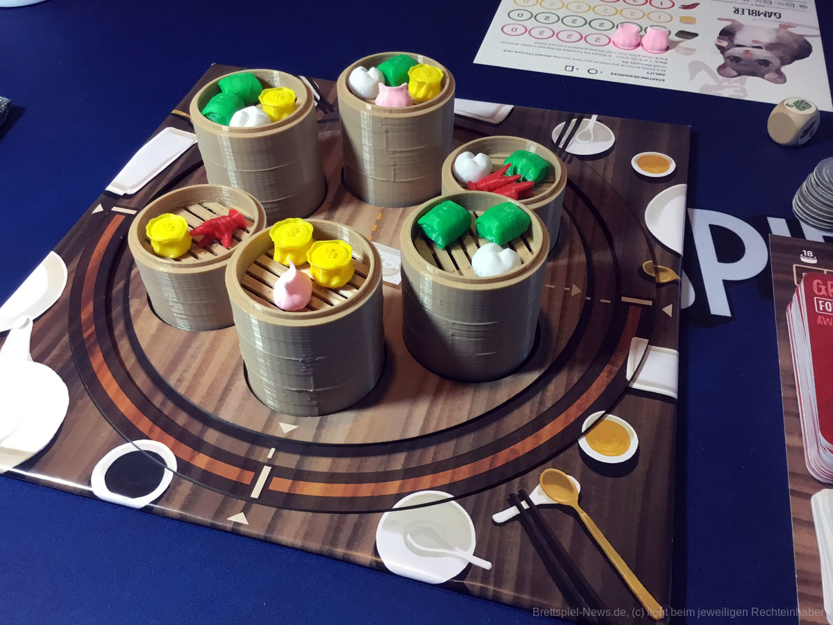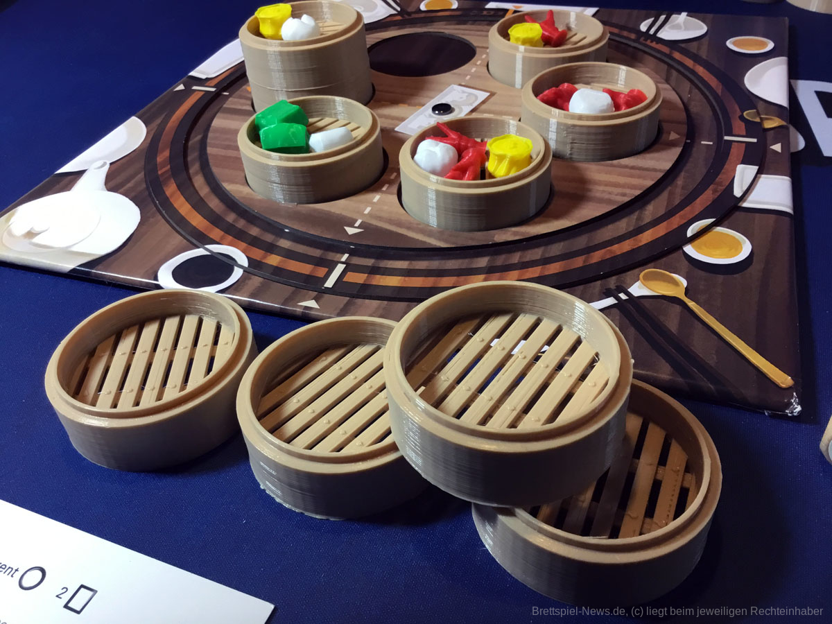 An dieser Stelle muss doch einmal das Material thematisiert werden. Denn das Grundspiel wird zwar die Dämpfer enthalten, die Speisen bestehen allerdings nur aus Pappplättchen. Diese sehen zwar schön und appetitlich aus, doch es gibt Gründe weshalb Menschen lieber gekochte Speisen, als Abbildungen aus Kochbüchern essen - sie würden nach Papier schmecken! Die Deluxe-Version des Spiels verfügt über dreidimensionale Köstlichkeiten und erscheint viel realistischer. Auf die Spielbarkeit hat das keinen Einfluss.