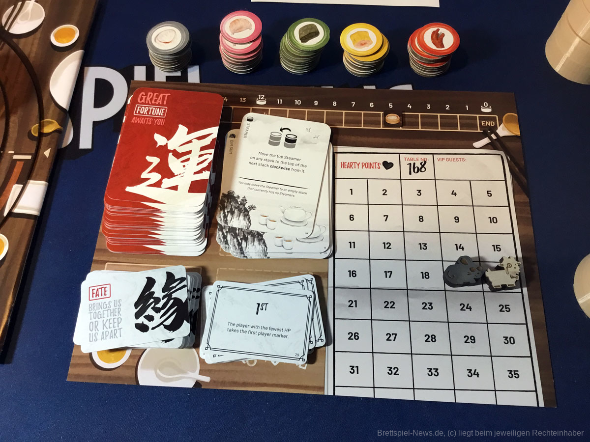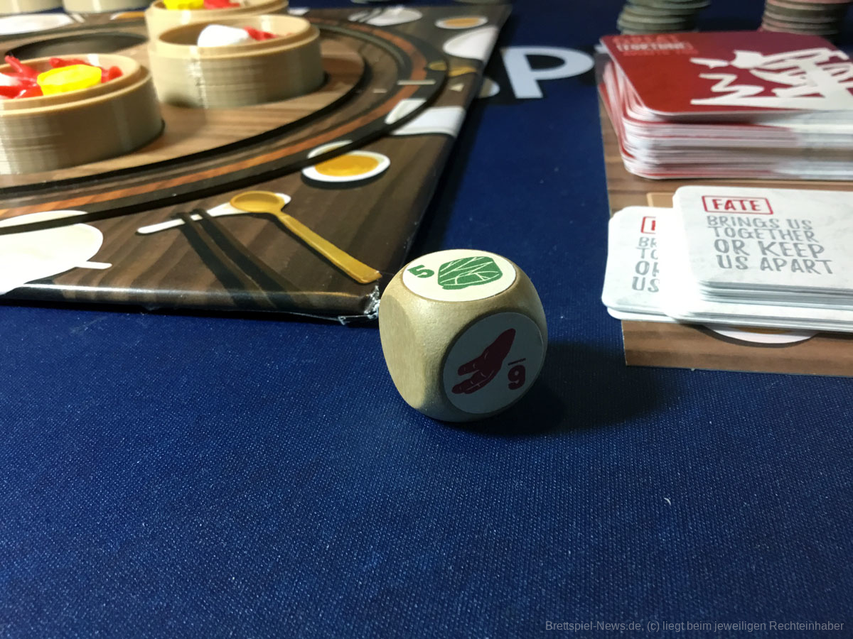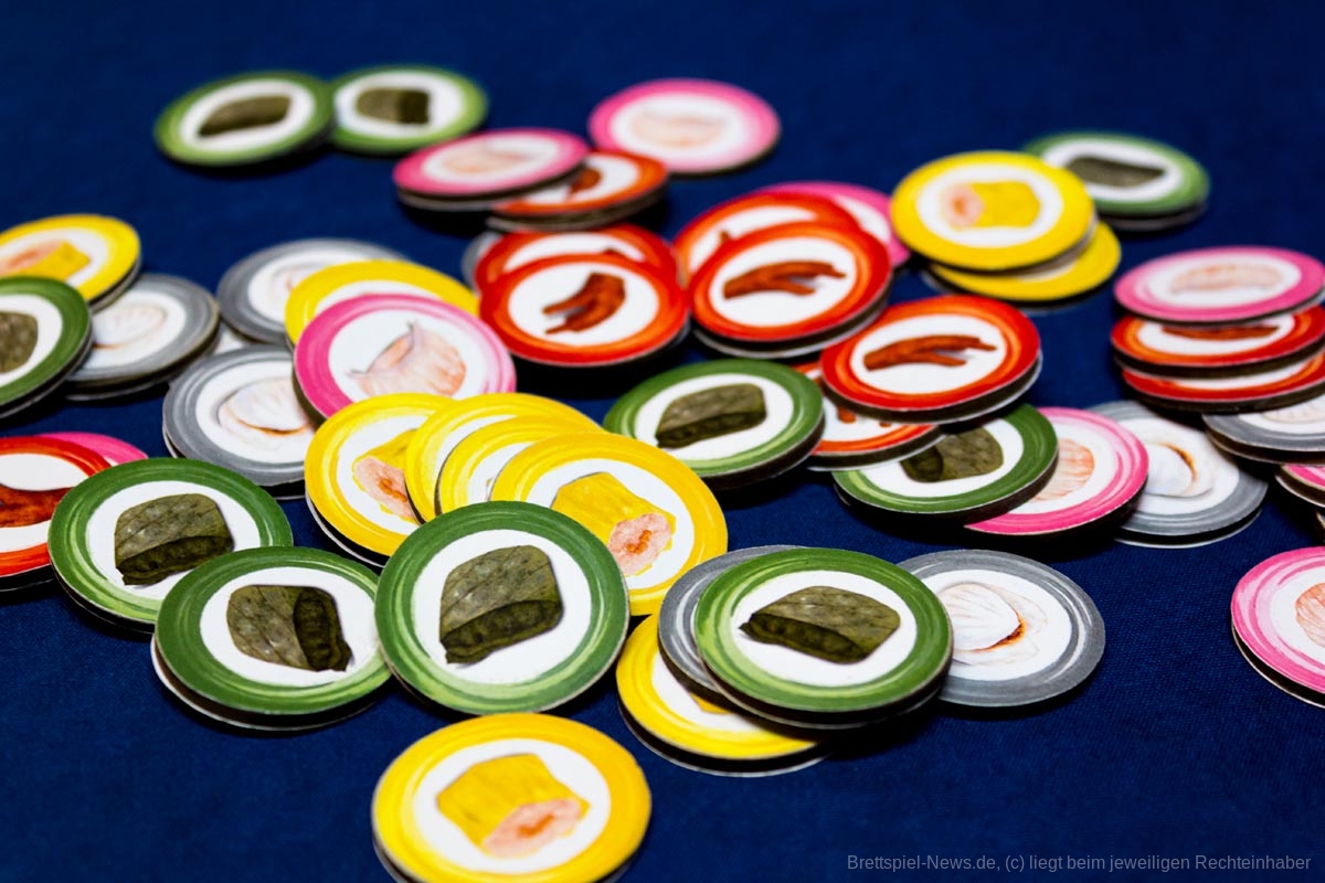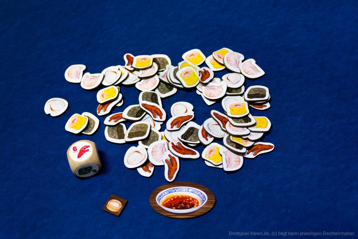 Aber bei einem so liebevoll umgesetzten Thema, dass durch stimmige Mechaniken belebt wird, sind Pappmarker - zumindest für mich - keine Option. Das zusätzliche, wenn auch unnötige, Material beeinflusst zwar den Preis, aber ich möchte nicht auf die kleinen Garnelen- oder Fleischklößchen verzichten. Sie stellen nur eine Zierde dar, die das Spiel jedoch gänzlich abrunden.