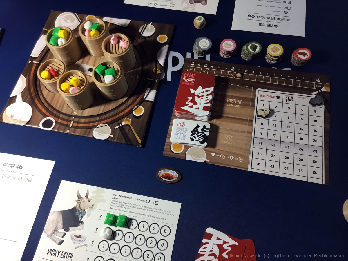 Reihum dürfen alle Gäste immer zwei verschiedene Aktionen ausführen. Es können Chips für die jeweiligen Speisen genommen werden. Doch Vorsicht, denn bleiben Chips am Ende übrig, bringen sie Minuspunkte. Entsprechen die gesammelten Chips dem Inhalt eines Dämpfers, so darf dieser erworben werden. Alle darin enthaltenen Dim Sum wandern auf das eigene Tableau. Doch das allein wäre kaum der Rede wert und von einer Schlacht, am Buffet, würde man sicher nicht sprechen, wenn da nicht die Glückskarten wären und das damit verbundene Drehen des runden Buffets.