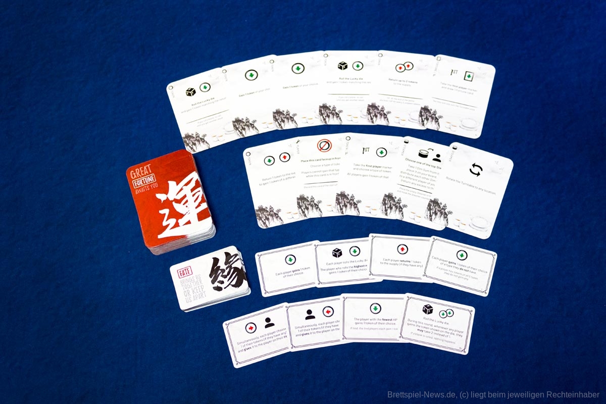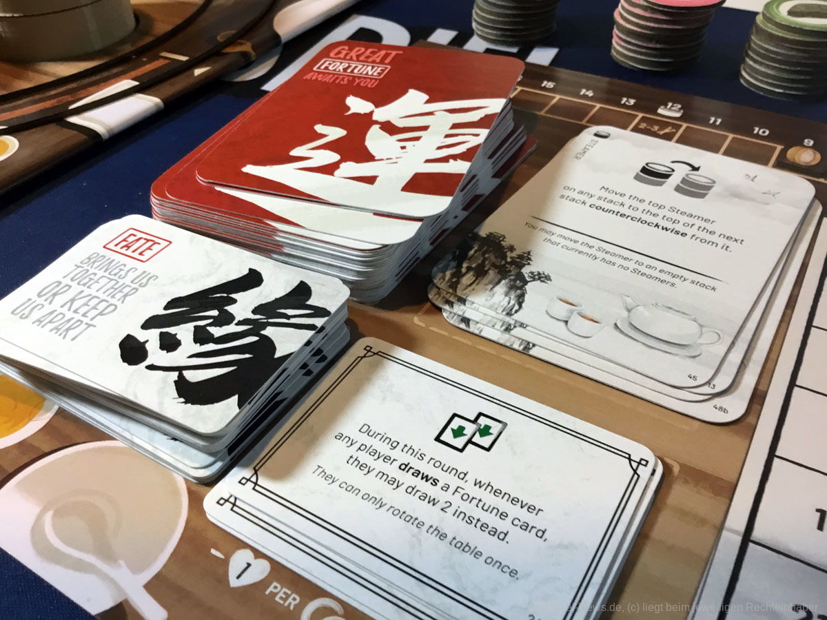 Wird als Aktion eine Glückskarte gezogen oder ausgespielt, muss zusätzlich das Tablett mit den Dämpfern gedreht werden. Da alle Gäste immer nur Zugriff auf einen kleinen Teil des Speisenangebotes haben, kann schon eine kleine Drehung die Pläne gehörig durcheinander bringen. An dieser Stelle entzünden sich nun die Gemüter der Gäste. Ob es nur ein Magengrummeln oder garstiges Knurren ist, dass den Kehlen der Gourmets entsteigt, bleibt besser ungeklärt. Doch schon mit dem ersten Bissen entbrennt der Kampf. Schicksalskarten lockern den Rundenablauf auf, indem sie die normalen Regeln ändern.