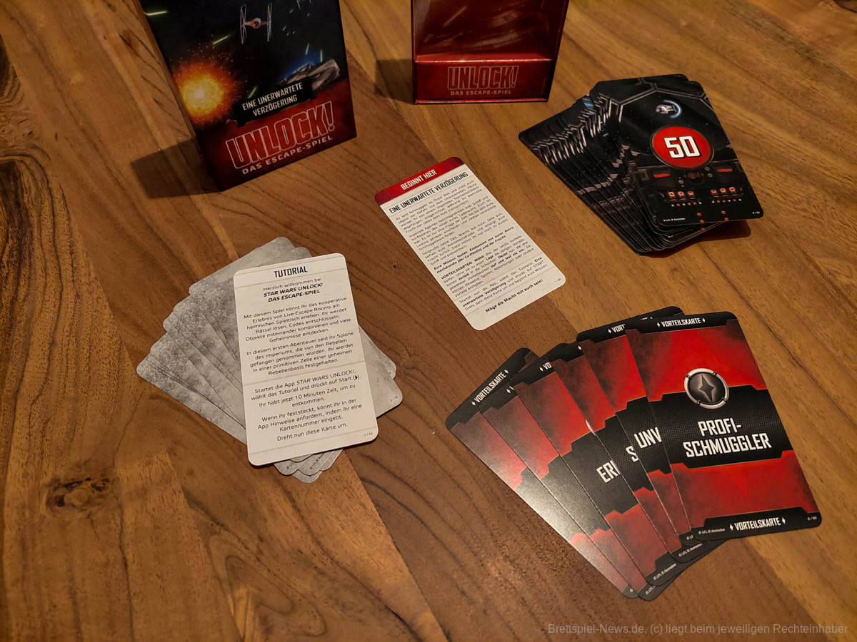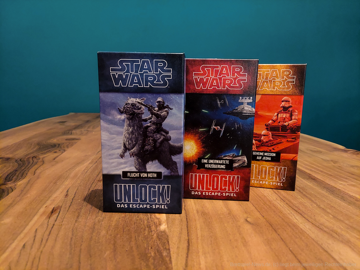 Die Anzahl der verschiedenen Ableger der sogenannten Escape-Room-Spiele lässt sich kaum noch überschauen. Bis heute werden diverse Varianten entwickelt und auf den Markt gebracht. Zu den einsteigerfreundlichsten Spielen gehört die Unlock!-Reihe von Space Cowboys. Für jeden Schwierigkeitsgrad wird ein geeignetes Szenario geboten; so auch bei der Star-Wars-Edition. Die drei Boxen beinhalten jeweils ein Szenario: „Flucht von Hoth“, „Eine unerwartete Verzögerung“ und „Geheime Mission auf Jedha“. Für den leichteren Einstieg ist jeder Box ein Tutorial bestehend aus zehn Karte beigelegt, welches die Spielmechanik kurz erläutert und das Regellesen erspart. Es ist auch eine Box mit allen drei Szenarien erhältlich.