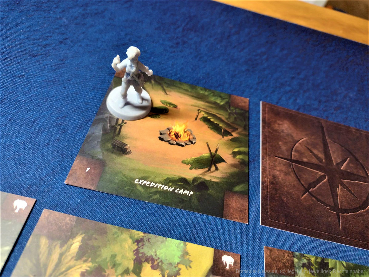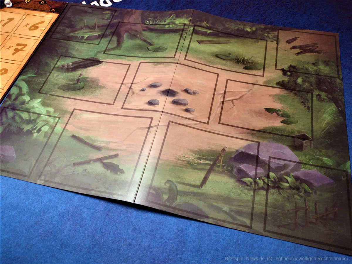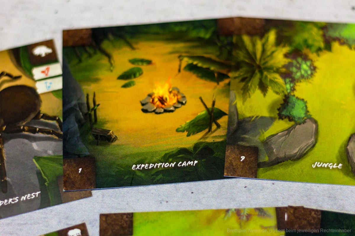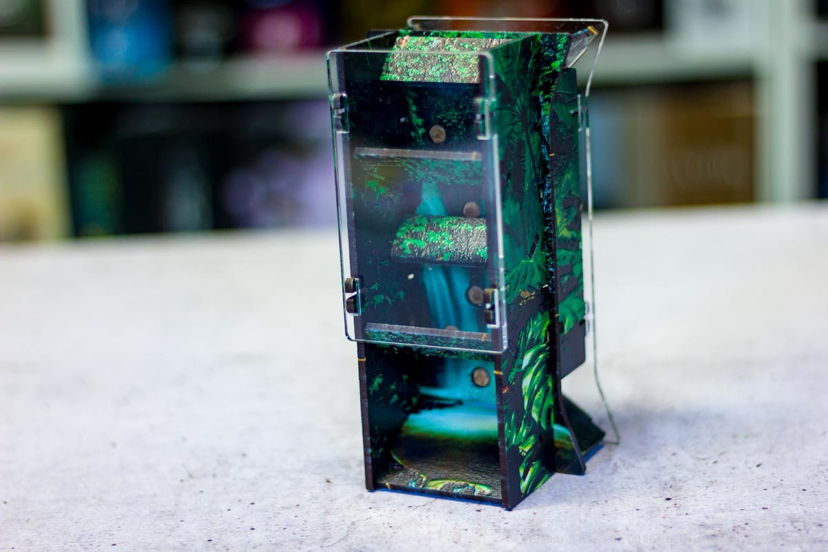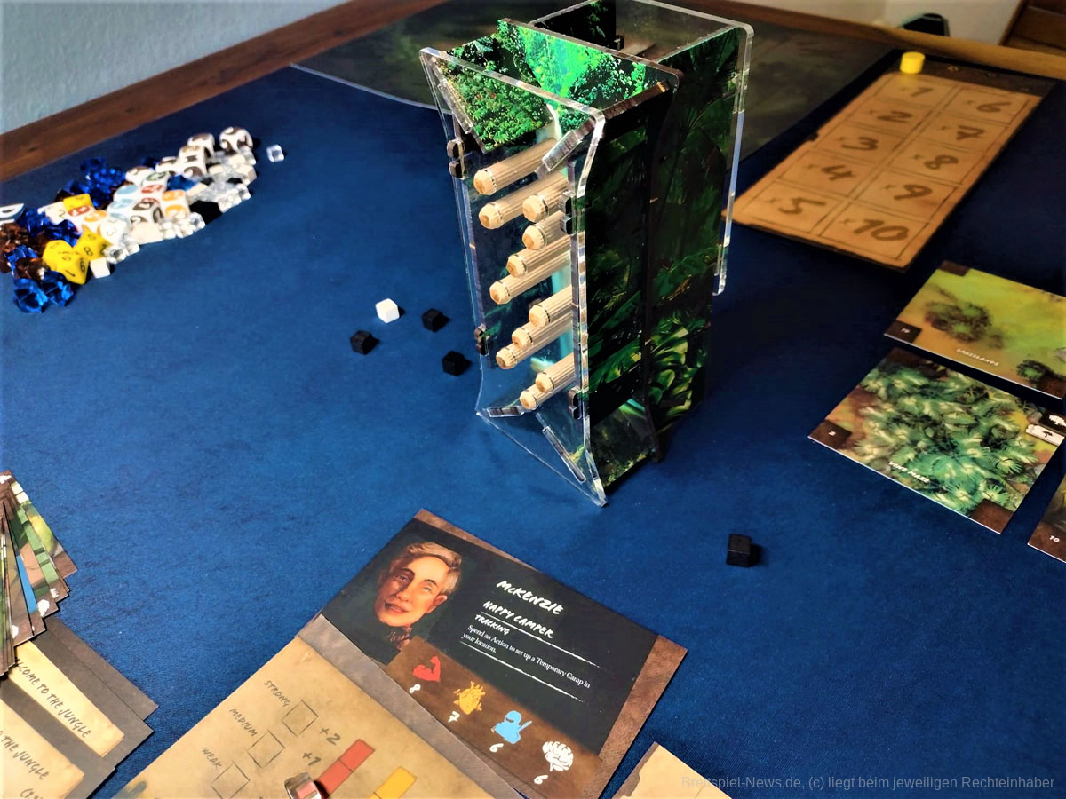 Die Materialqualität ist für einen Prototypen in Ordnung. Die Ressourcen-Token aus Plastik sind gut gemacht und haben eine tolle Haptik. Die Dschungelkarten und und der Campspielplan sind aus dünner und empfindlicher Pappe. Hier gibt es auf jeden Fall noch Steigerungspotential. Dazu muss noch gesagt werden, dass der enthaltene Würfelturm wohl das hässlichste Stück Plastik ist, das ich je gesehen habe. Das Design wurde in der Kickstarter-Kampagne glücklicherweise angepasst.