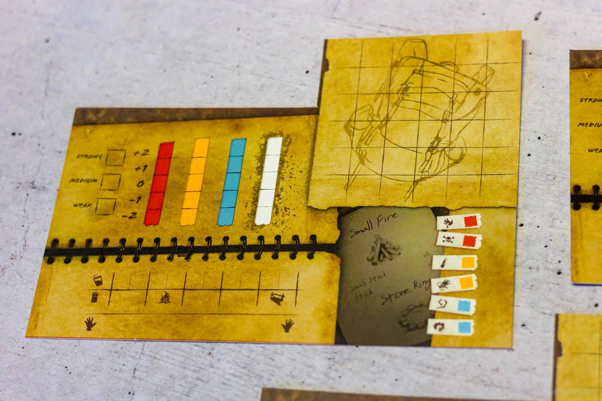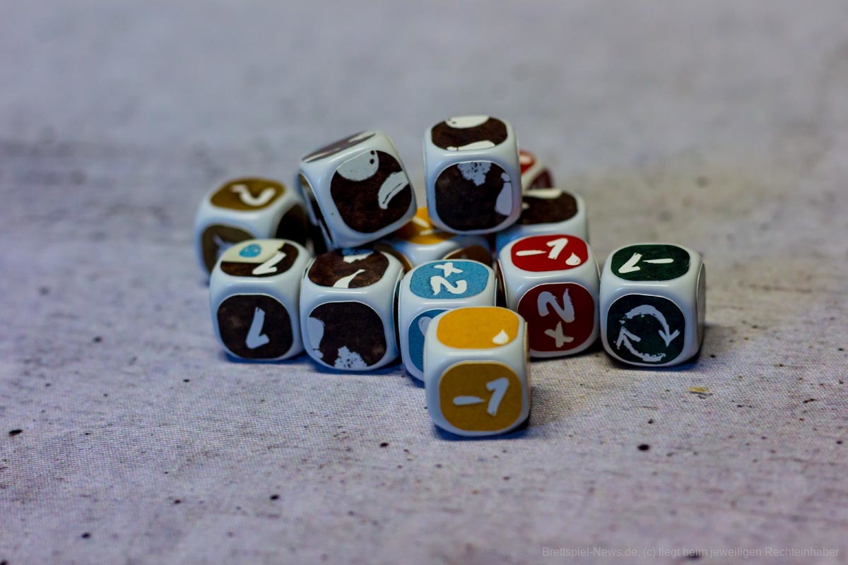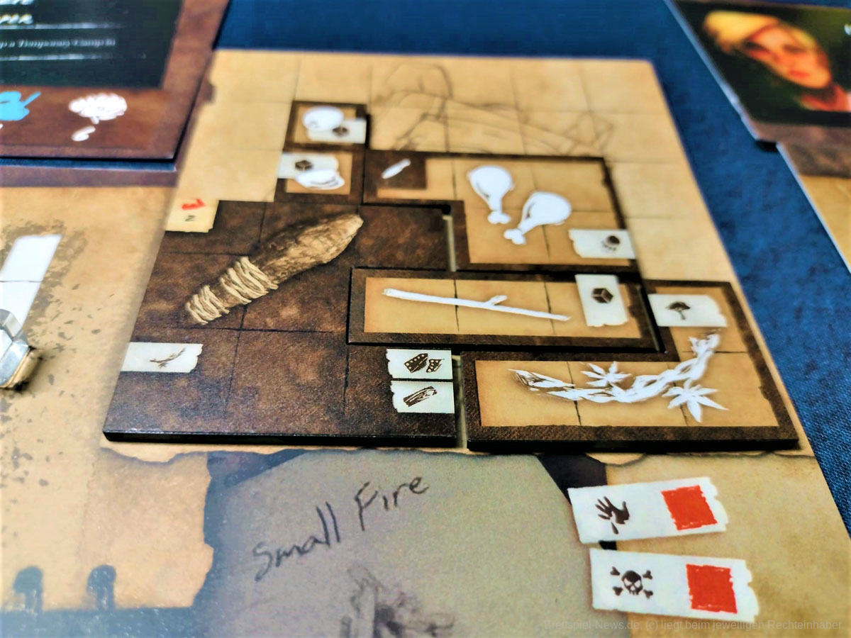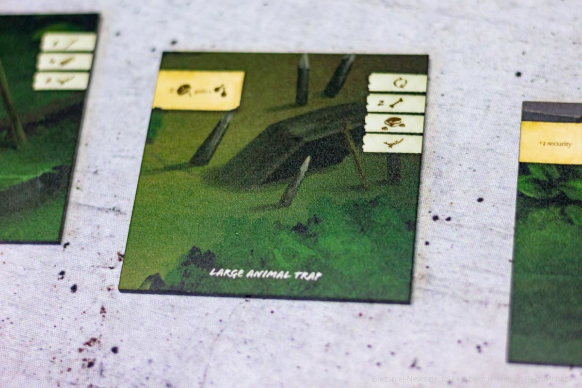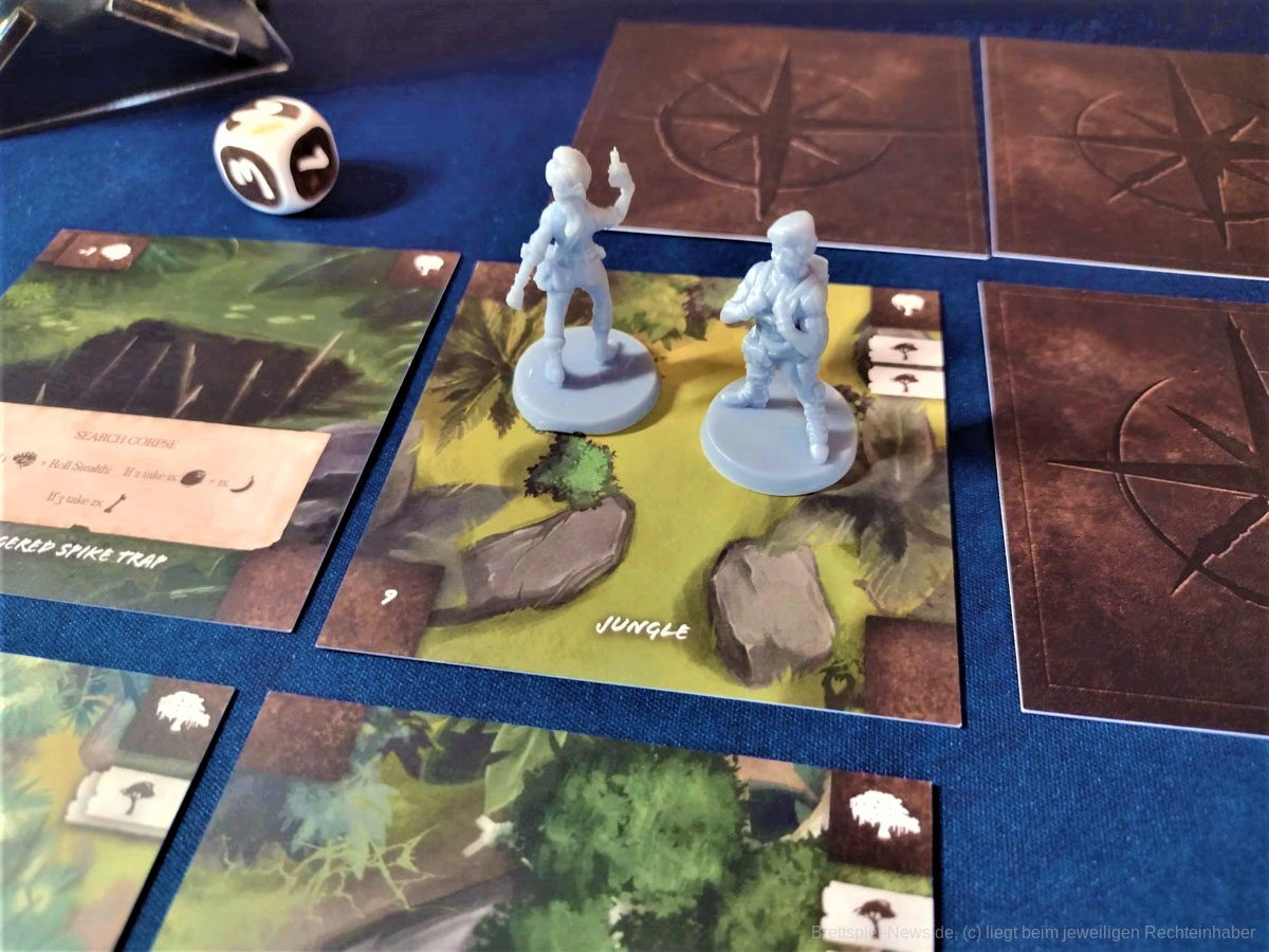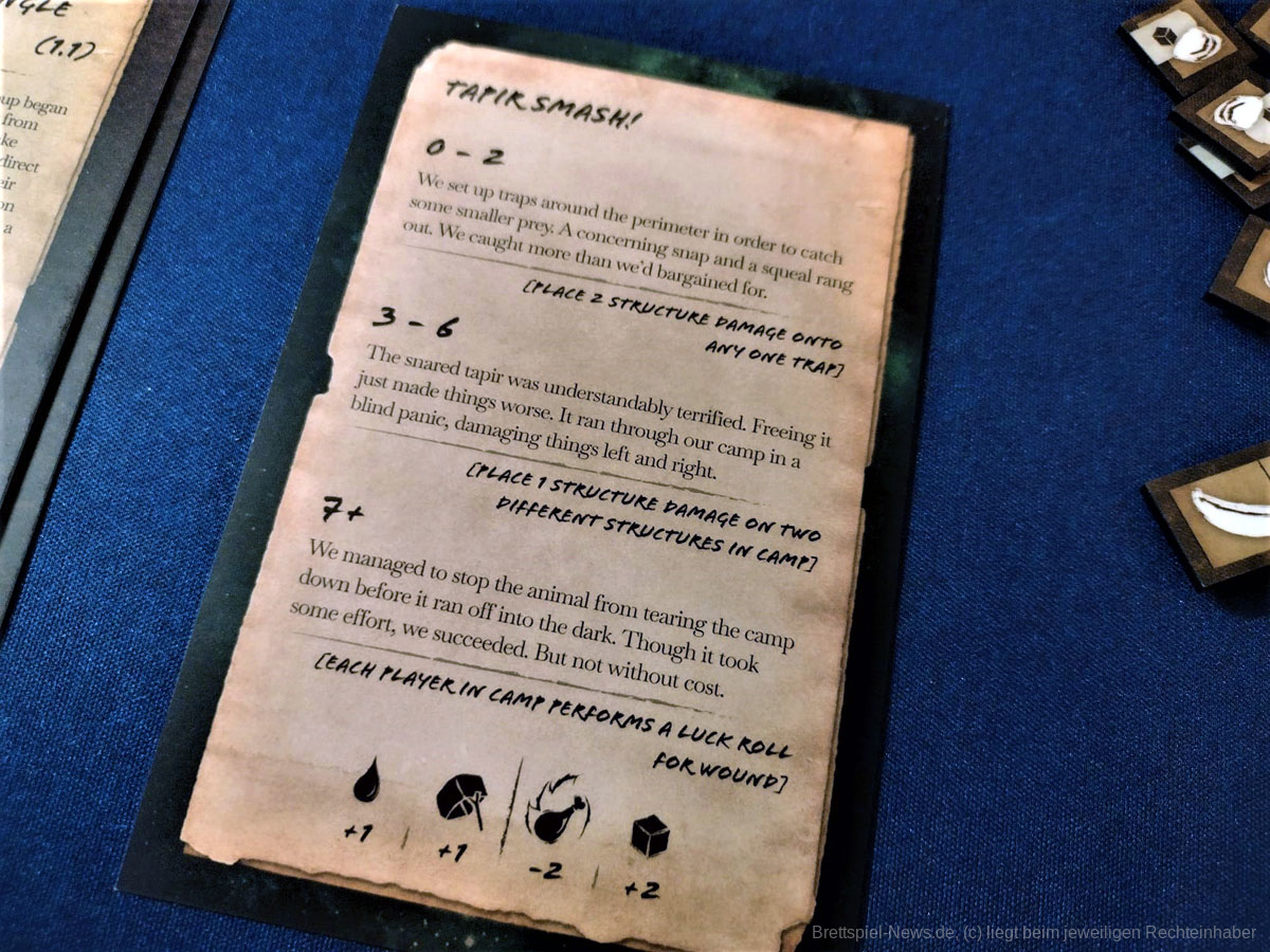 Die Materialqualität ist für einen Prototypen in Ordnung. Die Ressourcen-Token aus Plastik sind gut gemacht und haben eine tolle Haptik. Die Dschungelkarten und und der Campspielplan sind aus dünner und empfindlicher Pappe. Hier gibt es auf jeden Fall noch Steigerungspotential. Dazu muss noch gesagt werden, dass der enthaltene Würfelturm wohl das hässlichste Stück Plastik ist, das ich je gesehen habe. Das Design wurde in der Kickstarter-Kampagne glücklicherweise angepasst.