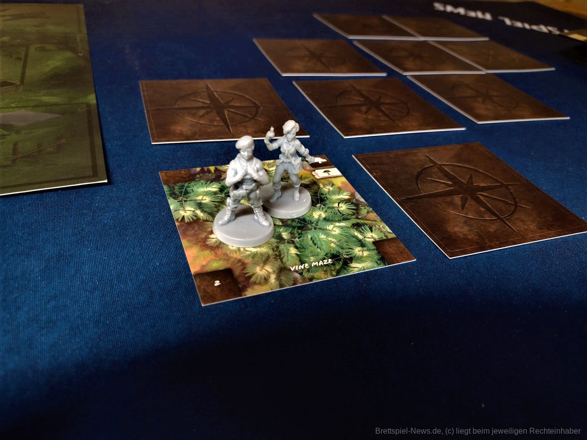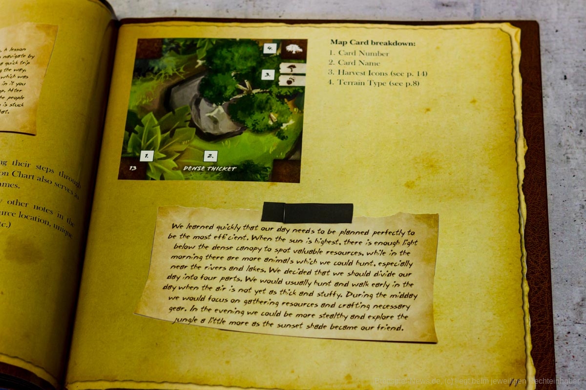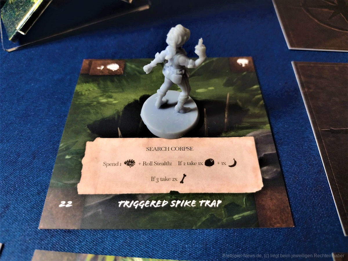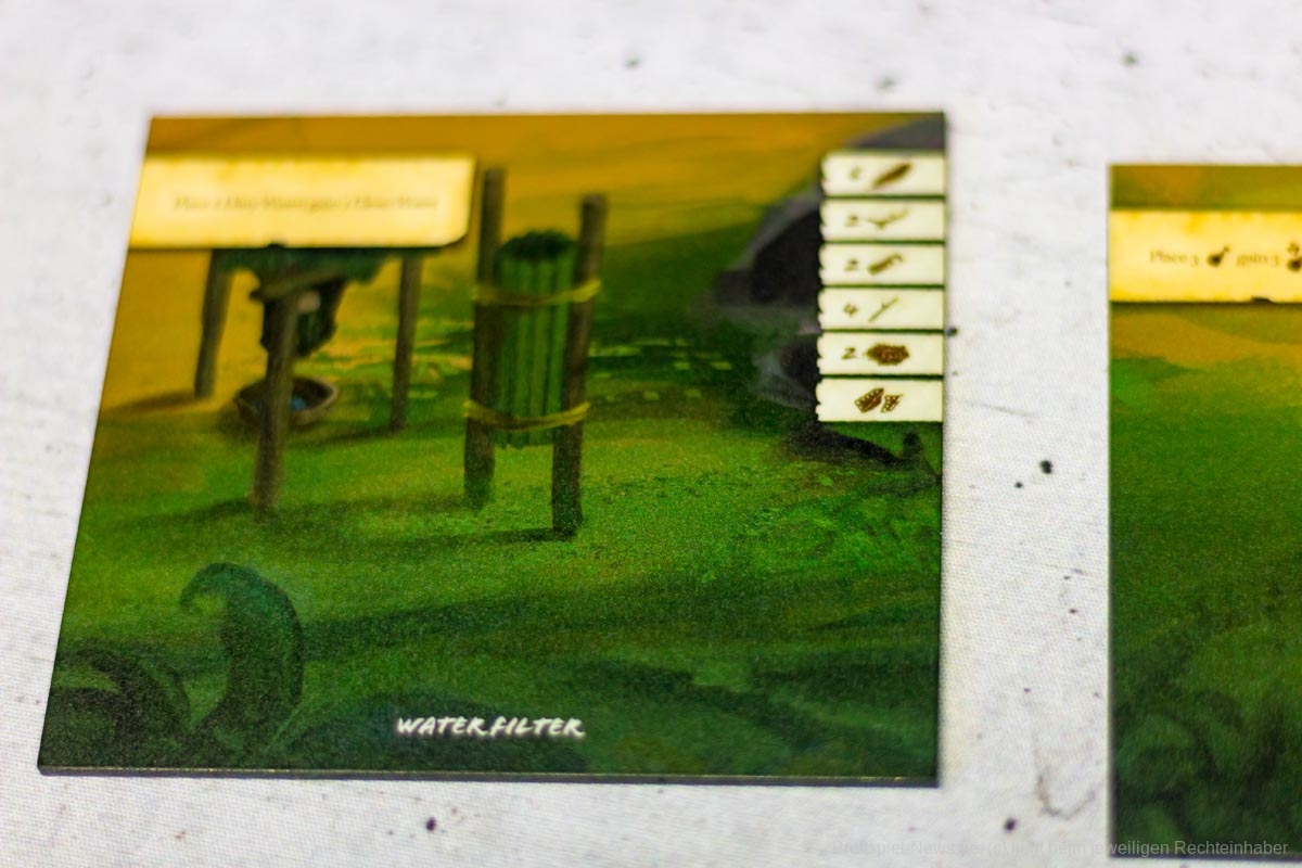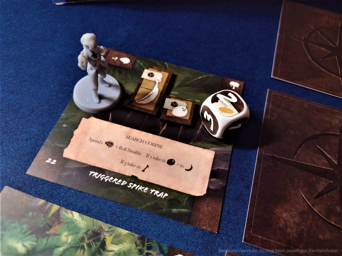 Die Materialqualität ist für einen Prototypen in Ordnung. Die Ressourcen-Token aus Plastik sind gut gemacht und haben eine tolle Haptik. Die Dschungelkarten und und der Campspielplan sind aus dünner und empfindlicher Pappe. Hier gibt es auf jeden Fall noch Steigerungspotential. Dazu muss noch gesagt werden, dass der enthaltene Würfelturm wohl das hässlichste Stück Plastik ist, das ich je gesehen habe. Das Design wurde in der Kickstarter-Kampagne glücklicherweise angepasst.