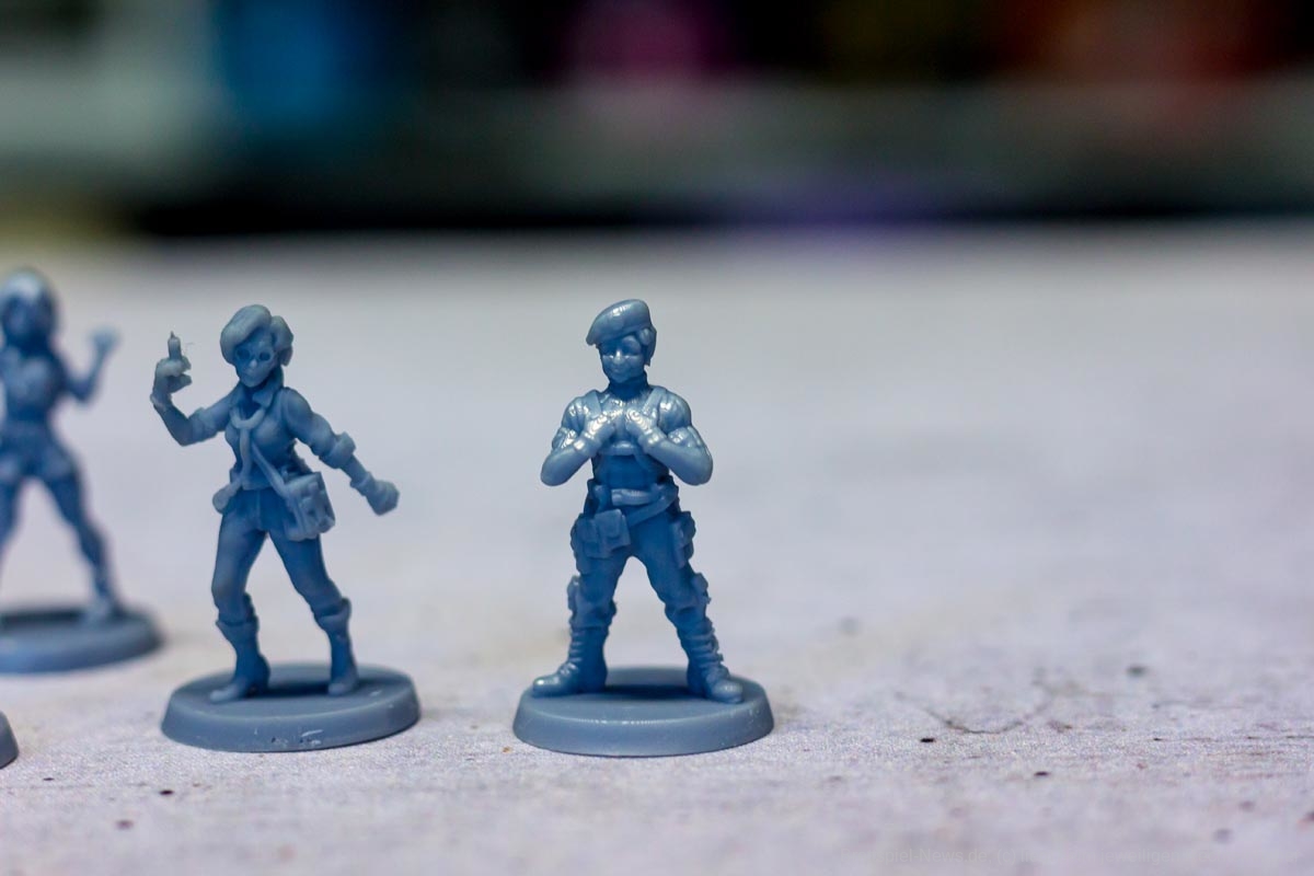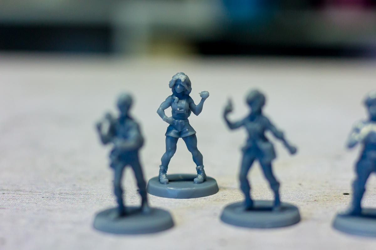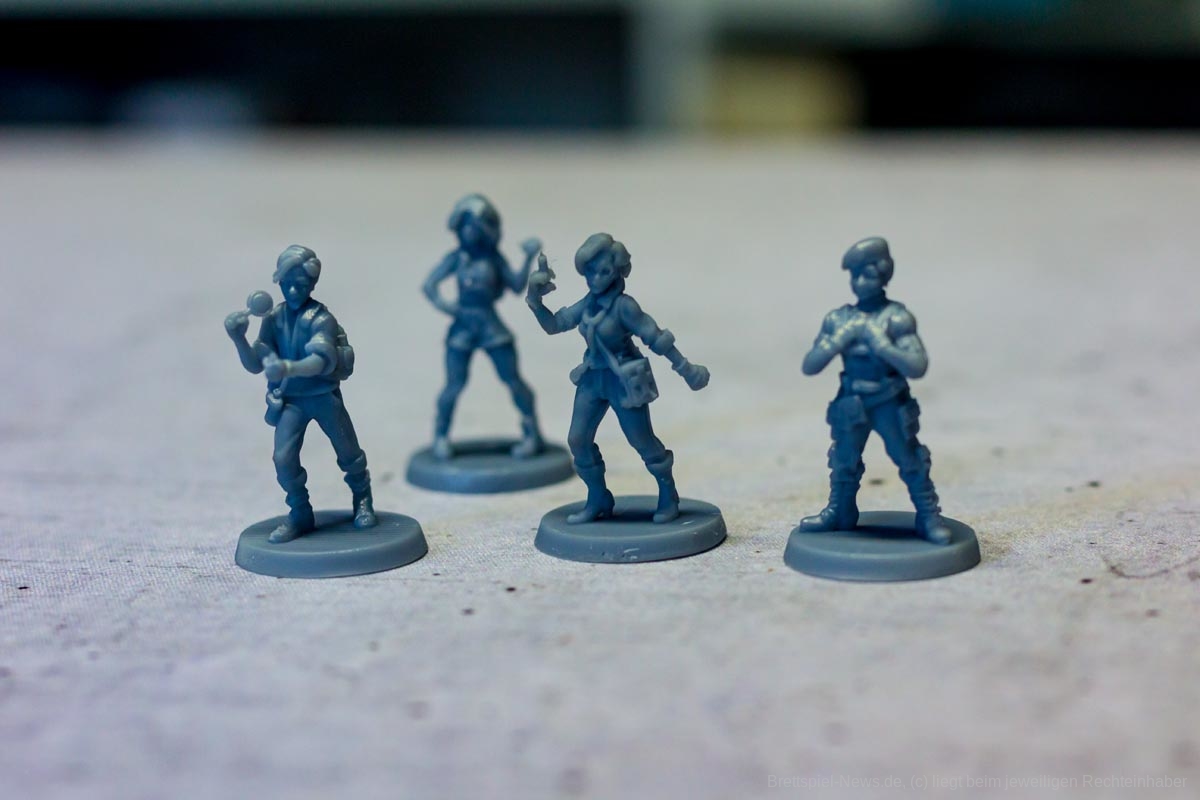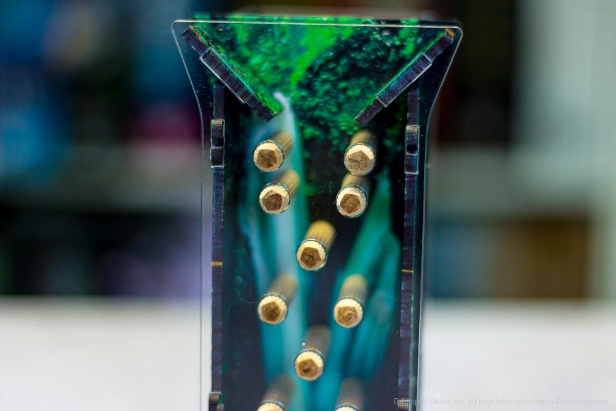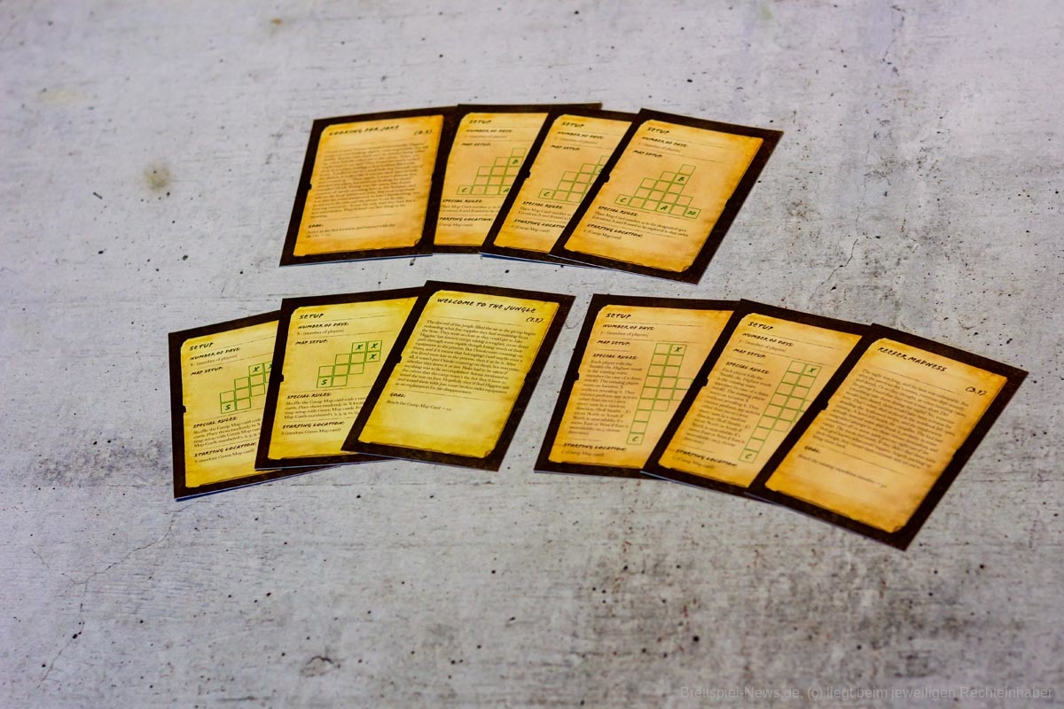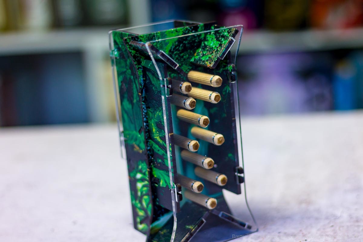 Die Materialqualität ist für einen Prototypen in Ordnung. Die Ressourcen-Token aus Plastik sind gut gemacht und haben eine tolle Haptik. Die Dschungelkarten und und der Campspielplan sind aus dünner und empfindlicher Pappe. Hier gibt es auf jeden Fall noch Steigerungspotential. Dazu muss noch gesagt werden, dass der enthaltene Würfelturm wohl das hässlichste Stück Plastik ist, das ich je gesehen habe. Das Design wurde in der Kickstarter-Kampagne glücklicherweise angepasst.
