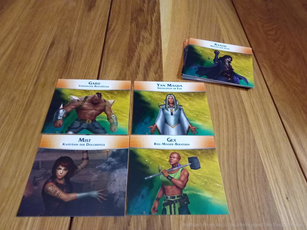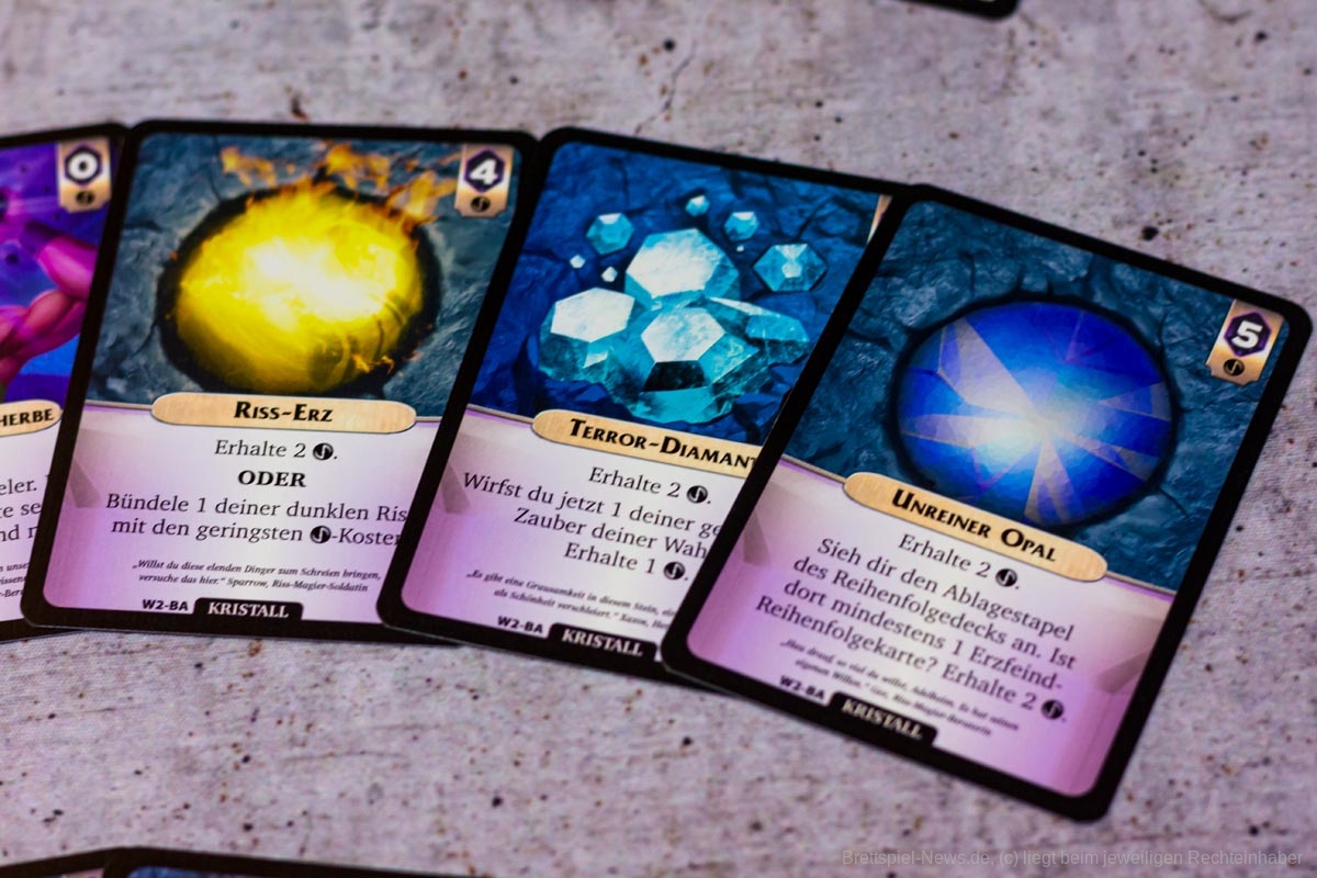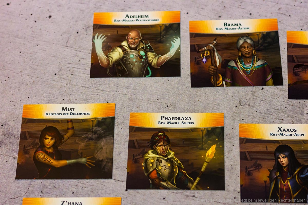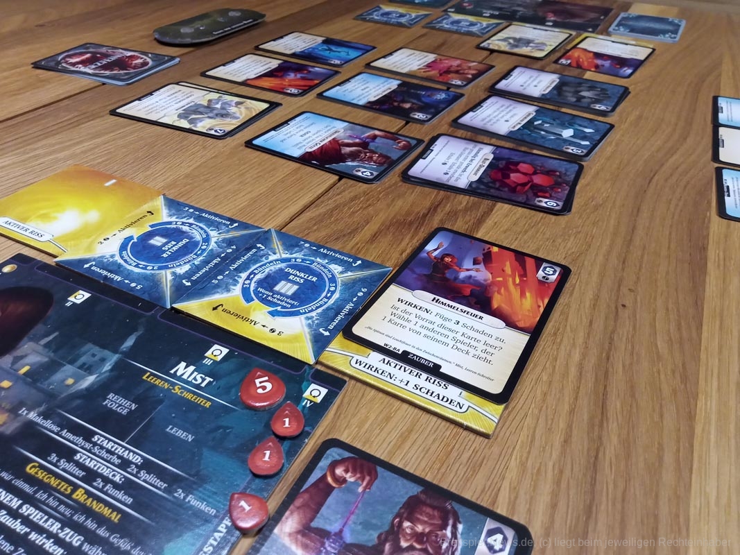 In der Spielebox befinden sich etliche Karten, die es vor der ersten Partie zu sortieren heißt. Nachdem die Decks der Riss-Magier und das Deck eines der vier Erzfeinde zusammengestellt sind, werden genre-typisch die Karten, die in dieser Partie gekauft werden können, nach dem Zufallsprinzip ermittelt und in der Tischmitte ausgelegt.