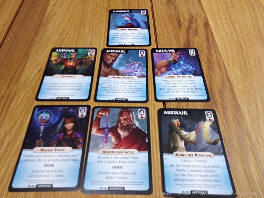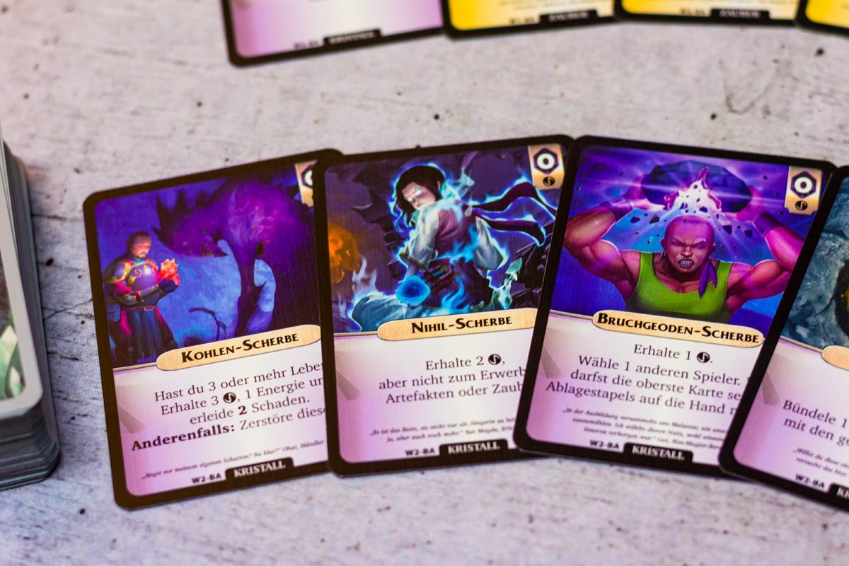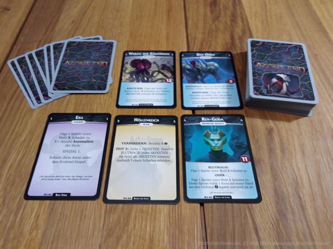 Der Deckbau steht hier, ähnlich wie bei Dominion oder Thunderstone, ganz klar im Fokus und gestattet nahezu keine weiteren Mechaniken neben sich. Hier fängt das Problem an. Schon Dominion war für uns nie mehr als ein Showcase für den damals neuartigen Deckbuilding-Mechanismus und aus heutiger Sicht nicht mehr wirklich zeitgemäß. „Aeons End“ verbessert diesen Mechanismus an vielen Stellen und sorgt mit der kooperativen Spielweise sowie dem Kampfmechanismus für ein moderneres Spielerlebnis. Und doch bleibt es im Kern „nur“ ein reiner Deckbuilder, der die Euphorie der vielen Fans und der Fachpresse nicht bis zu uns tragen kann.