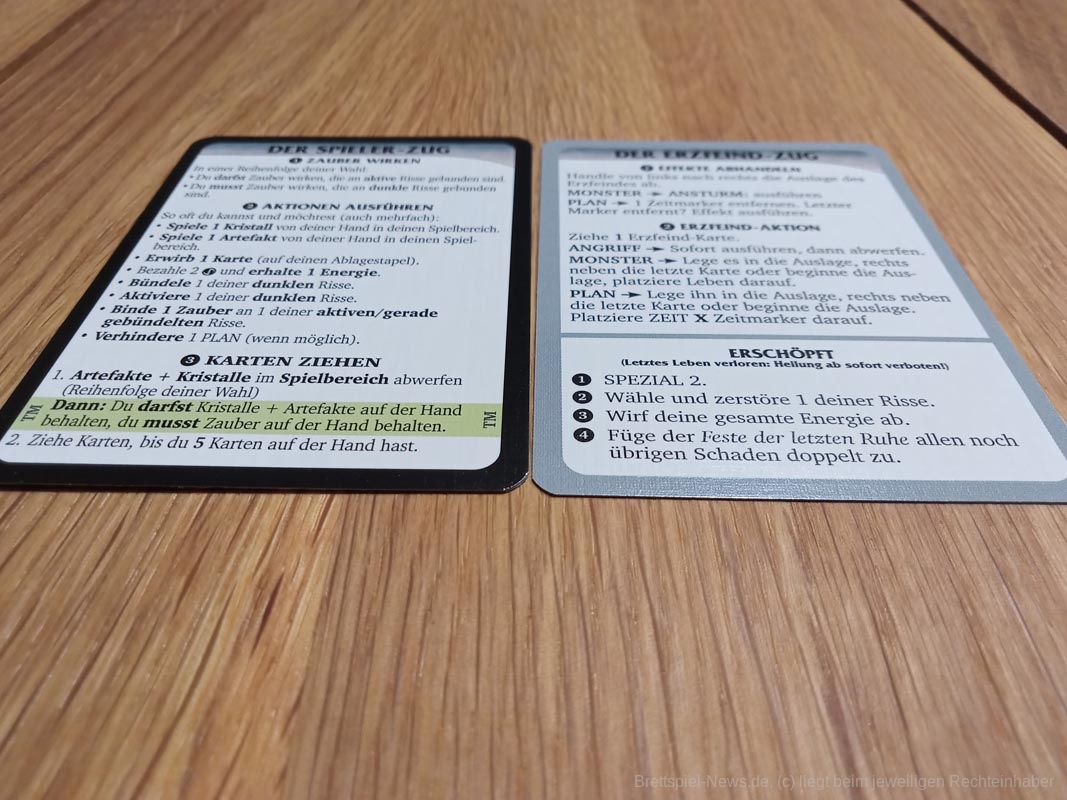 Das Reihenfolgekarten-Deck bestimmt nun, wer den kooperativen Kampf gegen den Erzfeind beginnen wird. Ist ein Riss-Magier an der Reihe, so kann dieser zu Beginn des Zuges einen oder mehrere ausgespielte Zauber von den - oberhalb des Spielertableaus ausliegenden - Rissen aktivieren. Anschließend besteht die Wahl aus einer Palette an Aktionsmöglichkeiten: Hier können dunkle (inaktive) Risse gebündelt (aktiviert), Zauber ausgespielt und neue Karten für das persönliche Deck erworben werden. Zudem kann Energie zur Aktivierung der Spezialfähigkeit des jeweiligen Riss-Magiers erhöht oder ein Plan des Erzfeindes vereitelt werden. Nachdem der aktive Riss-Magier beliebig viele mögliche Aktionen ausgeführt hat, wird zum Abschluss des Zuges die Kartenhand vervollständigt, indem auf fünf Karten aufgefüllt wird. Ist der persönliche Nachziehstapel erschöpft, wird der gebildete Ablagestapel in unveränderter Reihenfolge als neuer Nachziehstapel bereitgelegt.
