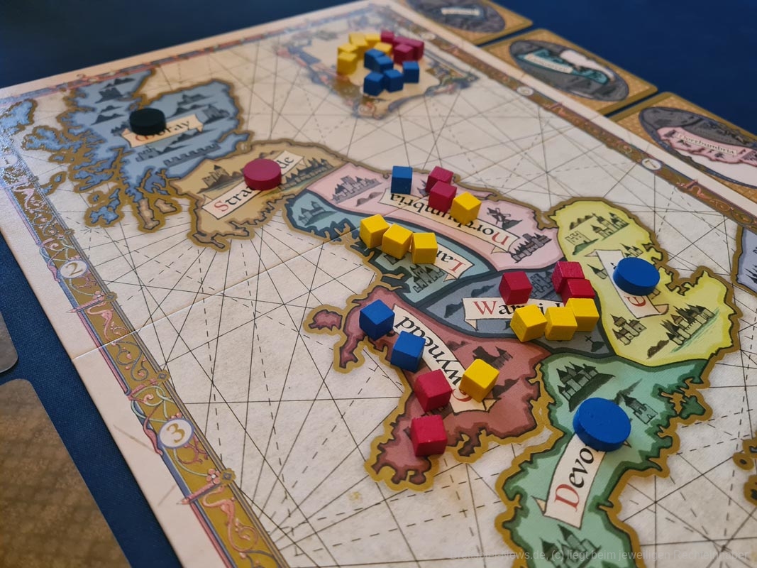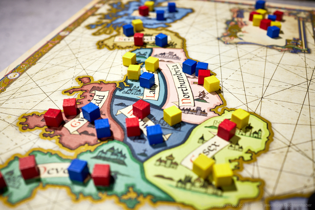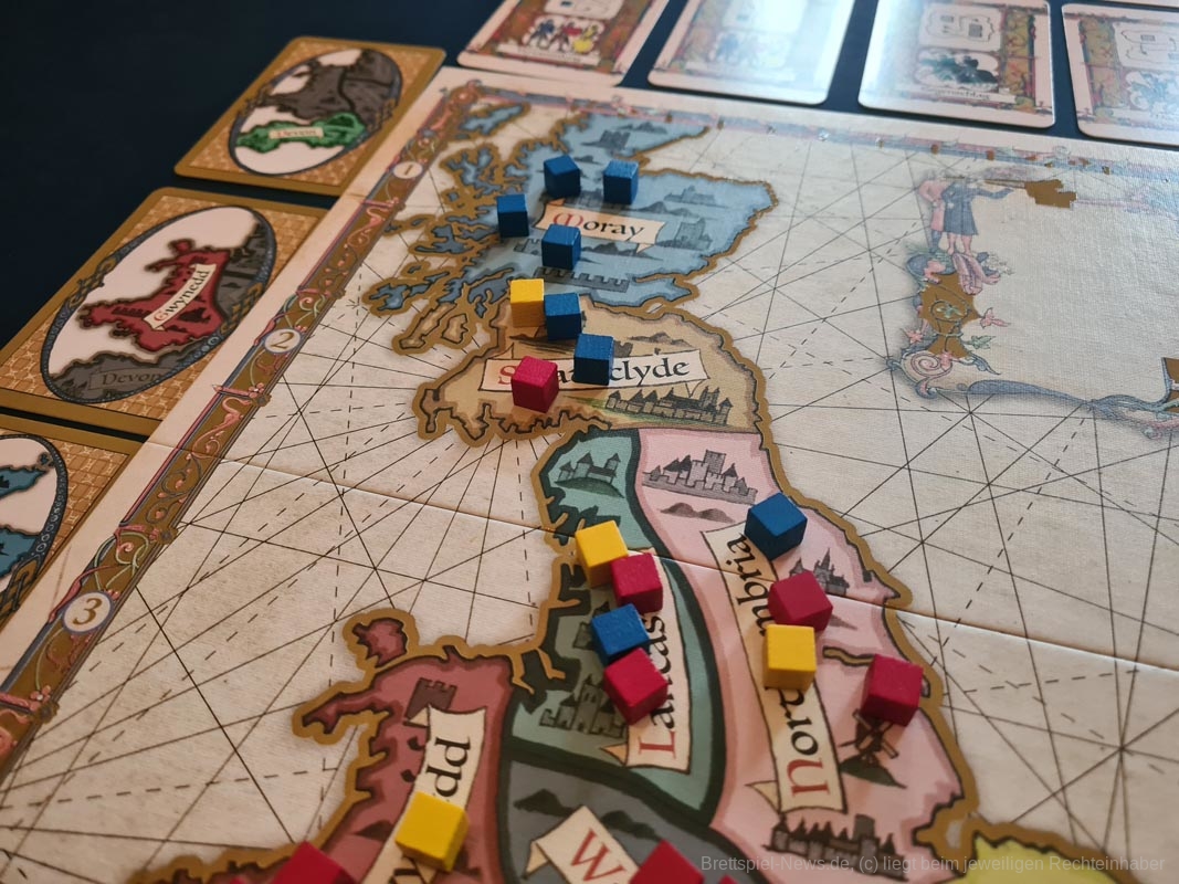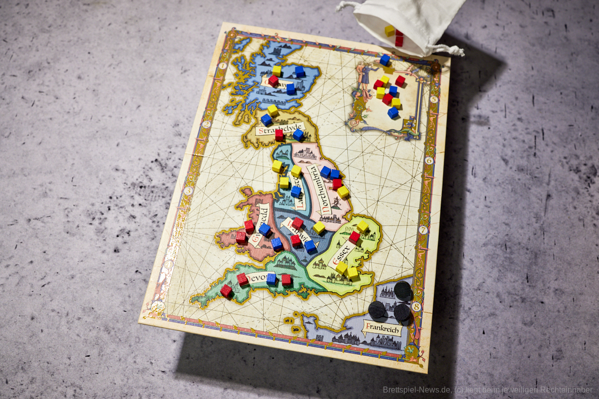 Schauen wir uns also die Siegbedingungen genauer an. Das Ziel jeder spielenden Person ist es, die meisten „Abgesandten“ derjenigen Fraktion am eigenen Hof zu haben, die am Ende des Spiels auch die meisten Gebiete beherrscht. Wurden zum Beispiel am Ende des Spiels viele Gebiete von den Walisern erobert, gewinnt die Person, die am meisten „Abgesandte“ der Waliser am eigenen Hof hat. Endet das Spiel jedoch vorzeitig durch die französische Invasion, gewinnt die Person, die die meisten Sets aus den drei Fraktionen besitzt (ein Set besteht immer aus einem Holzwürfel jeder Farbe).
