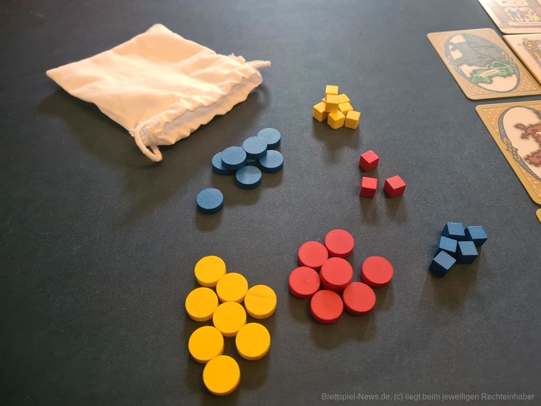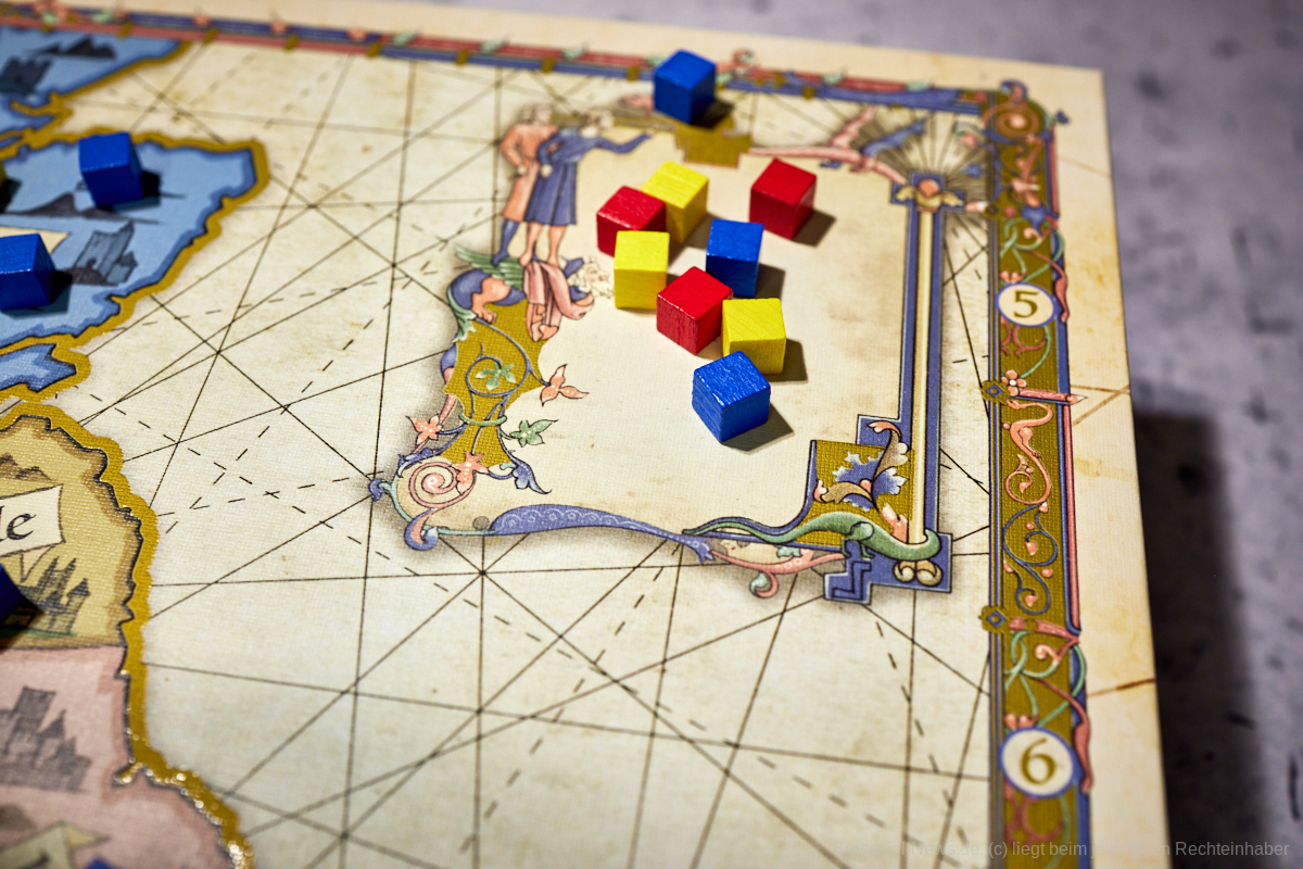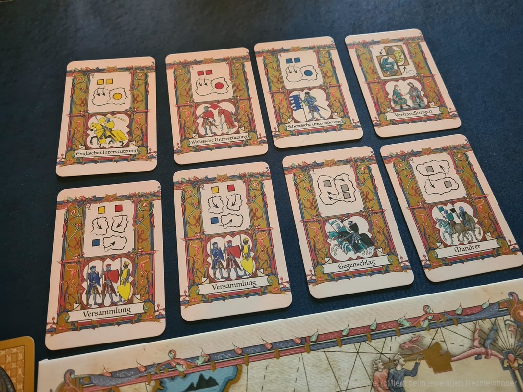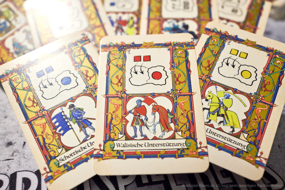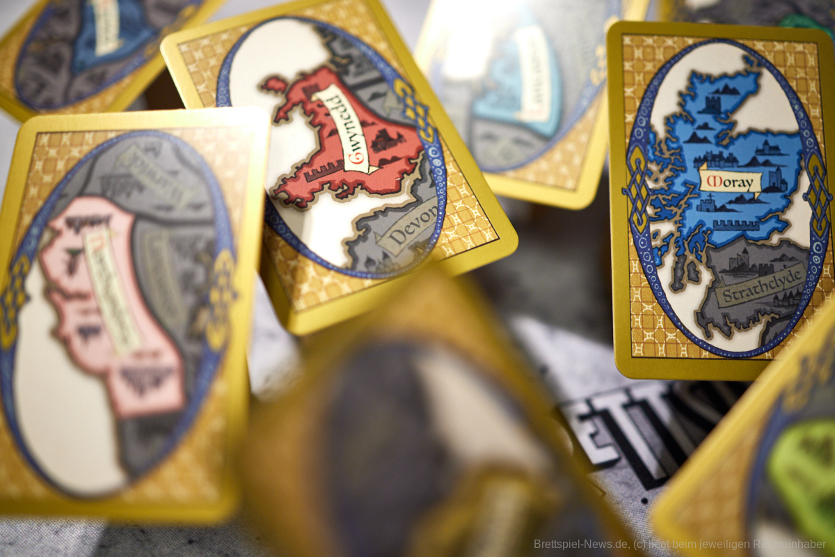 Schauen wir uns also die Siegbedingungen genauer an. Das Ziel jeder spielenden Person ist es, die meisten „Abgesandten“ derjenigen Fraktion am eigenen Hof zu haben, die am Ende des Spiels auch die meisten Gebiete beherrscht. Wurden zum Beispiel am Ende des Spiels viele Gebiete von den Walisern erobert, gewinnt die Person, die am meisten „Abgesandte“ der Waliser am eigenen Hof hat. Endet das Spiel jedoch vorzeitig durch die französische Invasion, gewinnt die Person, die die meisten Sets aus den drei Fraktionen besitzt (ein Set besteht immer aus einem Holzwürfel jeder Farbe).