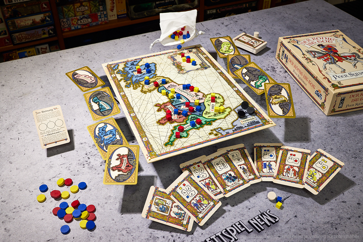 In „Der König ist tot“ müsst ihr versuchen, die Machtstrukturen eines ganzen Königreiches so zu manipulieren, dass ihr euch selbst auf den Thron setzen könnt. Anders als bei anderen Spielen dieser Art werden die spielenden Personen nicht selbst durch Spielfiguren auf dem Spielfeld dargestellt. Die allgemeinen Spielfiguren werden ausschließlich durch das Ausspielen von Handkarten beeinflusst, die das Herzstück des Spiels sind. Je nach gewählter Spielvariante erhalten alle Personen entweder acht identische Karten oder tauschen festgeschriebene Karten durch spezielle Karten aus, die einen einzigartigen Effekt beinhalten. Auf den verschiedenen Territorien des Spielfelds befinden sich (zu Beginn durch zufällige Ziehung ermittelt) unterschiedliche farbige Holzwürfel, die die drei Fraktionen Schotten, Waliser und Engländer darstellen. Die Handkarten beeinflussen die Positionen der Holzwürfel, durch das Bewegen der Würfel können so für bestimmte Farben die Mehrheiten in den einzelnen Territorien auf dem Spielbrett gezielt verändert werden.