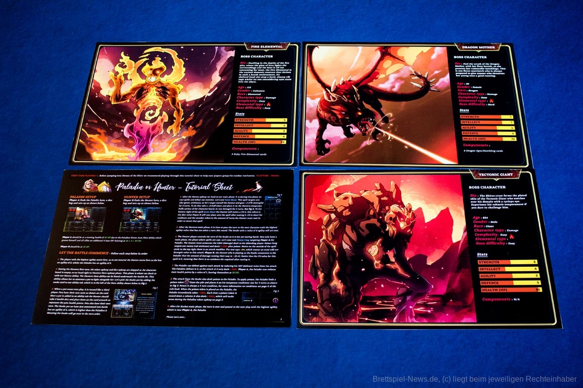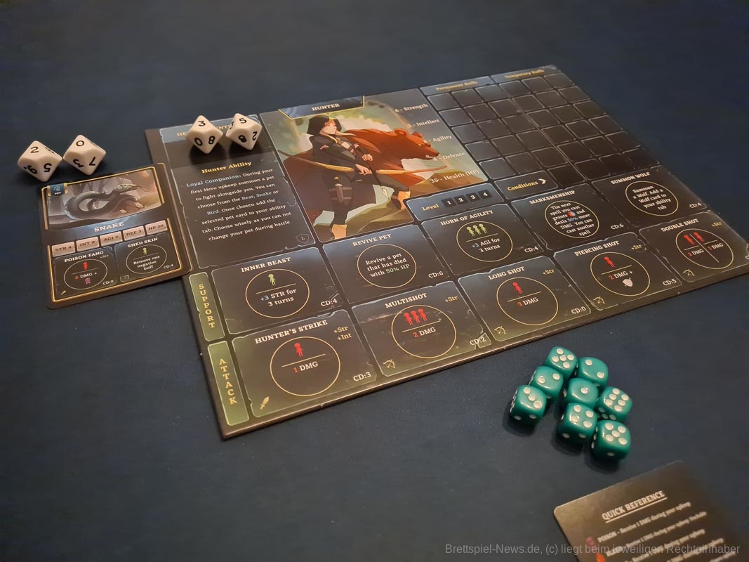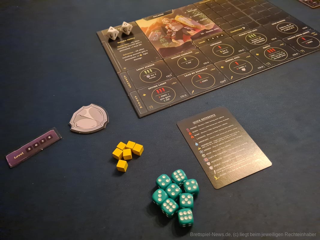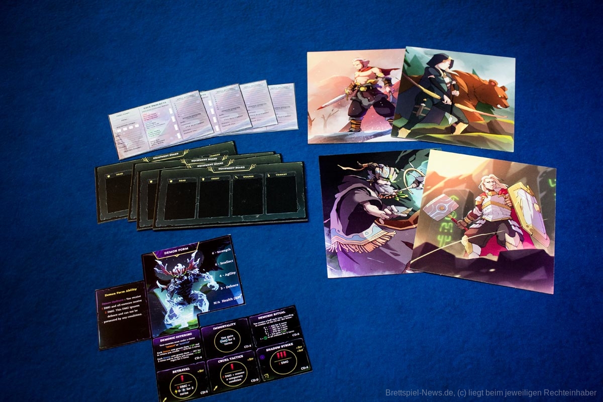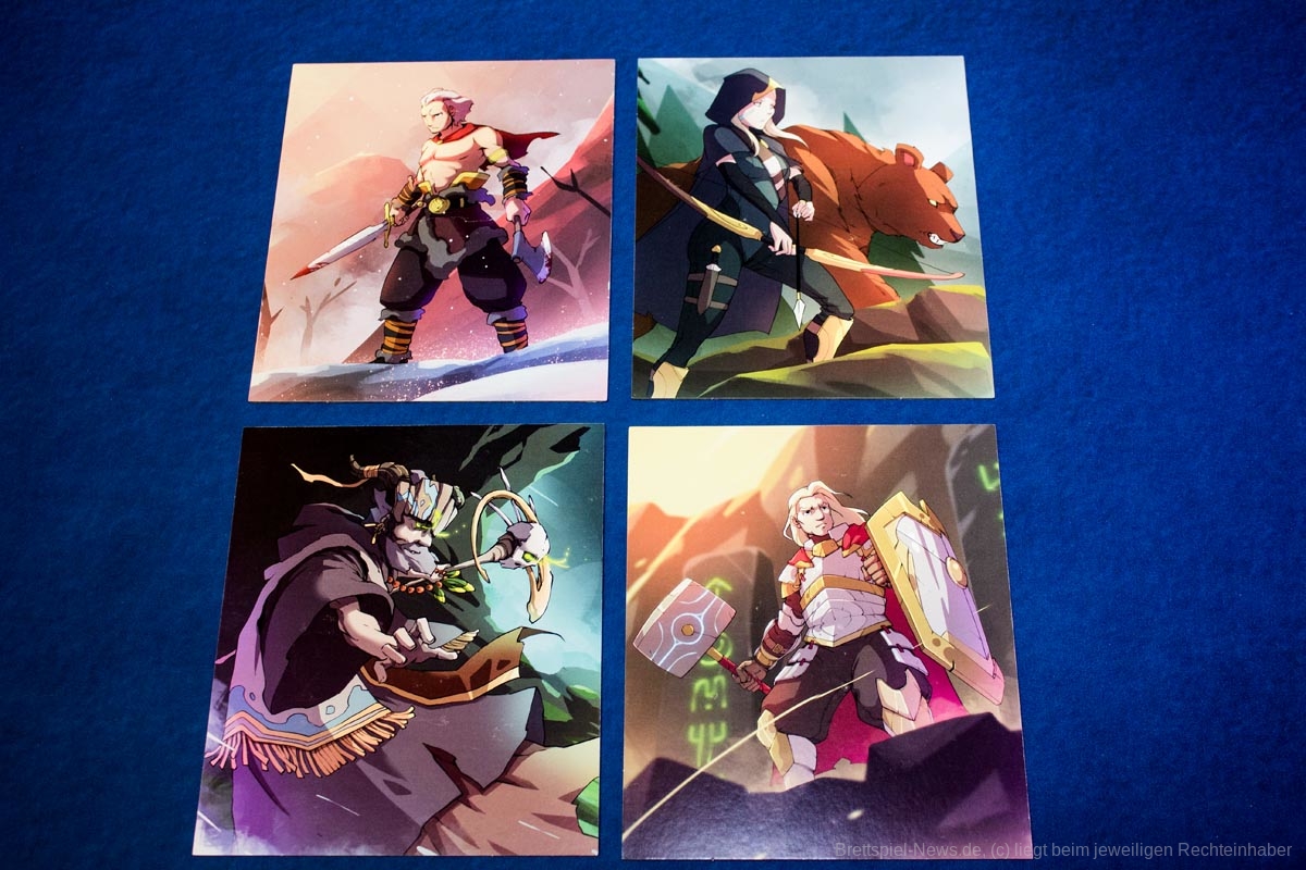 Was schlussendlich in der finalen Spielschachtel an Spielmaterial landen wird, kann uns nur der Ausgang des Kickstarters verraten. Figuren aus Kunststoff sind derweil nicht geplant, da die Helden mit Aufstellern dargestellt werden. Der Zeichenstil des Spiels ist sehr angenehm und erinnert an einige Indi-Videospiele oder alte „The Legend of Zelda“- Illustrationen, was einen nostalgischen Eindruck bei mir hinterließ.