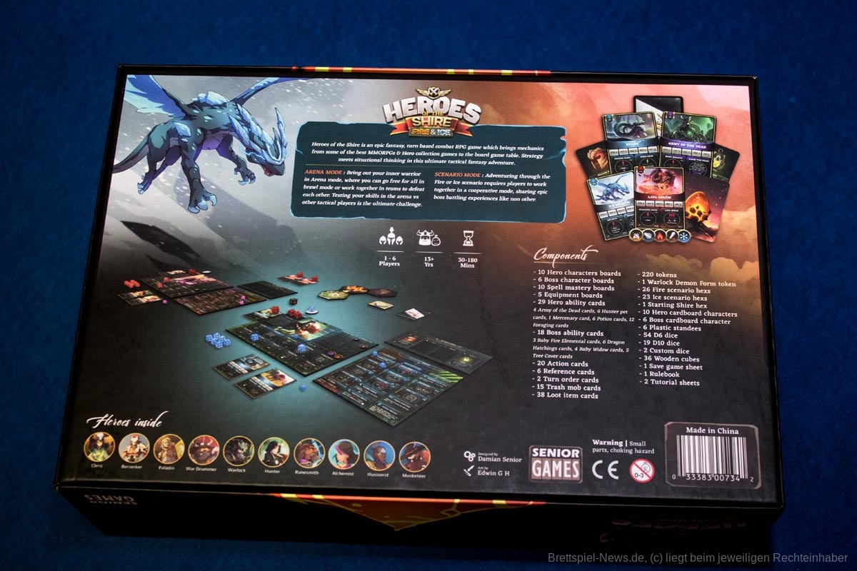 Um das volle Erlebnis, also alle 20 Helden und alle 4 Szenarien erleben zu können, bedarf es beider Versionen von „Heroes of the Shire“. Das Spiel ist (wie es zum Beispiel das Videospiel „Pokemon“ schon immer gemacht hat) in zwei Farbkombinationen unterteilt. Die Namen „Feuer & Eis“ und „Erde & Wasser“ geben an, welche Szenarien gespielt und Bosse bekämpft werden können. Jede Box enthält zusätzlich 10 einzigartige Helden, die jeweils individuelle Stärken und Schwächen mit sich bringen.