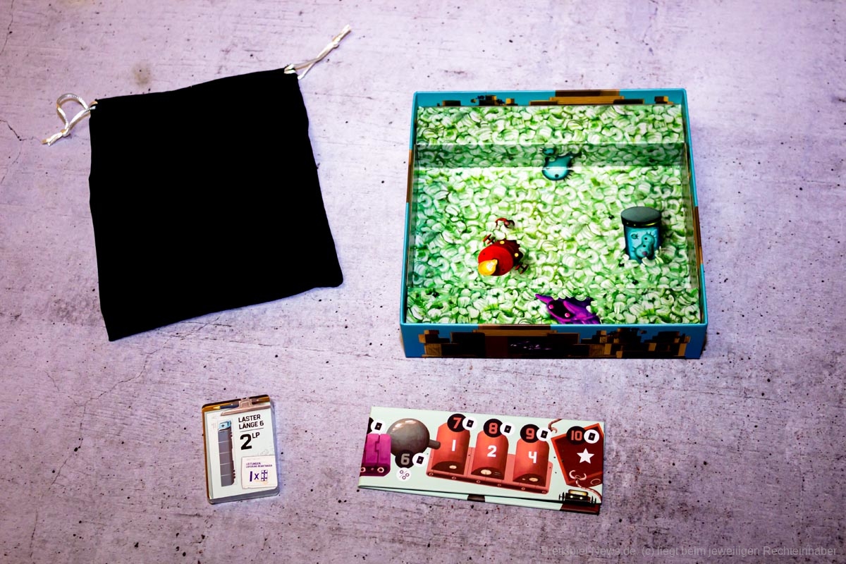 Das Material ist von guter Qualität, wobei die Güter Fingerspitzengefühl benötigen, glücklicherweise jedoch nicht zu viel bewegt werden müssen. Die Illustration ist passend, wobei insbesondere die kleinen Batterien gelungen sind. Die Spielschachtel hätte etwas größer sein dürfen, da beim Einräumen gepuzzelt werden muss, damit auch der Beutel mit Legeplättchen darin untergebracht werden kann. Das Thema und die Mechaniken sind sehr stimmig, auch wenn ich das seltsam wabbelig-grüne aus der Einleitung bis heute suche.