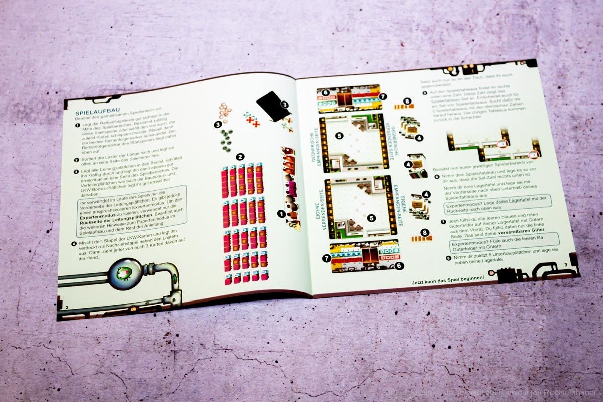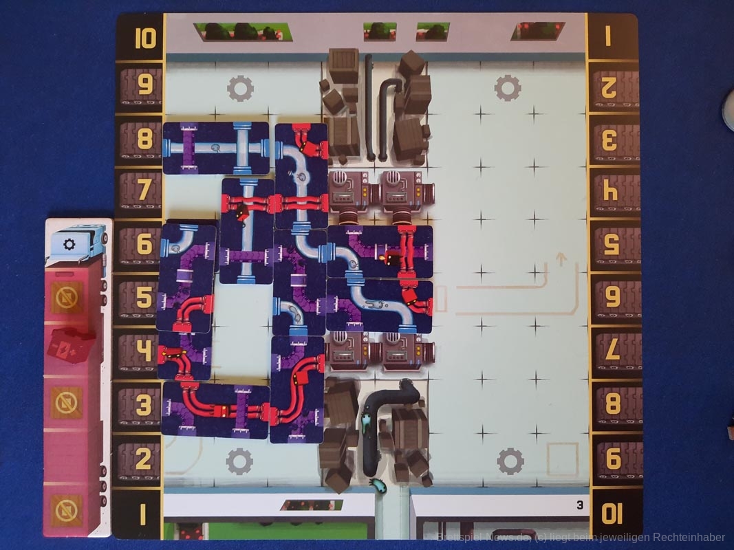 Sowohl die Variante mit zwei als auch drei Leitungsfarben funktioniert gut. Bei drei Farben wird in der Anleitung von der Expertenvariante gesprochen, vereinfacht jedoch das Beladen mehrere Güter nebeneinander auf einen LKW. Die Endbedingungen können im Spiel alle eintreten und in die taktischen Entscheidungen mit einbezogen werden, wobei es bei zwei Farben leichter ist einen Stern zu erlangen und bei drei Farben das Spiel über versendete Güter zu beenden. Durch die gleiche Größe der Leitungsplättchen, die Möglichkeit diese zu überbauen und den eigenen Spielplan ist das Spiel schön knackig. Es fühlt sich nicht wie die typischen Plättchenlegespiele mit Puzzlecharakter an, was mir gut gefällt. Einen Glücksfaktor gibt es zwar durch die LKW-Karten und Legeplättchen, welcher durch die Tauschoption in der zweiten Phase allerdings verringert werden kann. Folglich sollte nicht auf das richtige Plättchen gehofft werden.