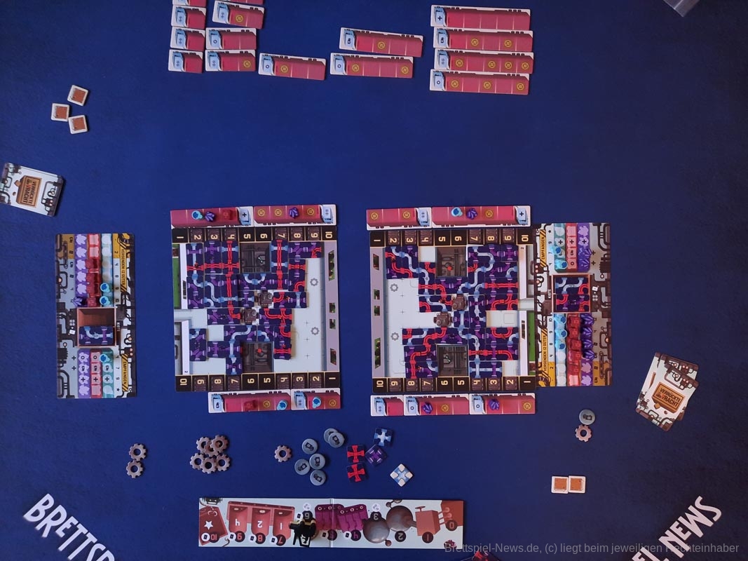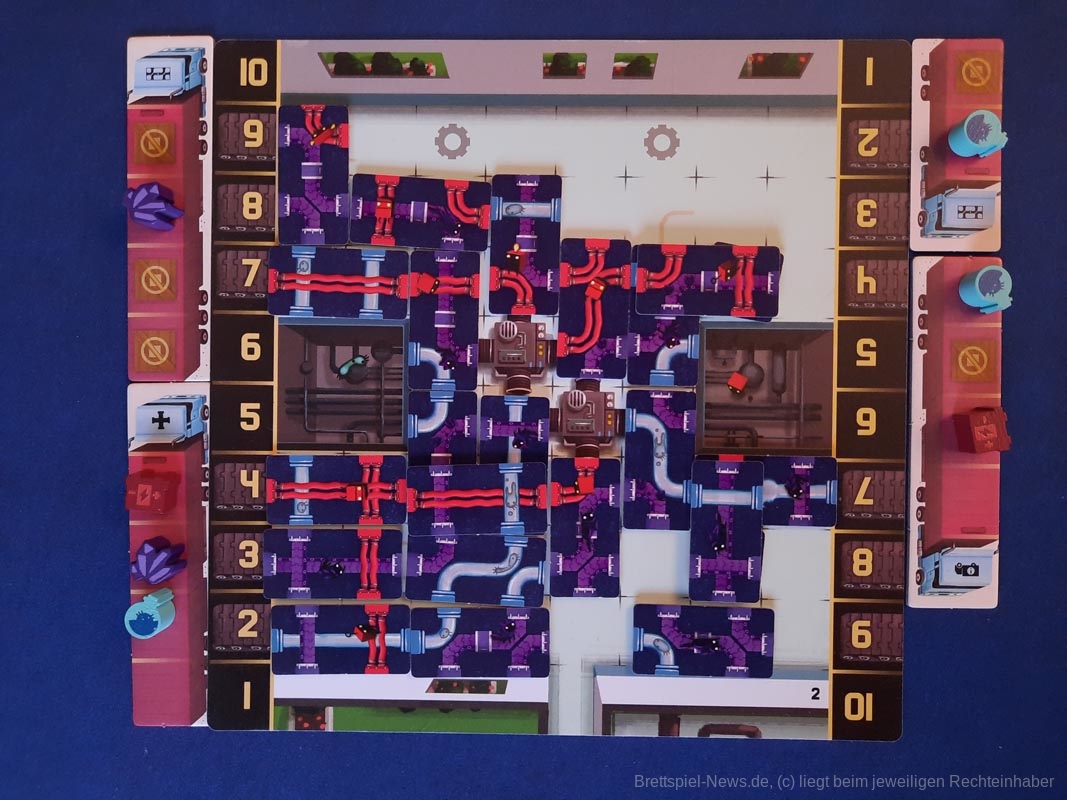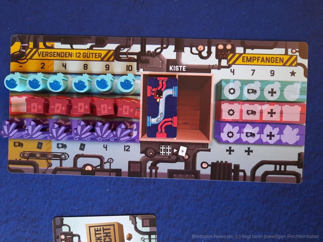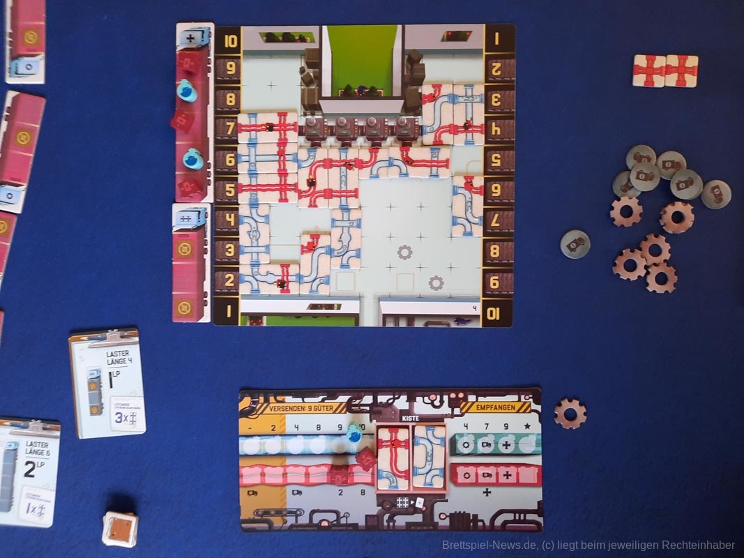 „Verrückte Fracht“ ist gar nicht so verrückt, auch wenn die verlegten Leitungen durchaus chaotisch aussehen. Im Gegenteil, es ist ein Spiel bei dem durchaus viel nachgedacht werden darf – viel Hirnzwirblerpotential. Durch die Möglichkeit des simultanen Spiels in der ersten Phase und einer kurzen zweiten Phase bleibt die Wartezeit verhältnismäßig gering und kann teilweise genutzt werden, um die eigene Taktik weiter zu planen oder sich das Leitungssystem der gegnerischen Person anzuschauen. Dieses sollte nicht vernachlässigt werden. Güter, die von der gegnerischen Person auf LKWs geladen werden, sollten nach Möglichkeit entladen werden, um Punkte und Bonusplättchen zu sammeln. Hierdurch entsteht einige Interaktion, denn LKWs können ebenfalls bei dem Gegner ausgespielt werden, um unter Umständen das Beladen zu verhindern, wenn dieses taktisch sinnvoll ist.