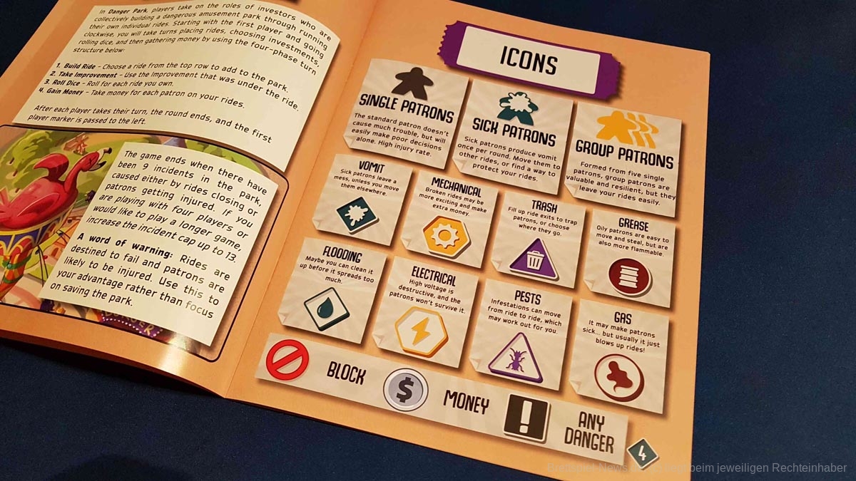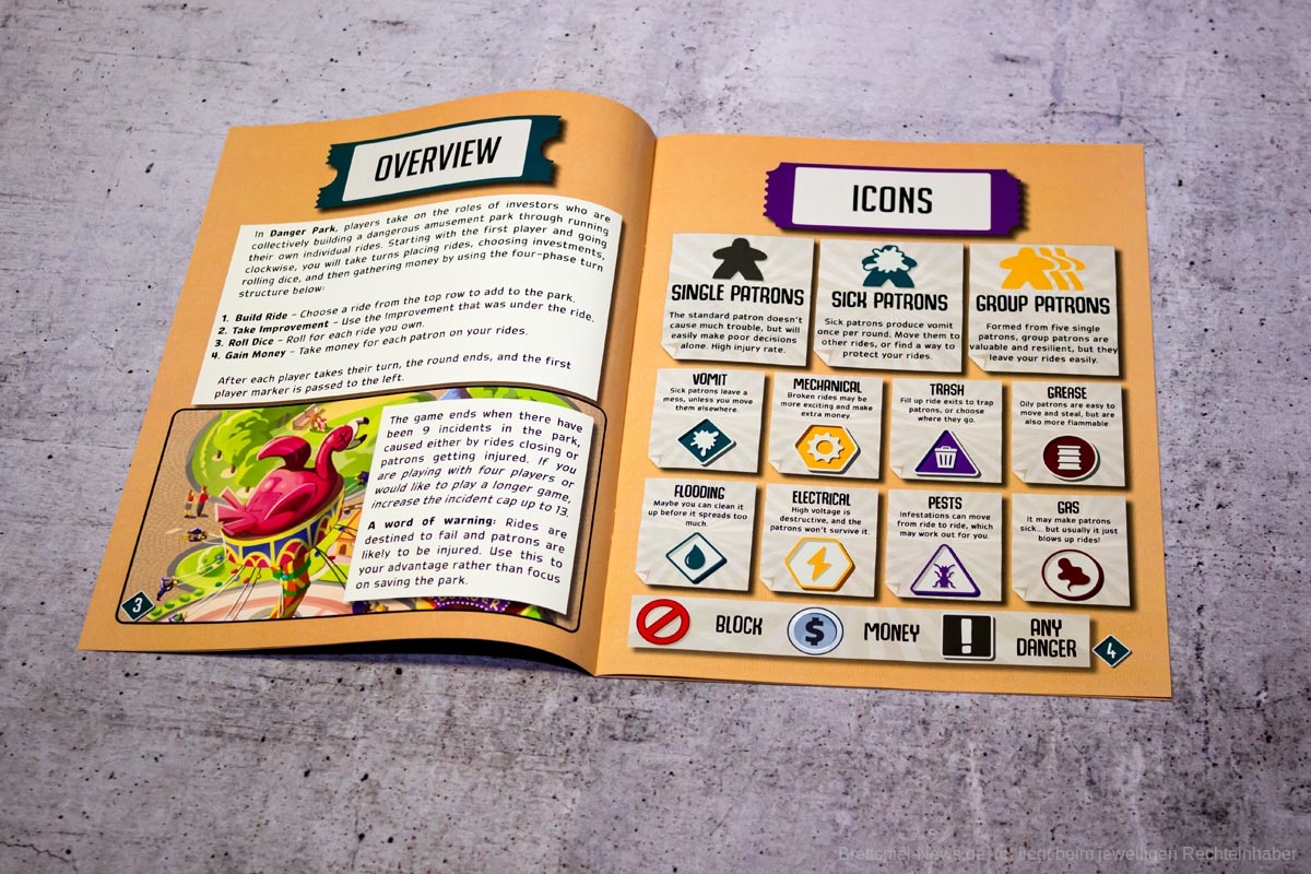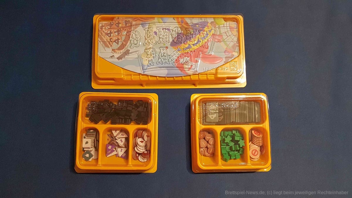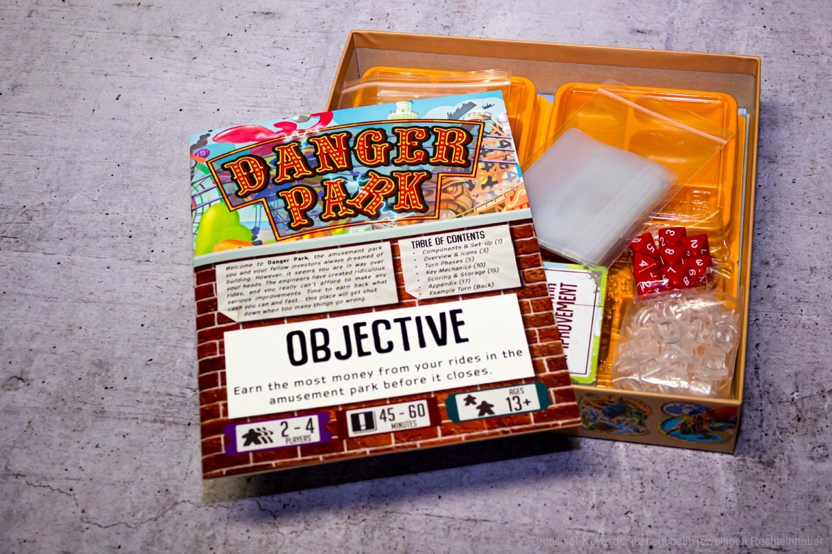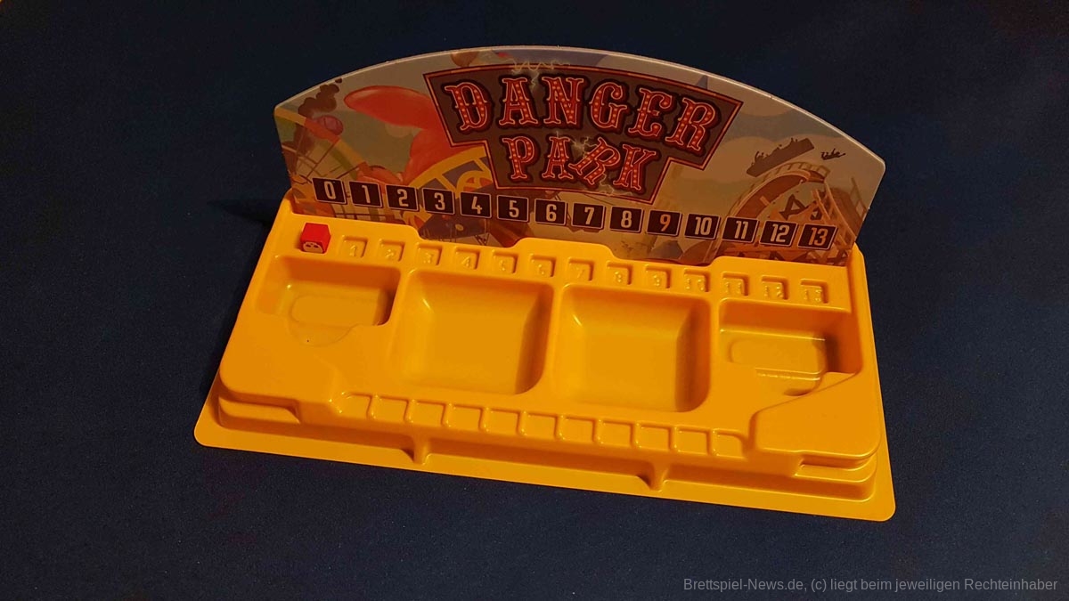 Wird der Freizeitpark das aller erste Mal betreten, fällt schnell auf, dass das Spiel über Kickstarter finanziert wurde. Es glänzt mit hochwertig produziertem Spielmaterial in einer Box aus dickem Karton. Die reichhaltigen Illustrationen sowie die urkomischen Flavour-Texte lassen einen direkt in die verrückte Spielewelt eintauchen. Des Weiteren verfügt „Danger Park“ über mehrere Gametrayz, in denen die zahlreichen Marker ordentlich verstaut werden können. Dies beschleunigt den Spielaufbau merklich. Einzig und allein die Anleitung ist an manchen Stellen zunächst etwas unklar und die teils kleinteiligen Regeln sind Neulingen nicht immer einfach zu vermitteln.